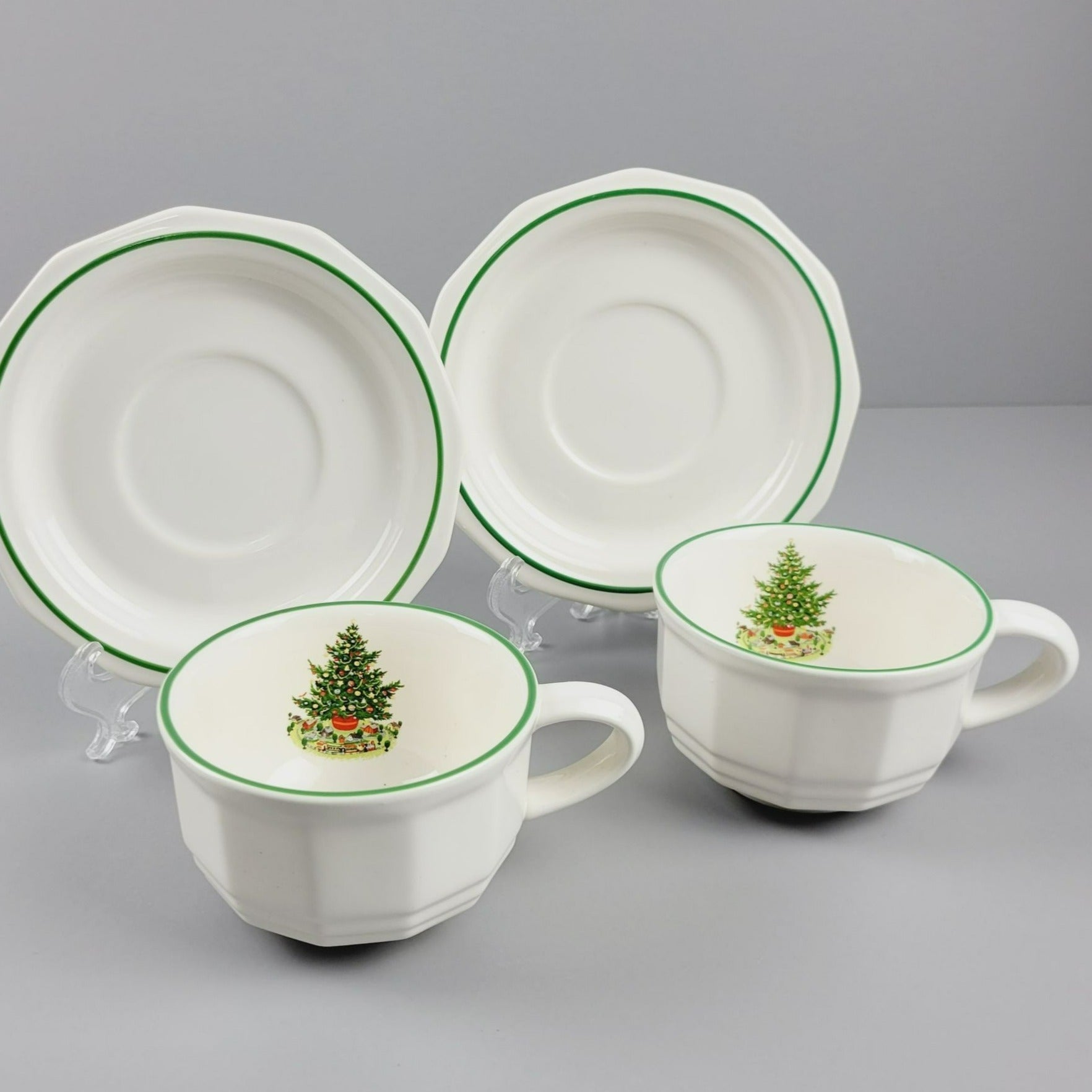 These vintage Pfaltzgraff cup & saucer sets embody the charm of yesteryears with the festive Christmas tree and train motif. The green rim adds a classic touch, making it a delightful addition to holiday gatherings. The sturdy stoneware build ensures durability.