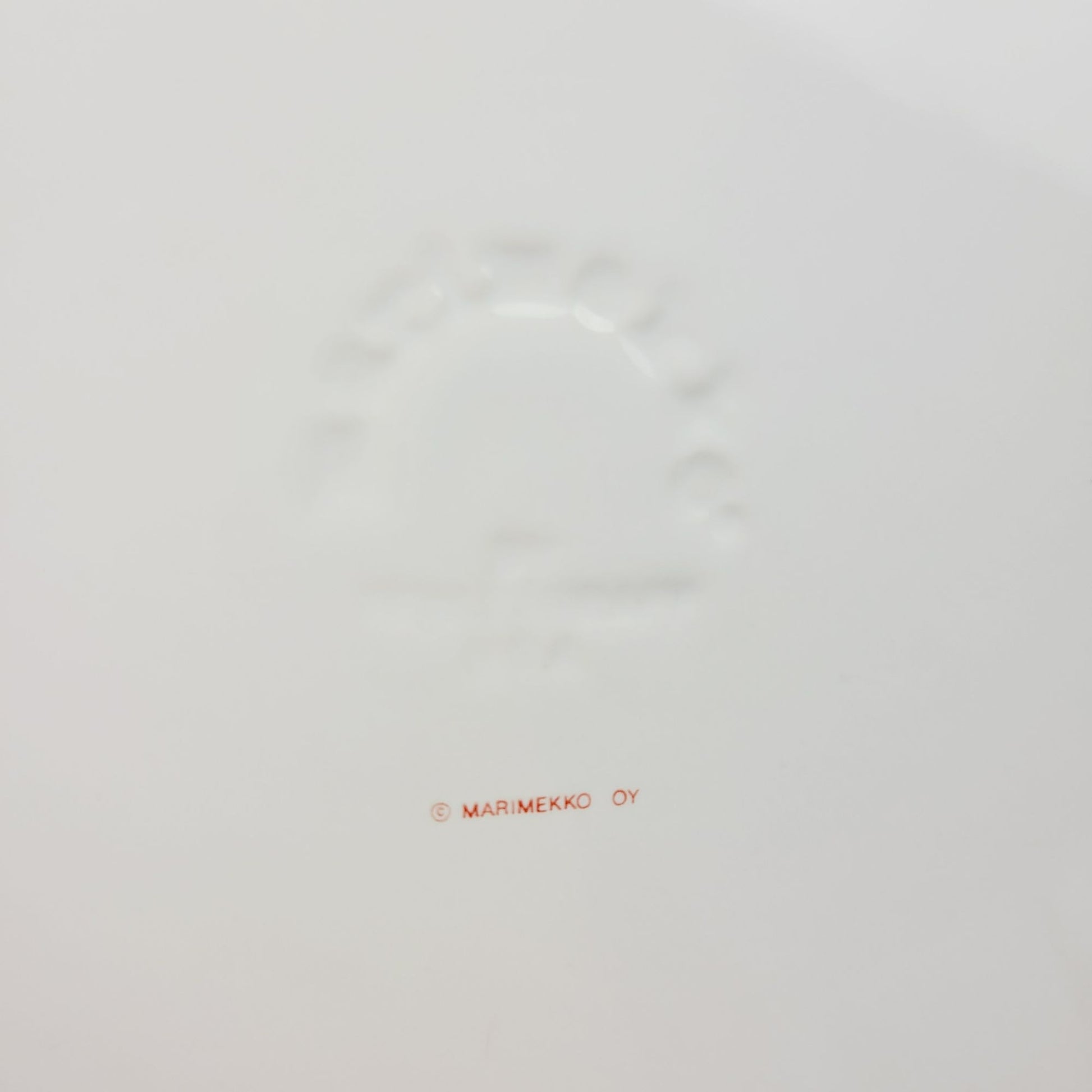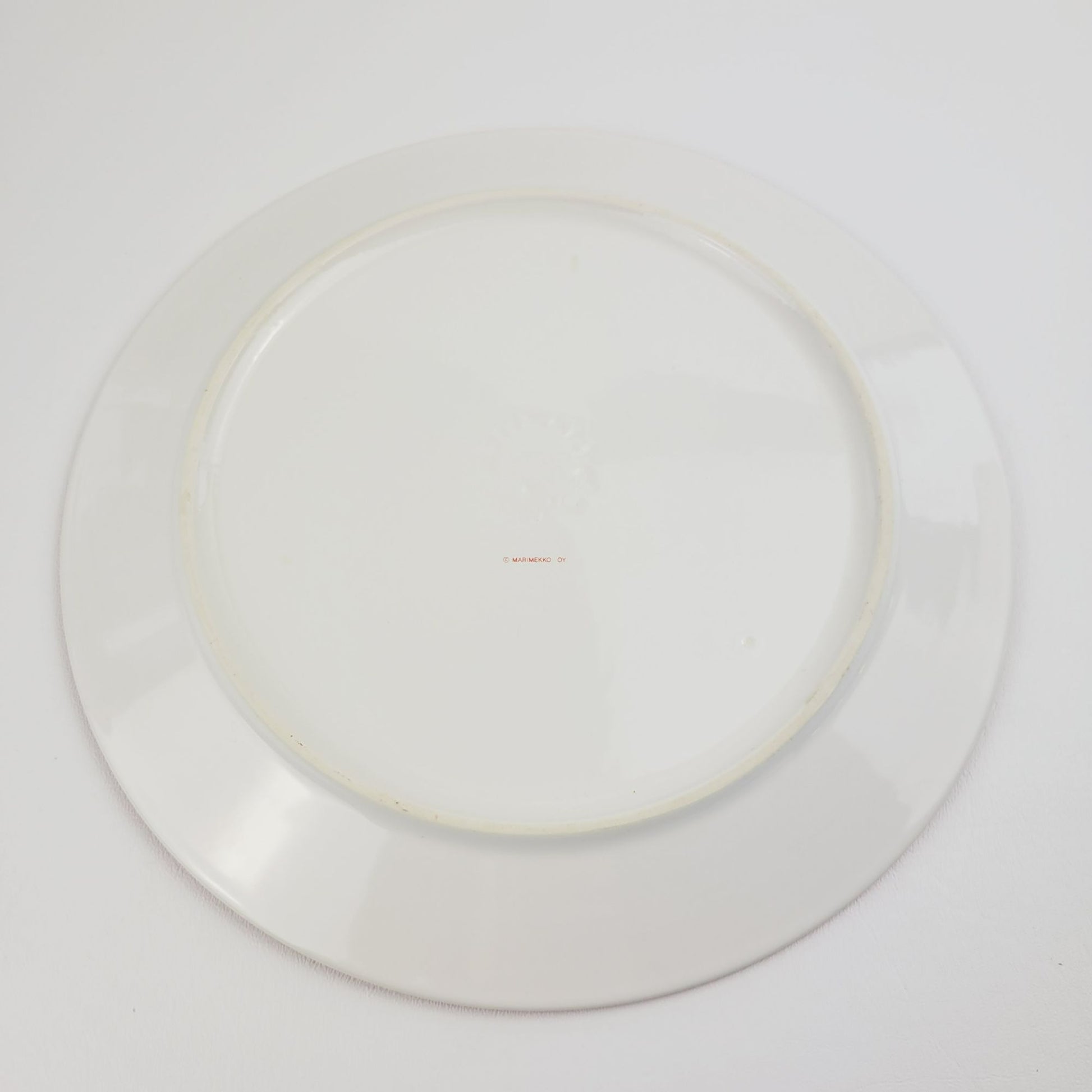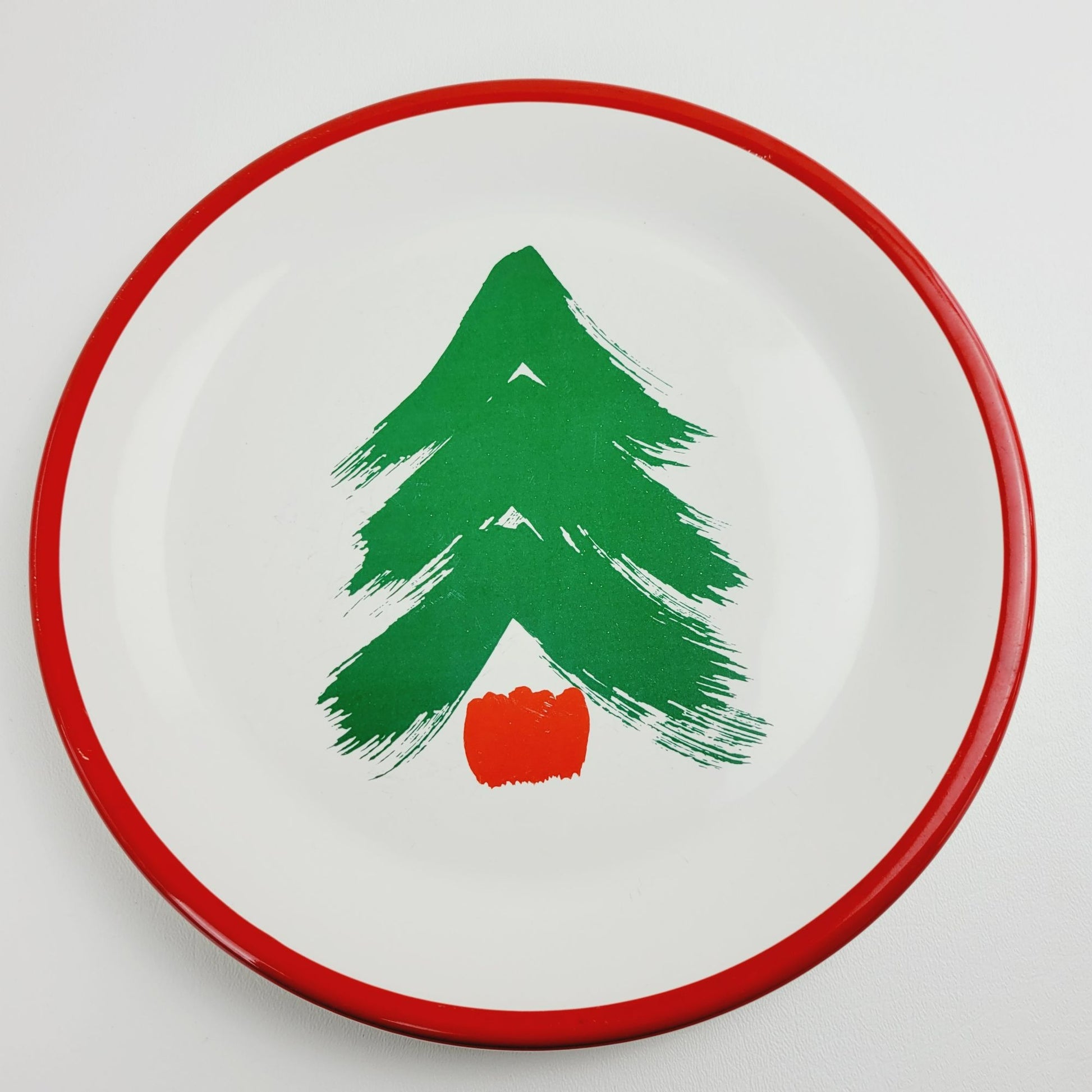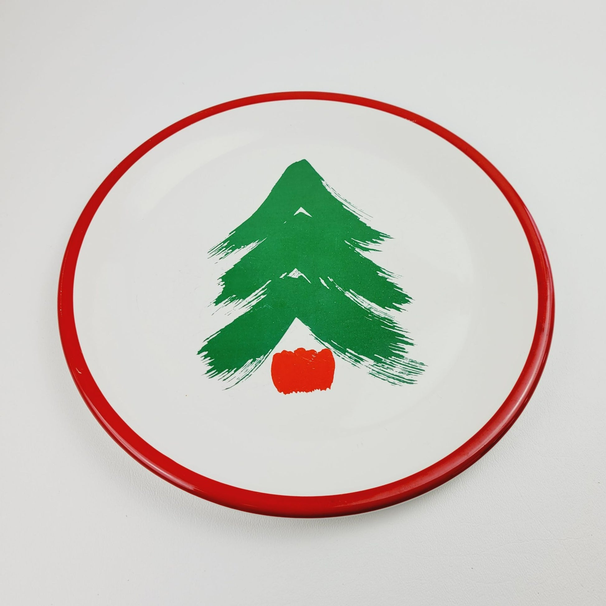 This Pfaltzgraff Marimekko Christmas Tree Dinner Plate, discontinued from the 1970s-80s, features a vibrant red band and a Christmas tree center. The Finland-style design adds a splash of festivity to your table.