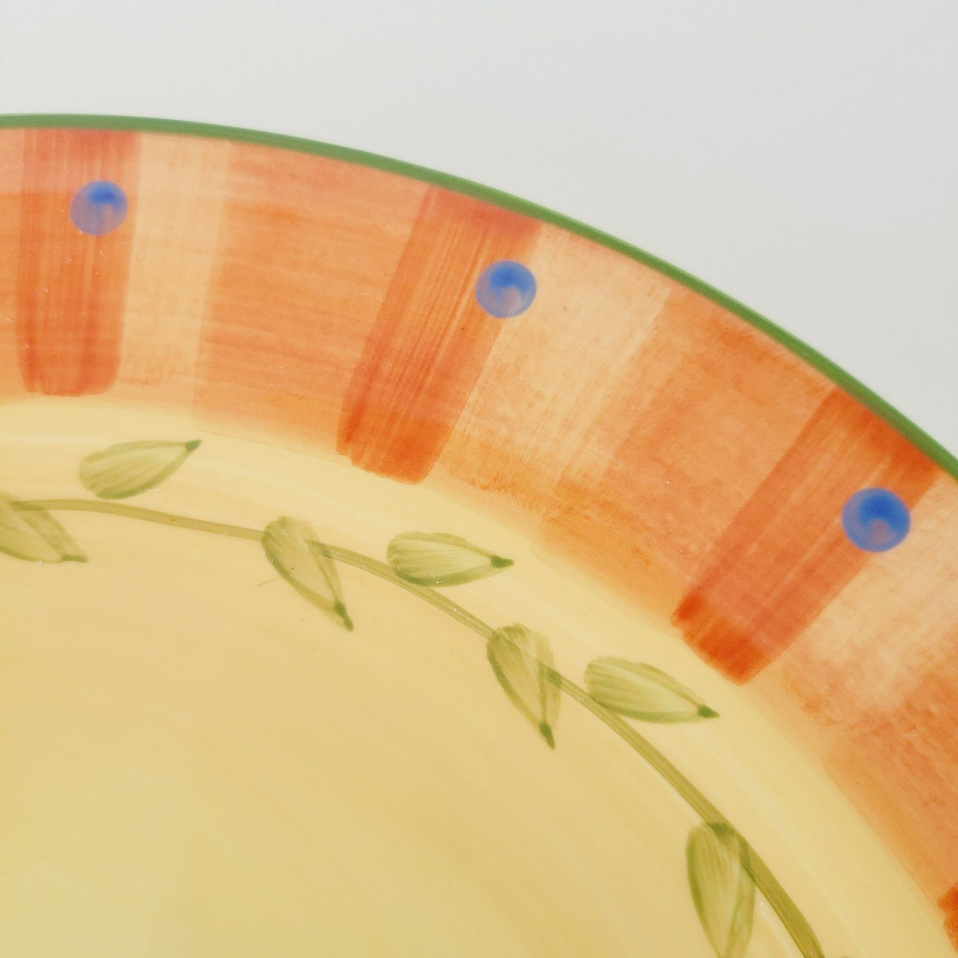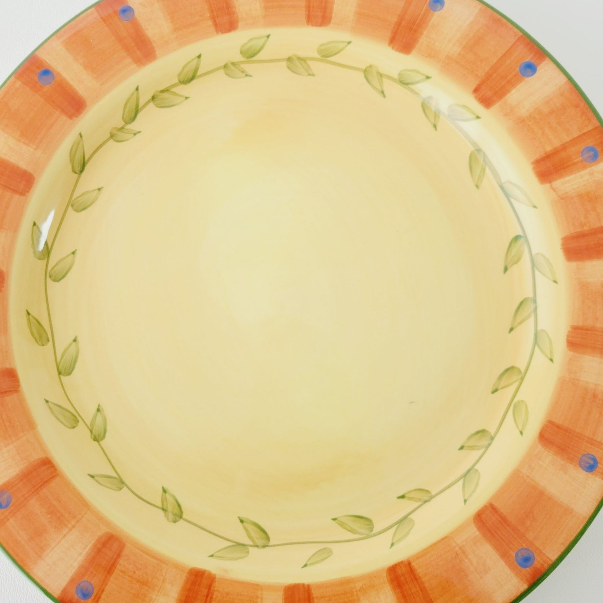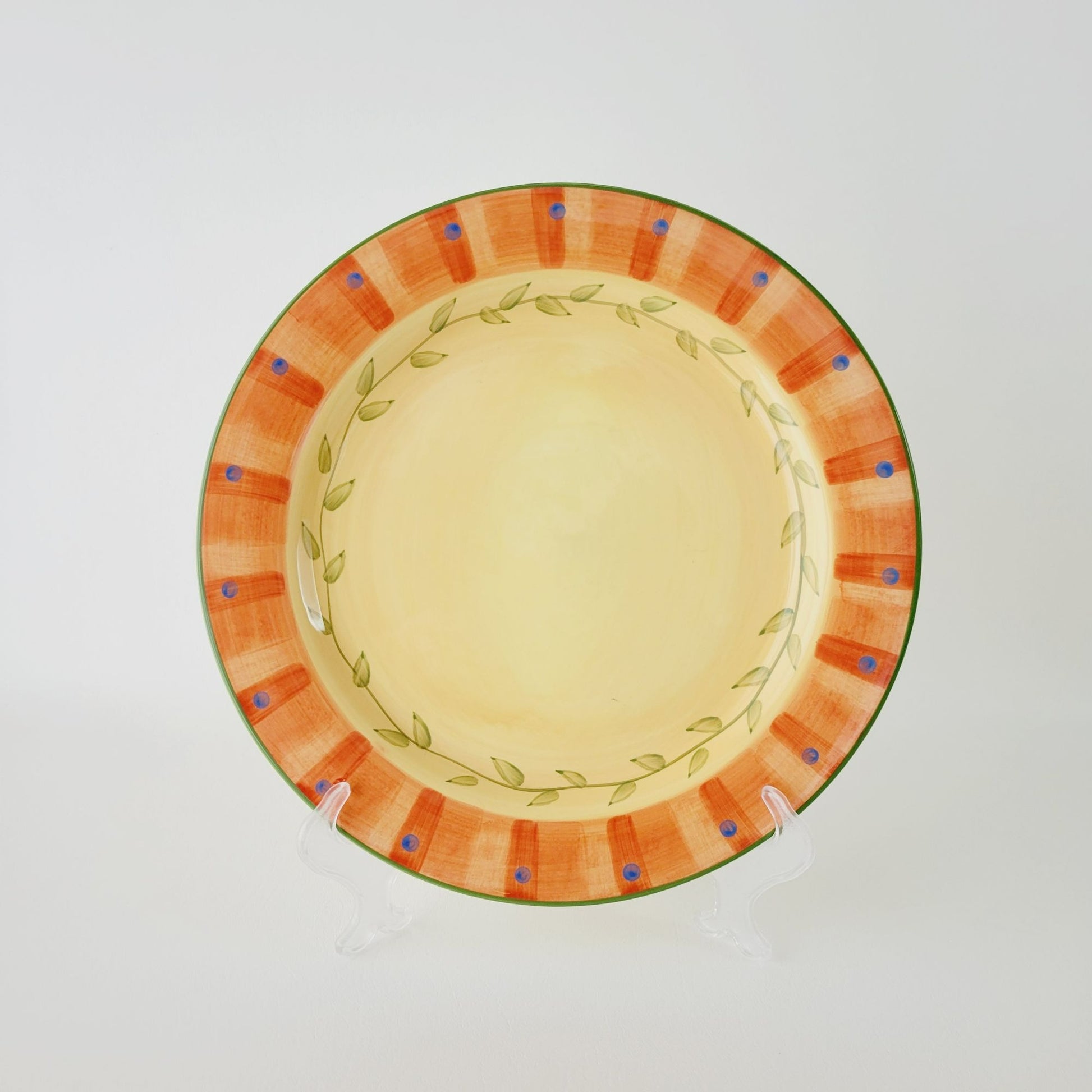 This Pfaltzgraff Napoli dinner plate is a vibrant piece hand-painted in bright colors of orange, yellow, and green. Crafted from stoneware, it has an 11.75" diameter and a glazed finish that adds an extra pop of color.