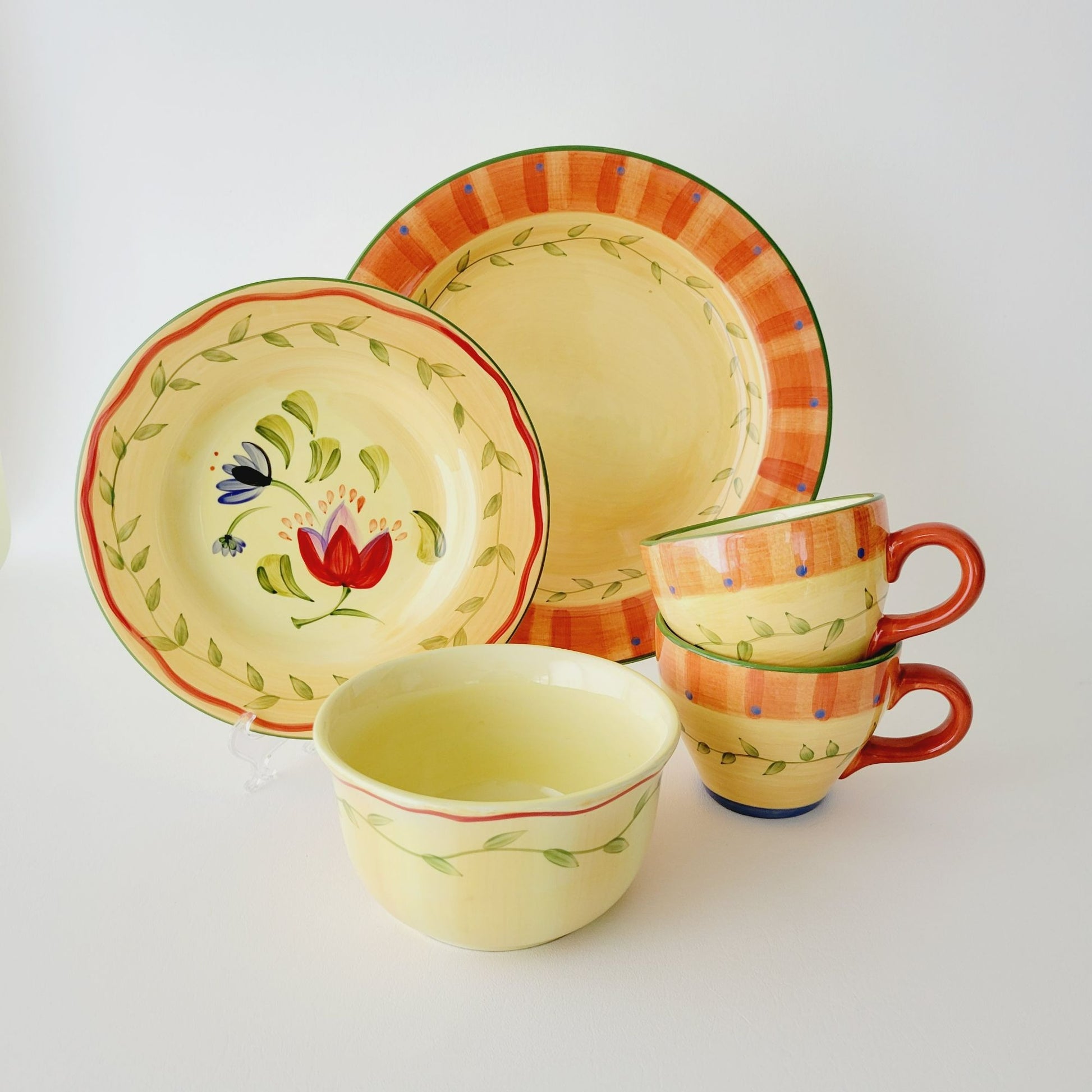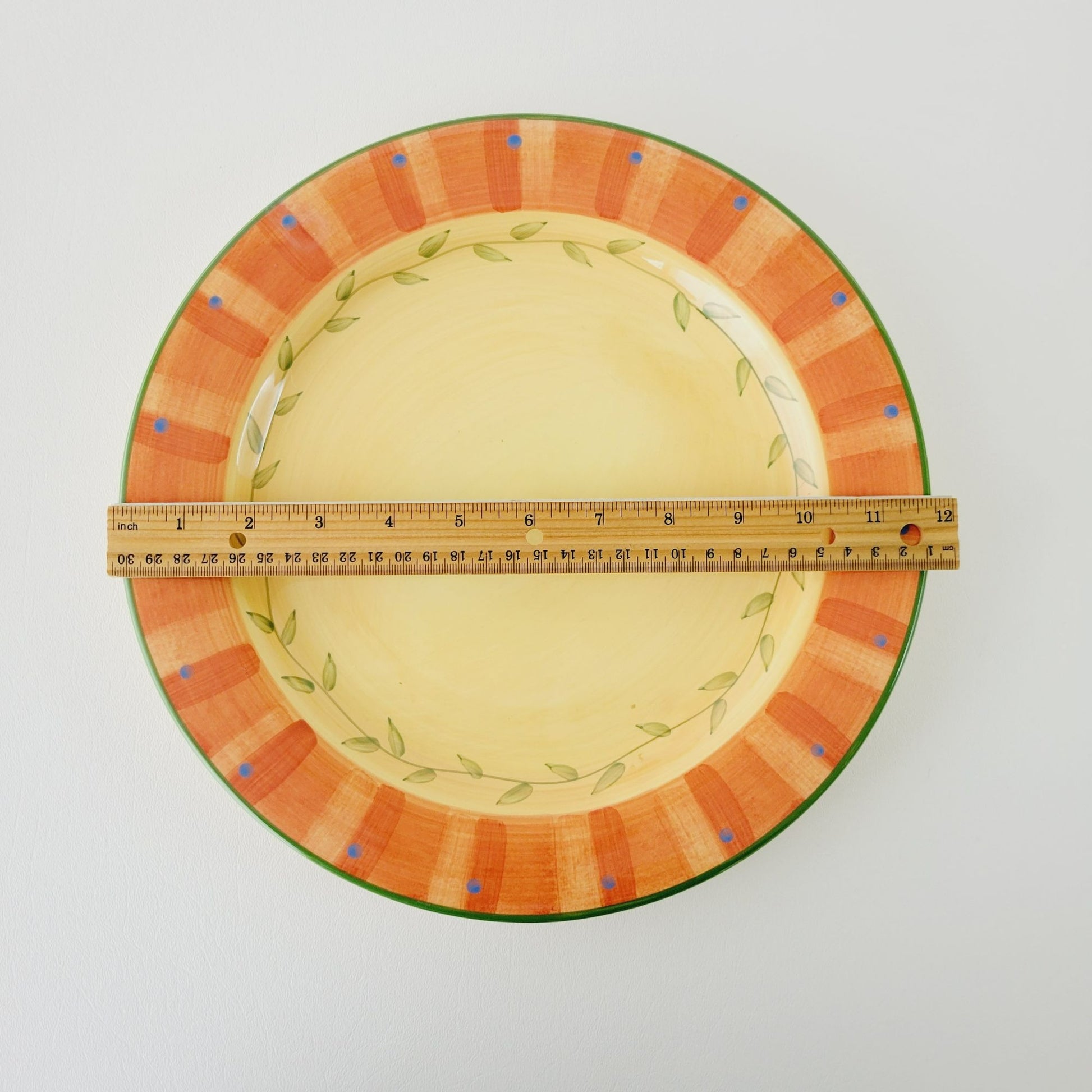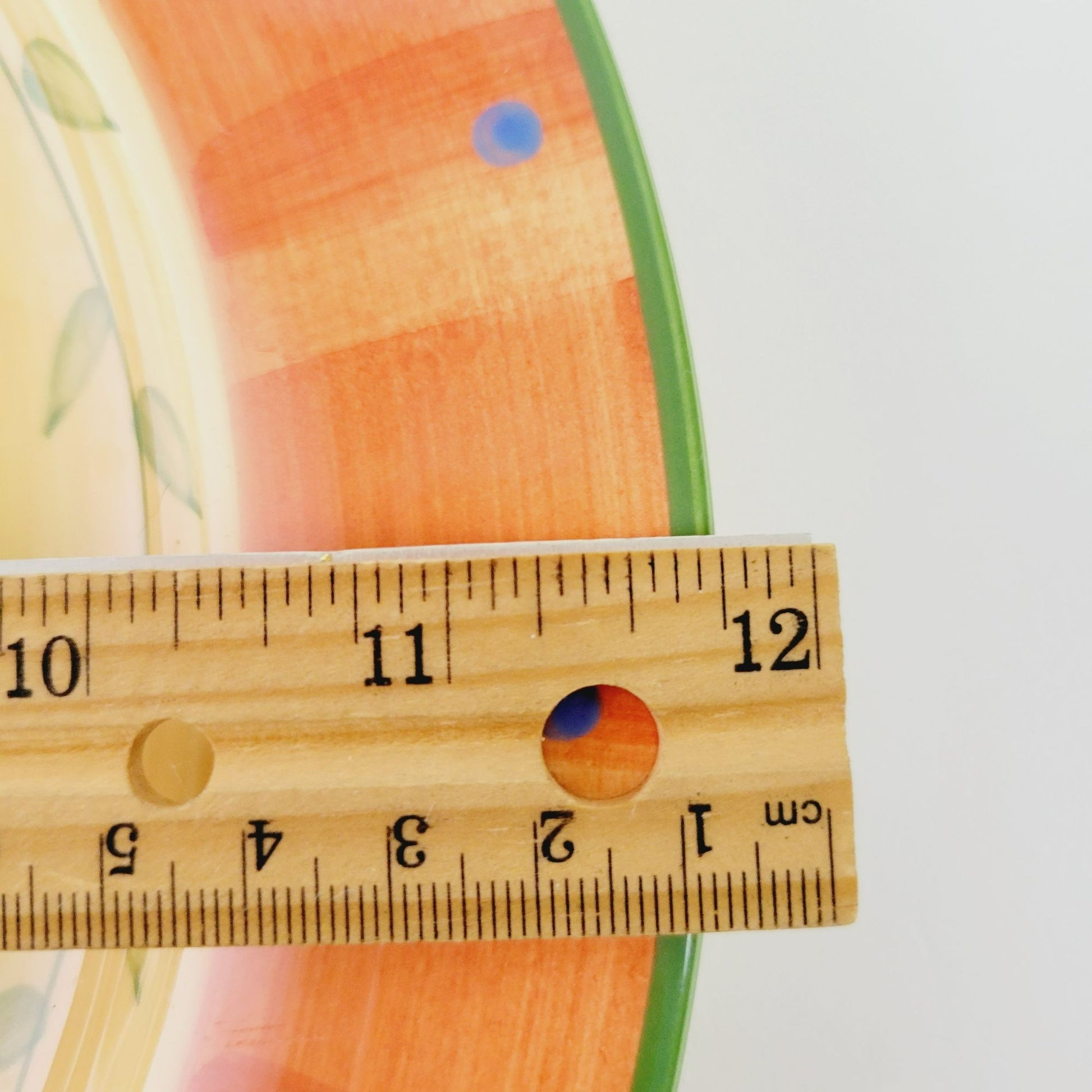 This Pfaltzgraff Napoli dinner plate is a vibrant piece hand-painted in bright colors of orange, yellow, and green. Crafted from stoneware, it has an 11.75" diameter and a glazed finish that adds an extra pop of color.