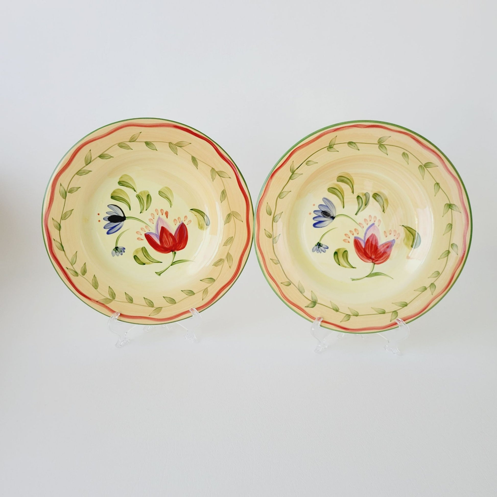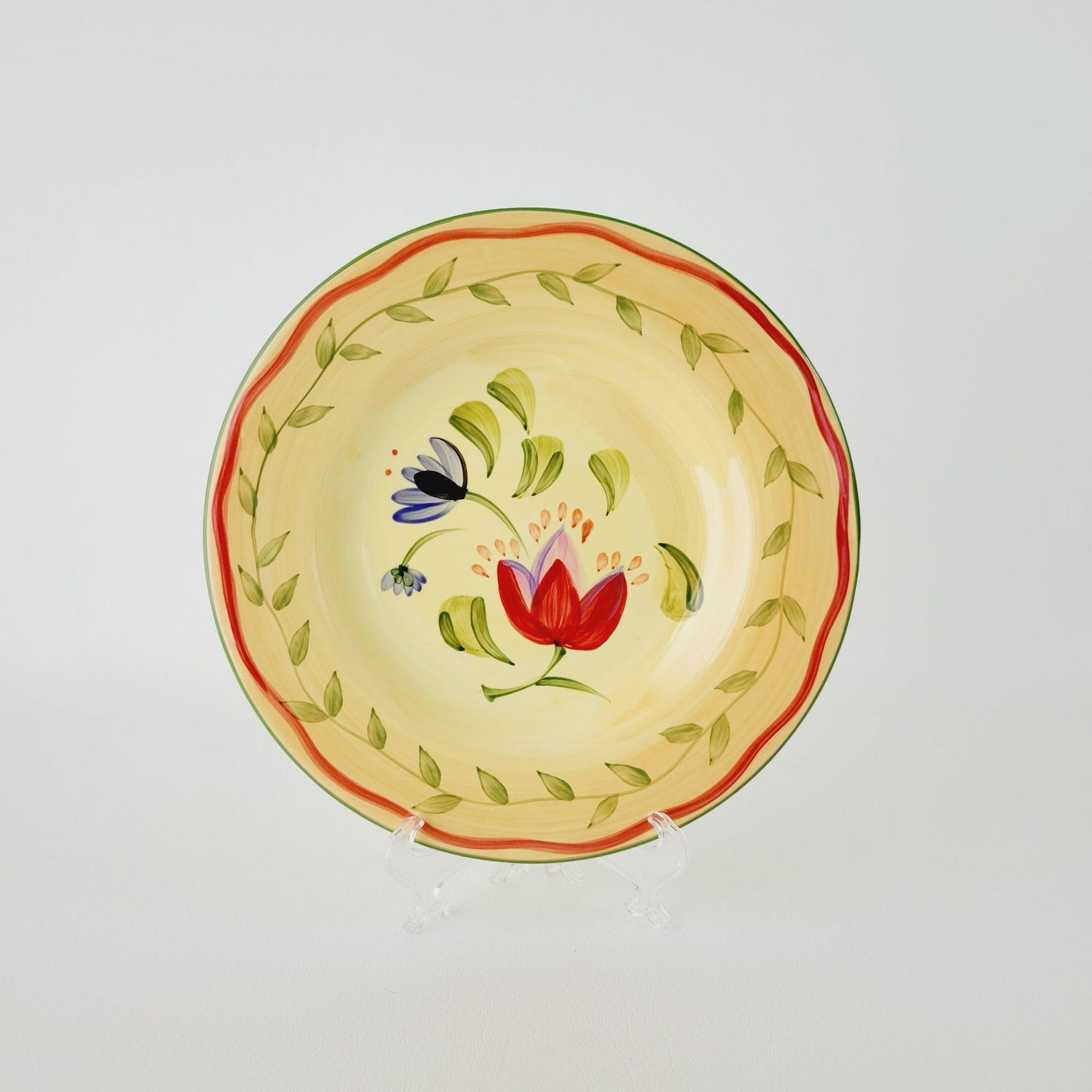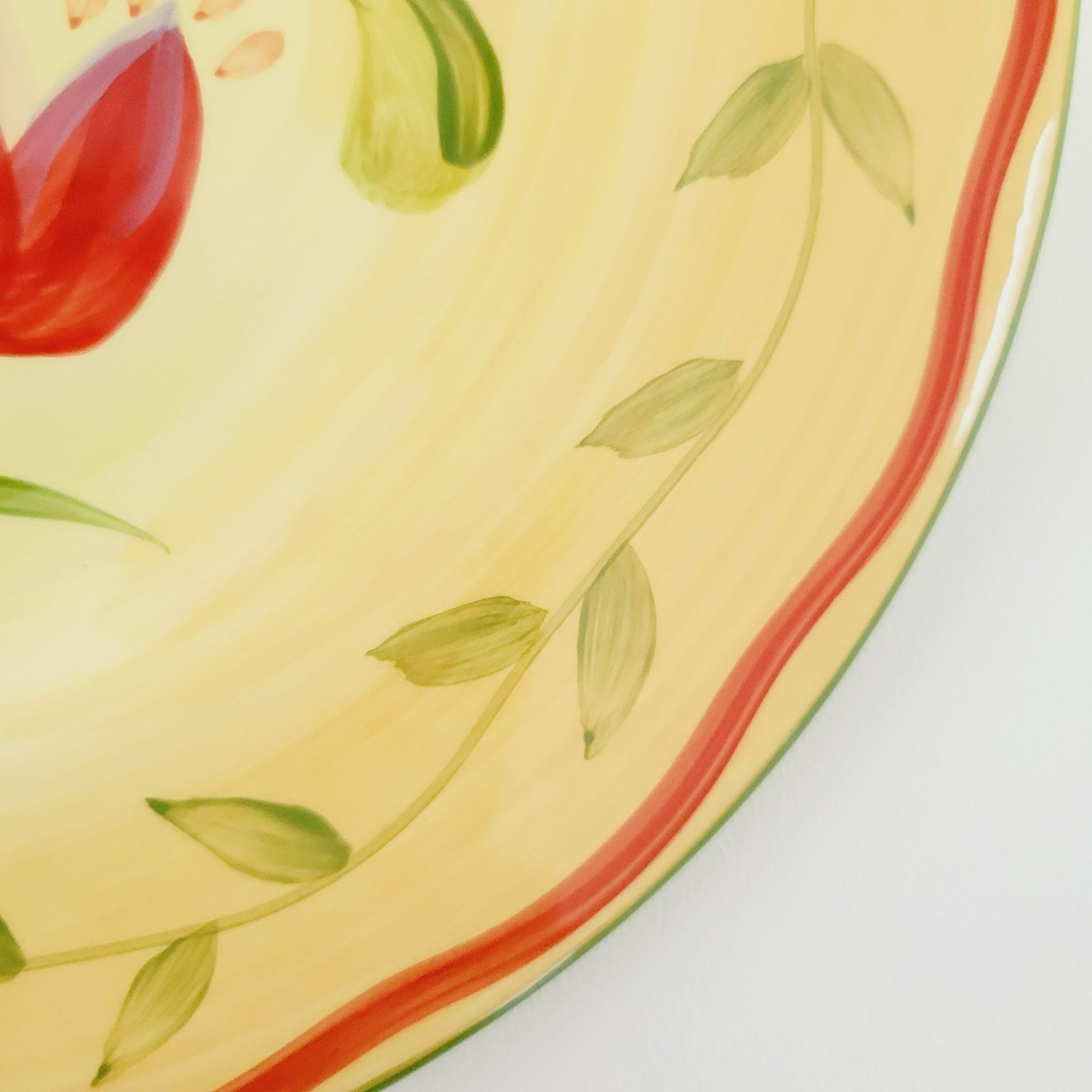 These Pfaltzgraff Napoli salad plate is a vibrant piece hand-painted in bright colors of orange, yellow, and green. Crafted from stoneware, it has an 9" diameter and a glazed finish that adds an extra pop of color.