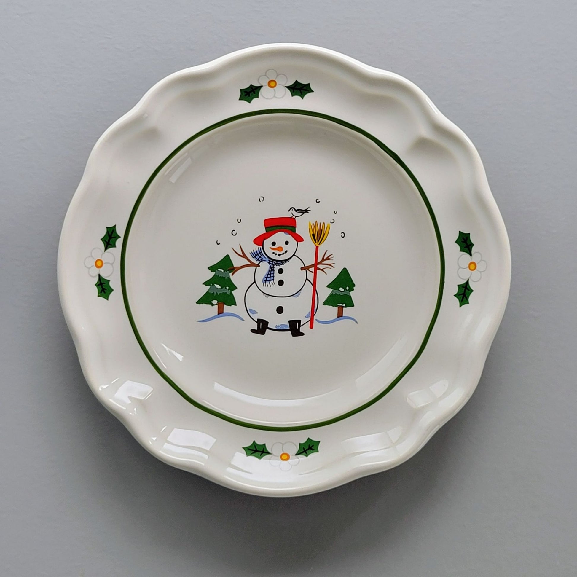 This Pfaltzgraff Snow Village Bread / Dessert Plate features a charming snowman center and is a vintage piece from the 1990s. A hard-to-find size, perfect for holiday gatherings. Made of durable stoneware, this collectible Christmas dish adds a festive touch to your table.