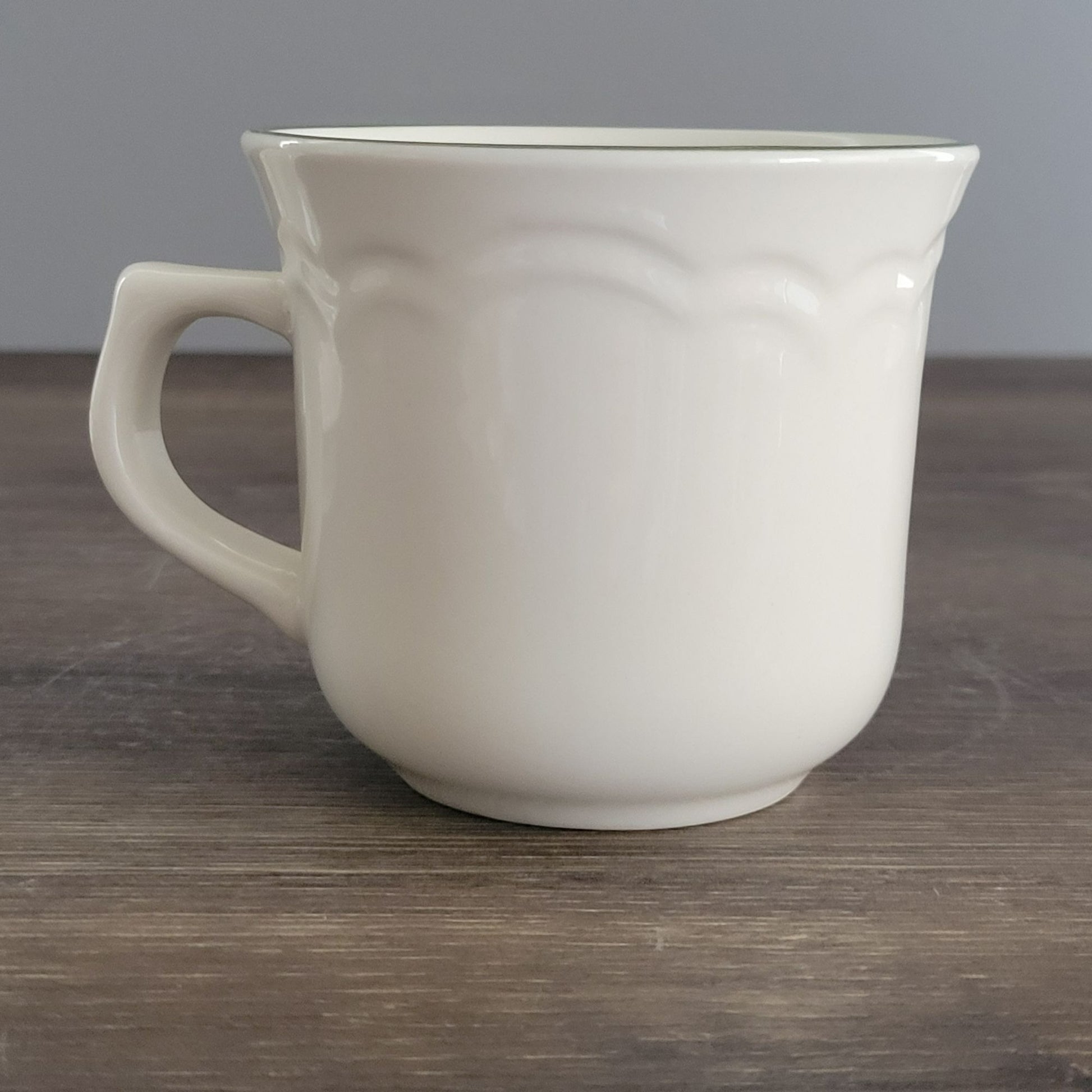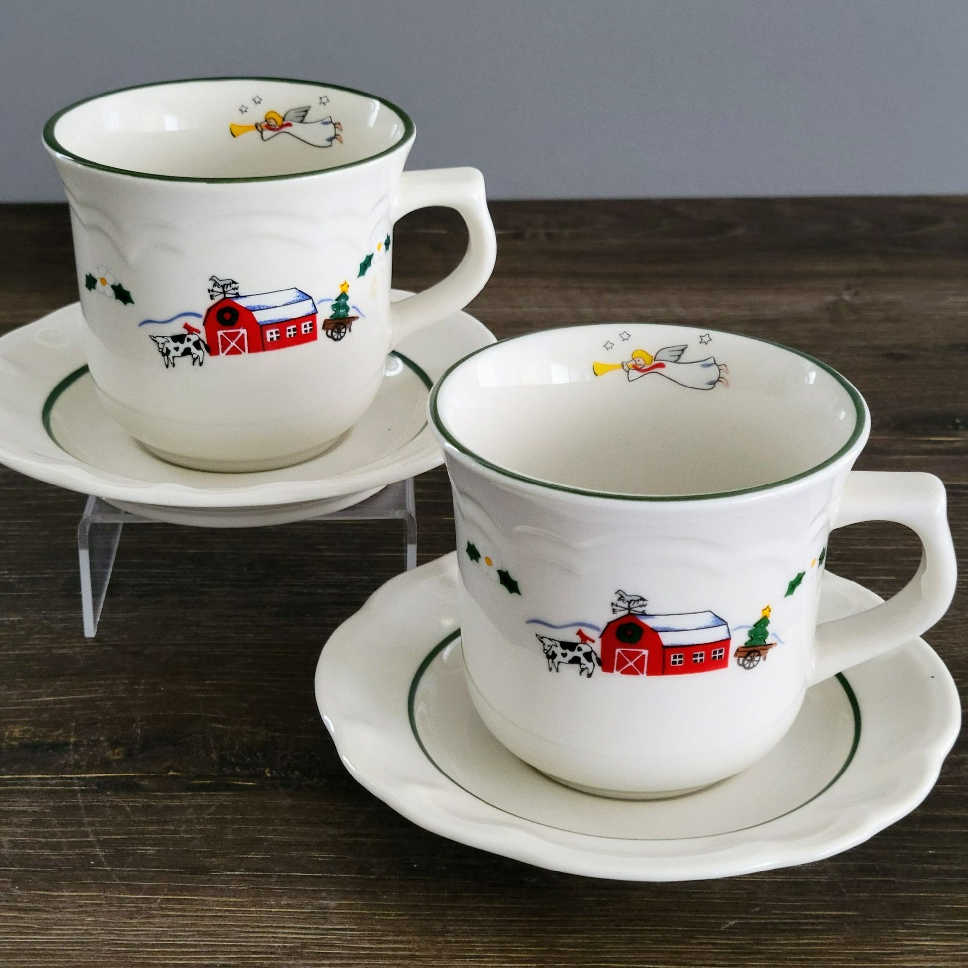 Add a touch of nostalgia to your holiday gatherings with these vintage Pfaltzgraff Snow Village cup & saucer sets. Each stoneware mug features a charming winter cottage design with Santa and his reindeer, perfect for festive celebrations.