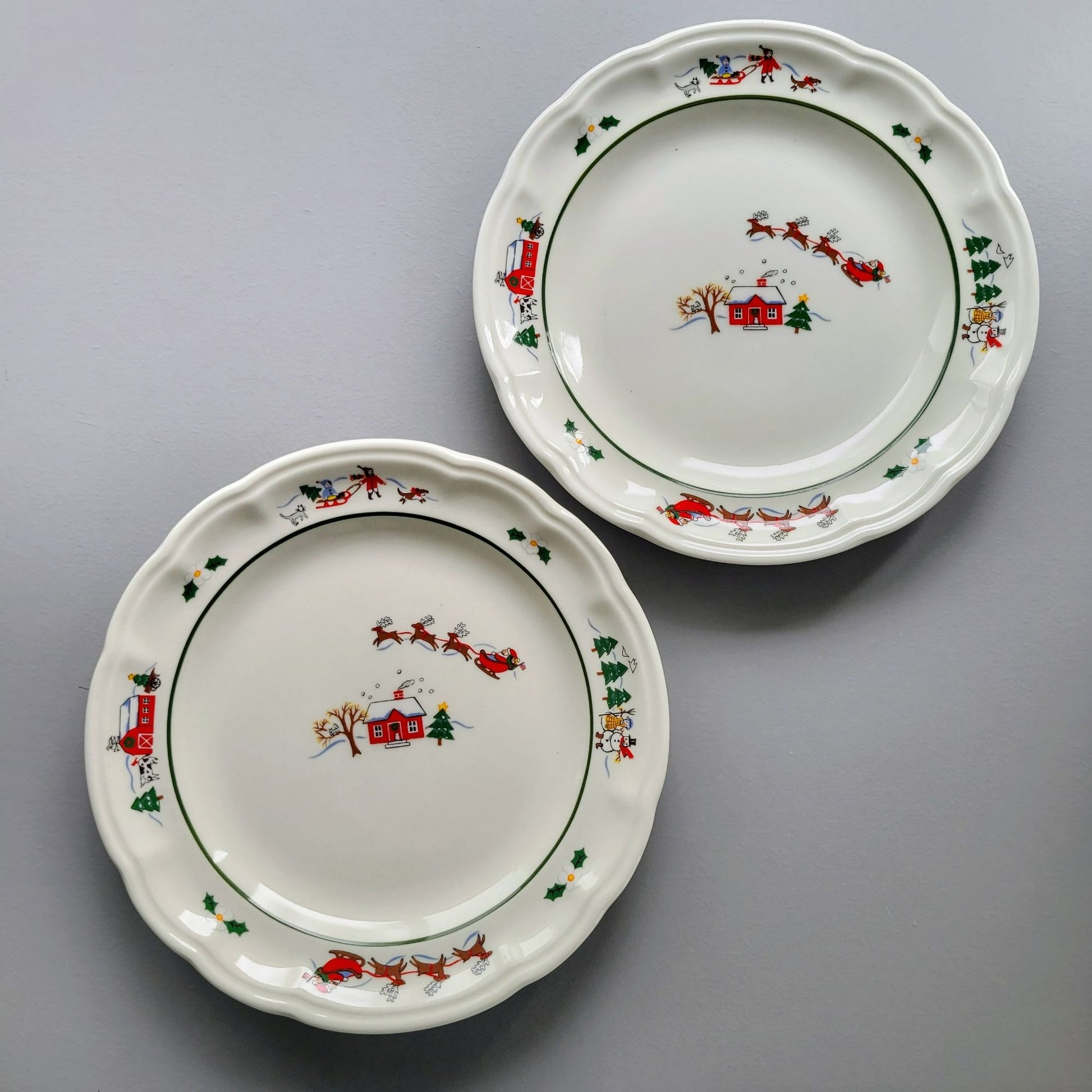 Vintage Pfaltzgraff Snow Village dishes featuring charming snowmen, farm scenes, and Santa with reindeer. Perfect for festive gatherings and holiday décor. Made from durable stoneware, these pieces are both practical and collectible.