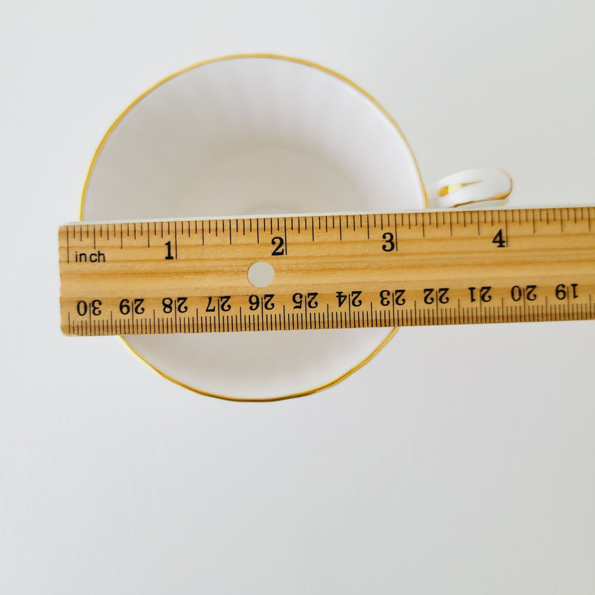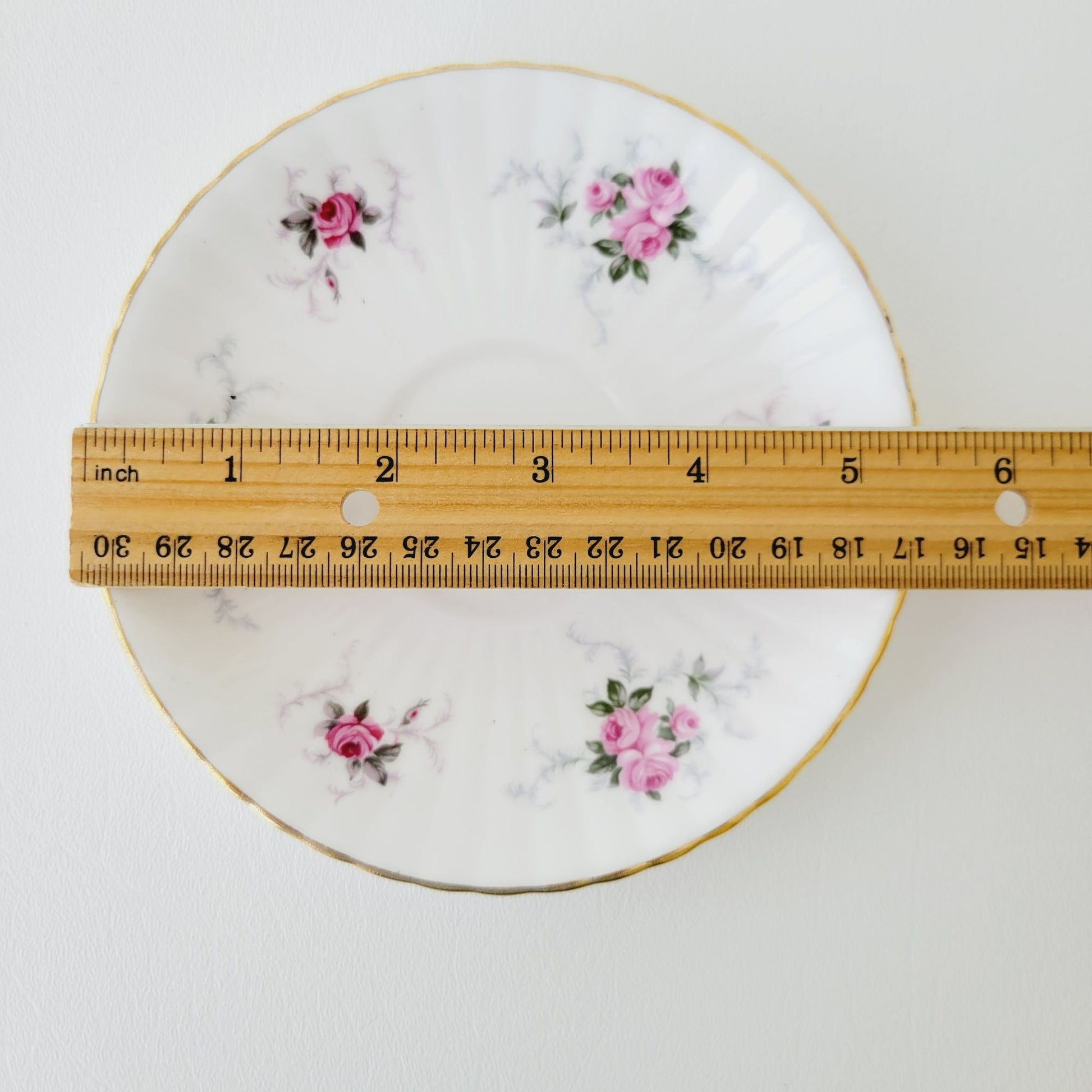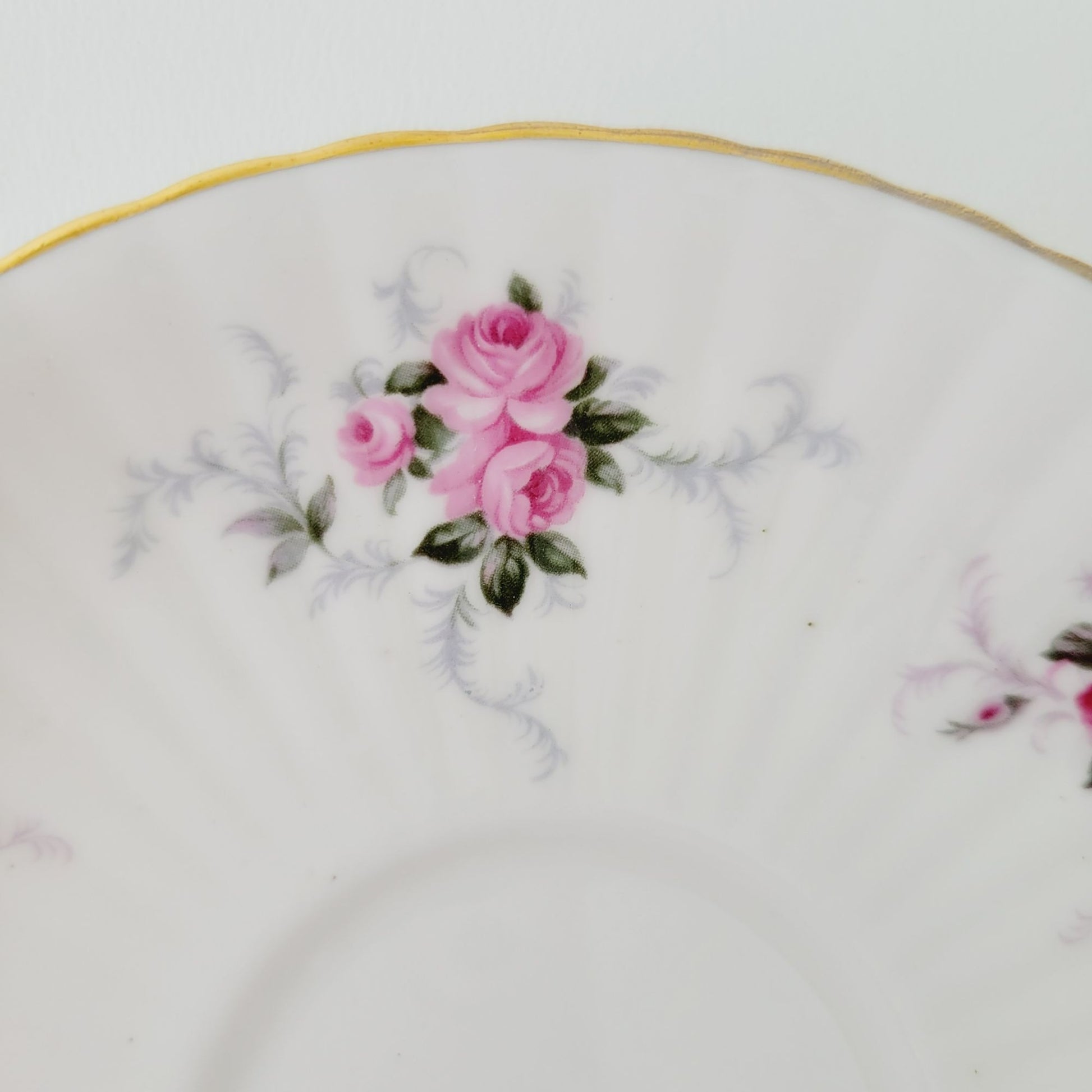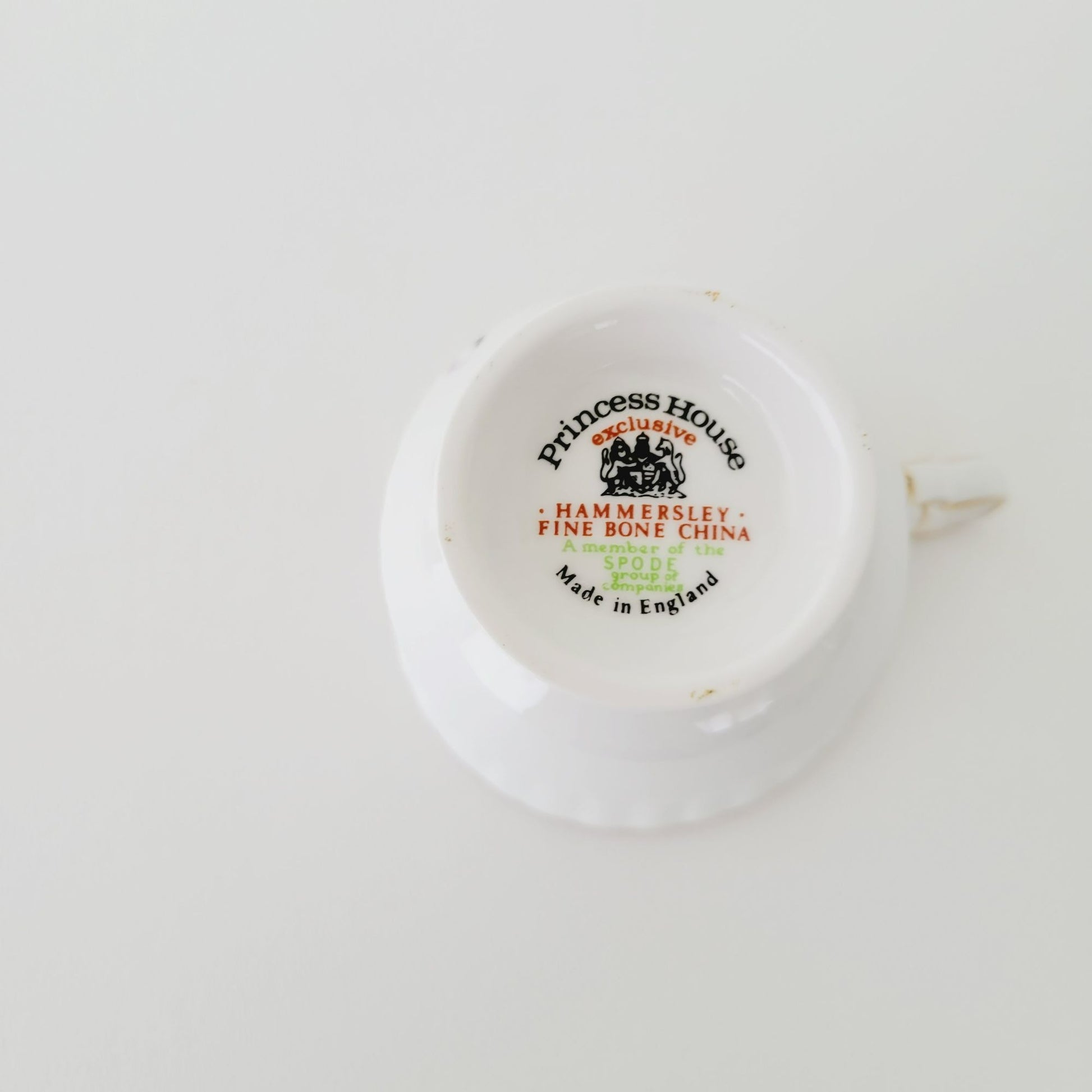 These Hammersley Princess House Teacups/Saucers showcase the exquisite Windsor Rose design. Made in England, these fine bone china pieces feature a footed ribbed cup adorned with pink roses and a gold trim.