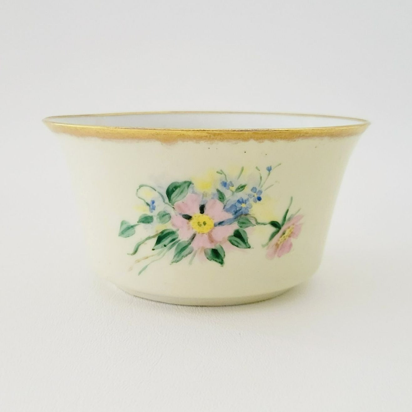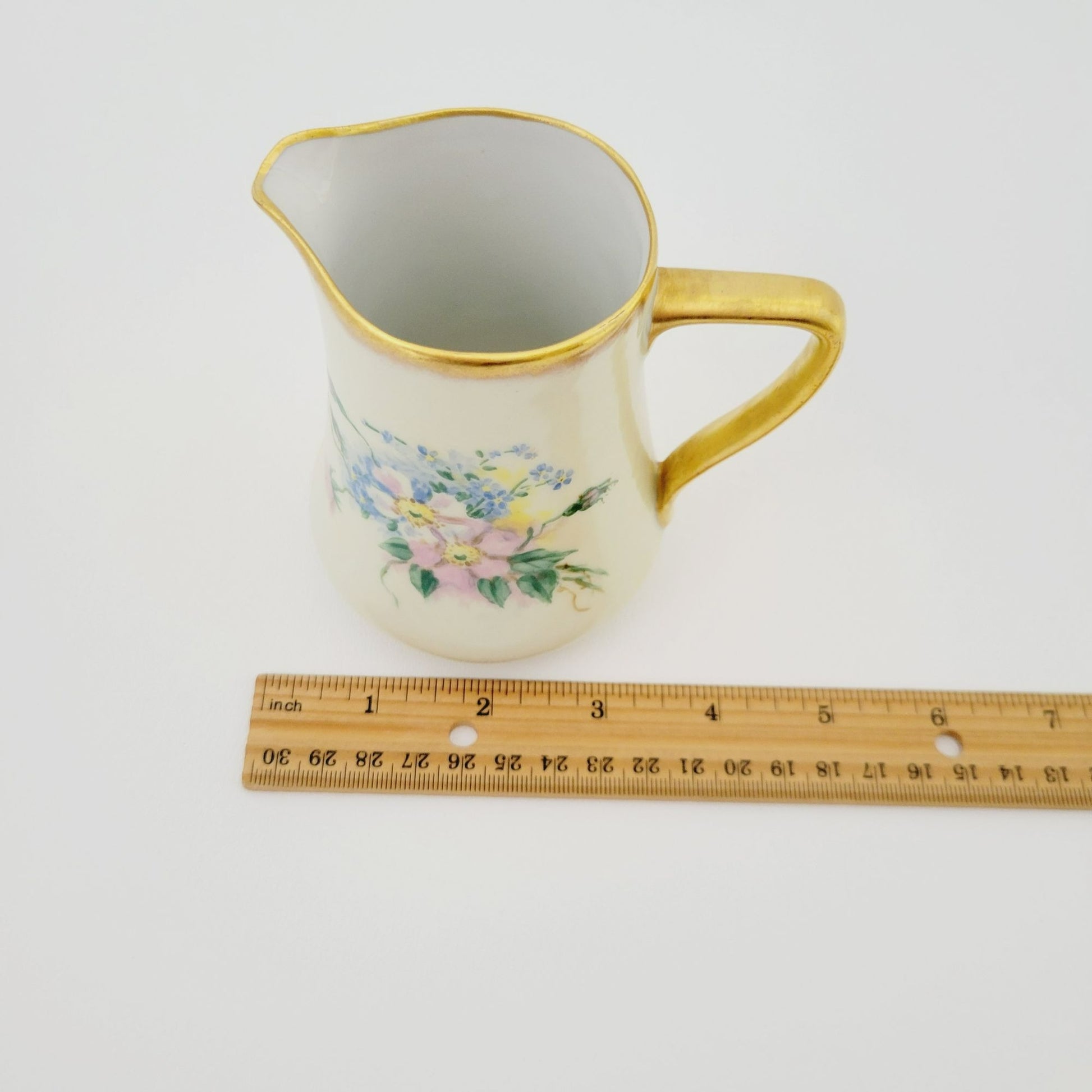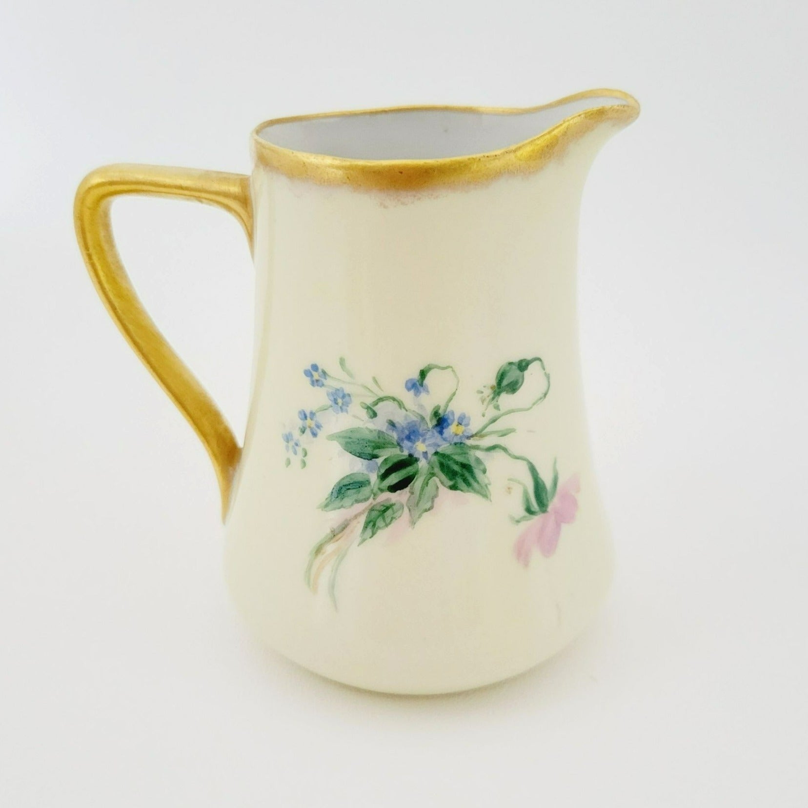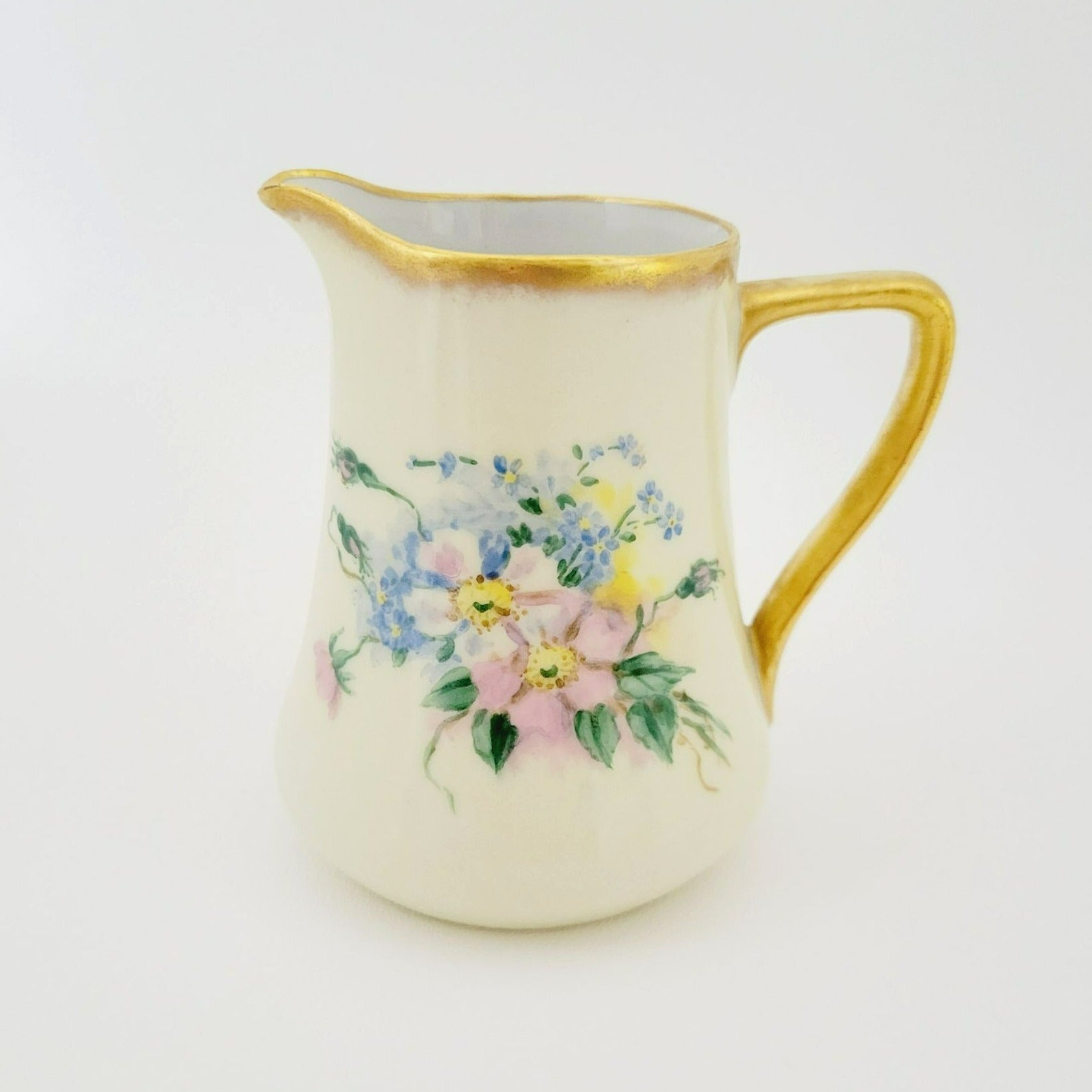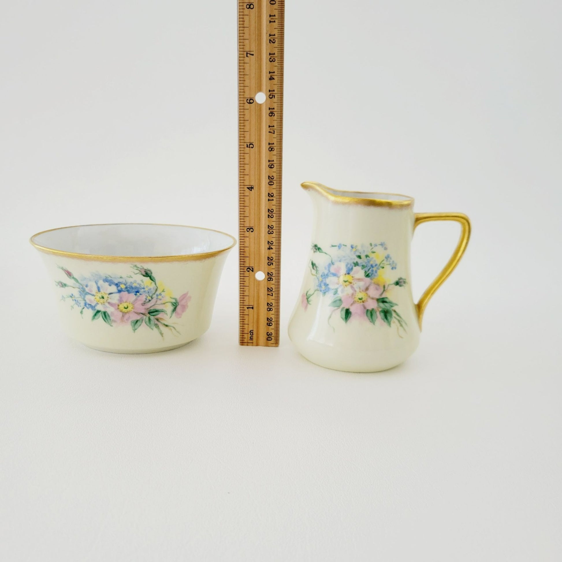 This rare antique Rosenthal floral creamer, sugar bowl, and tea tray set (c.1891-1906) is hand-painted with heavy gold trim. In cream, gold, pink, and blue, it's a stunning showcase of Kronach-Bavaria Chrysantheme craftsmanship.