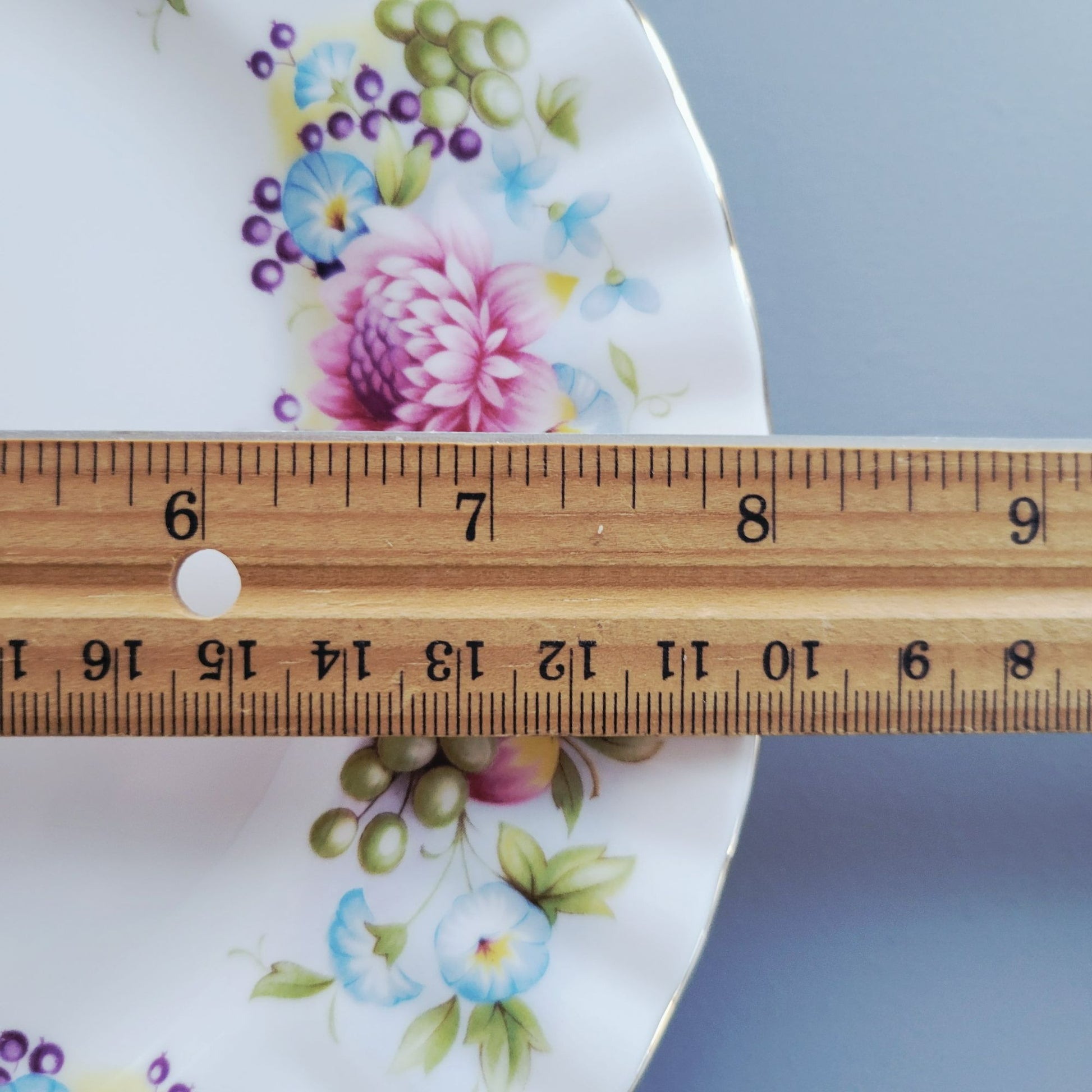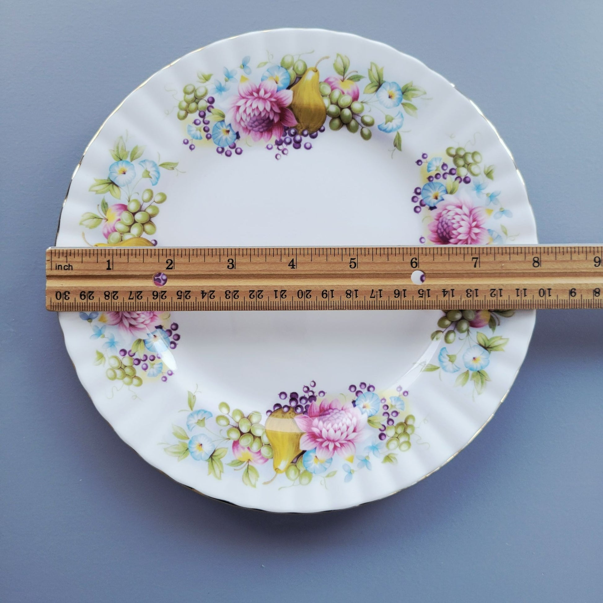 This rare vintage salad plate from Royal Albert features a delightful mix of fruits and flowers. Dating back to the 1950s, it showcases pears, berries, grapes, and floral designs. The ribbed edge adds a touch of elegance, making it a charming addition to any collection.
