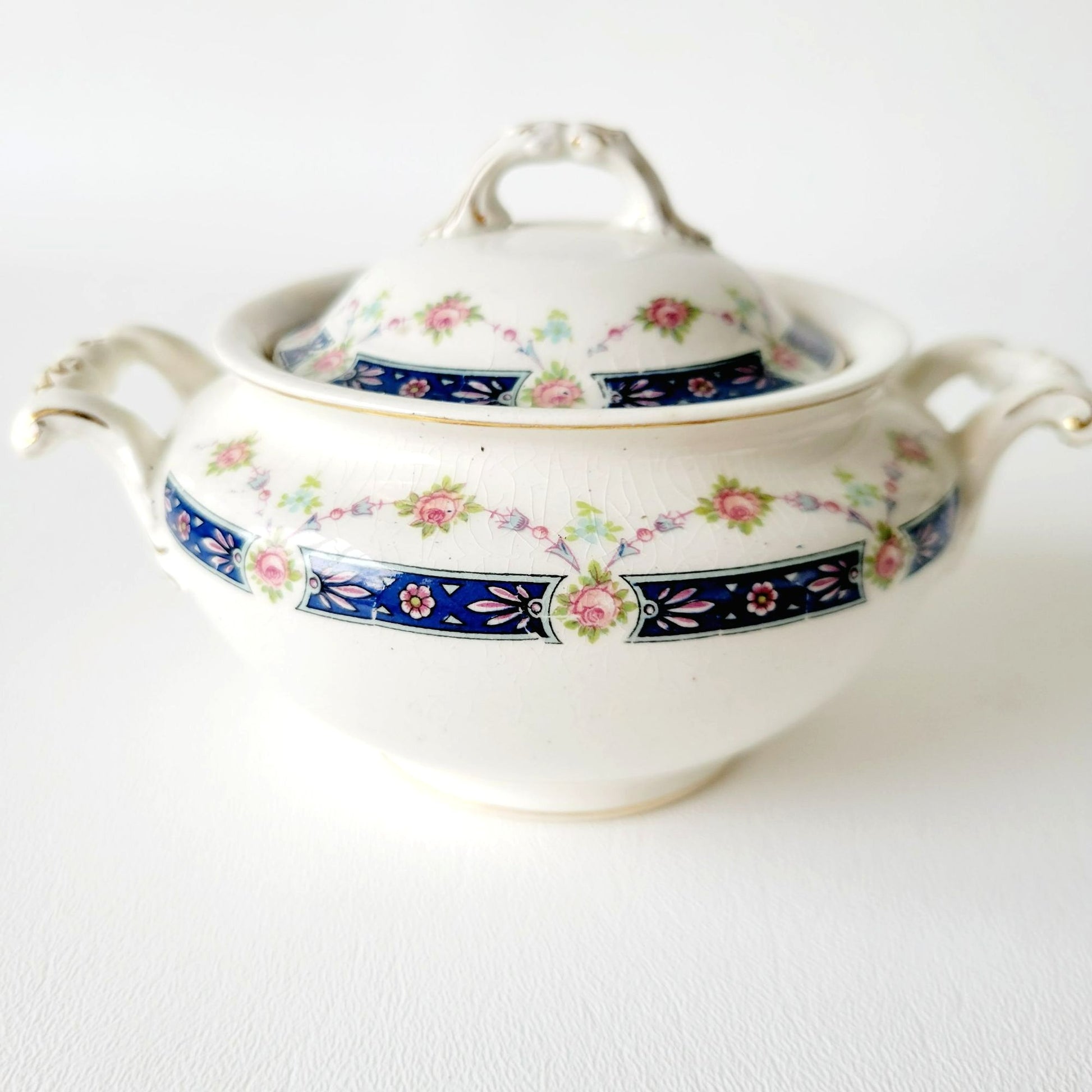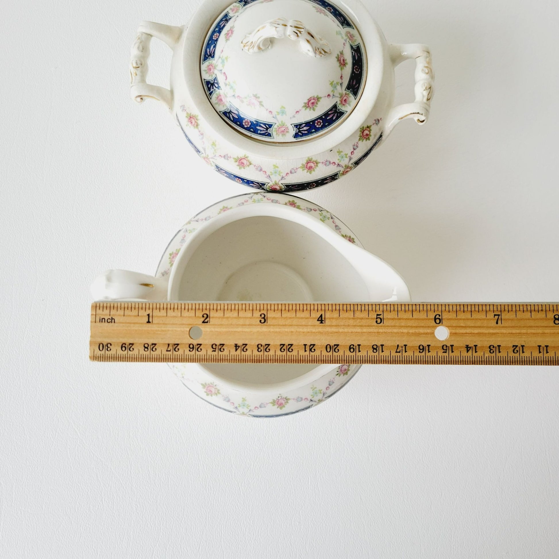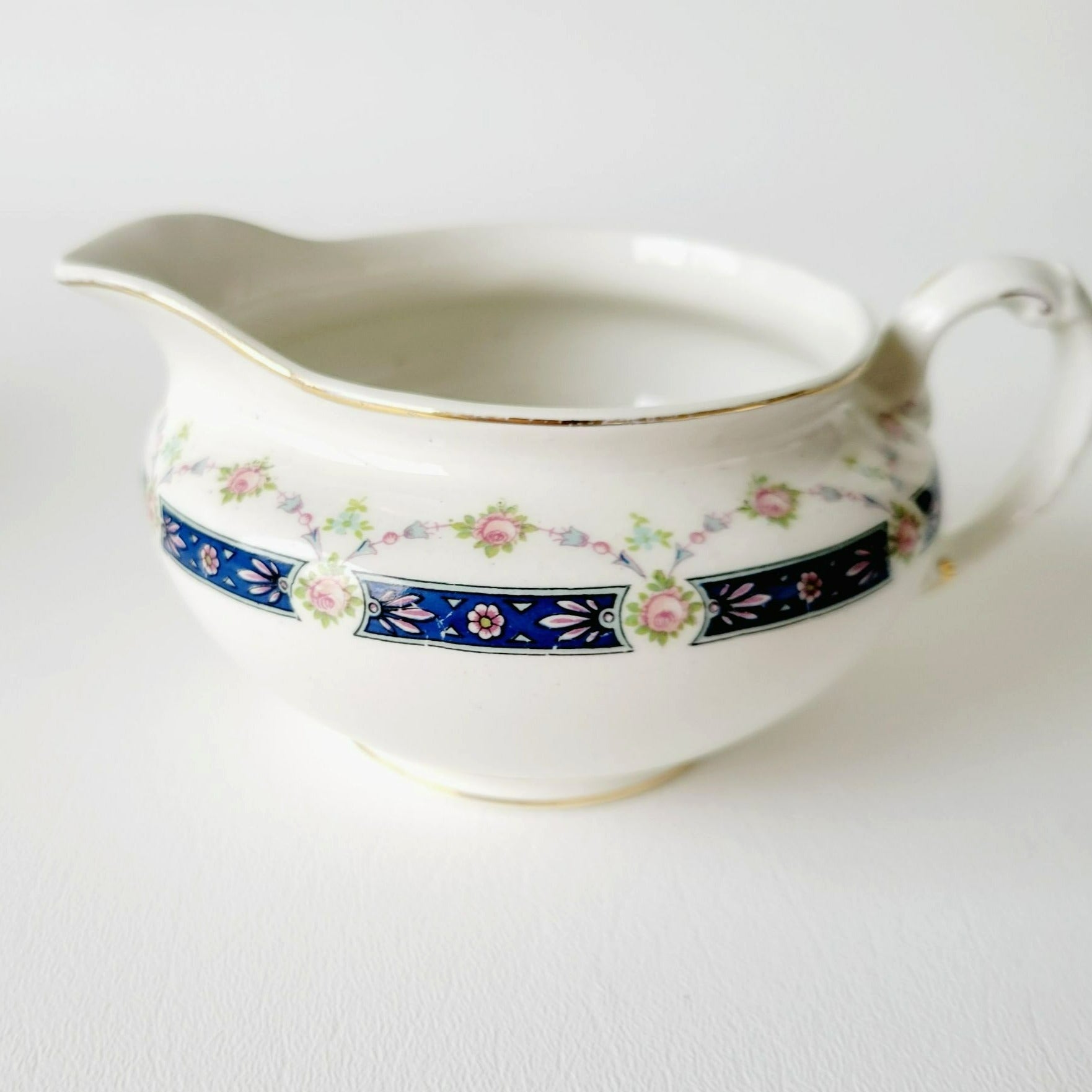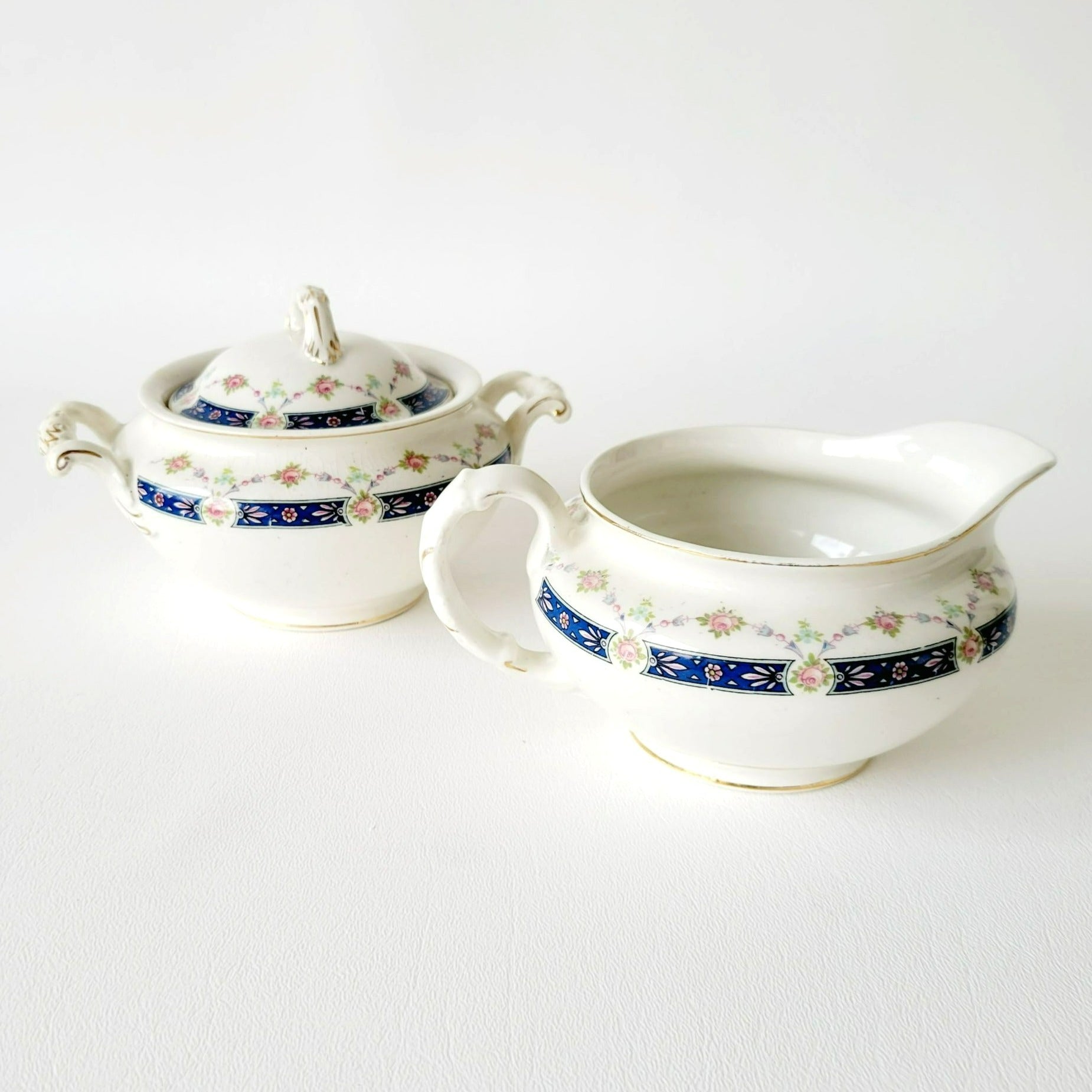 Vintage Johnson Bros. sugar bowl and creamer set in white, blue, and pink, featuring a beautiful floral design and complete with a lid. The sugar bowl has crazing, adding to its vintage appeal. Made in England.