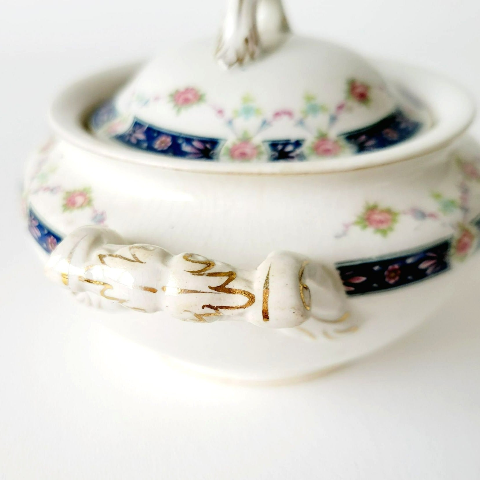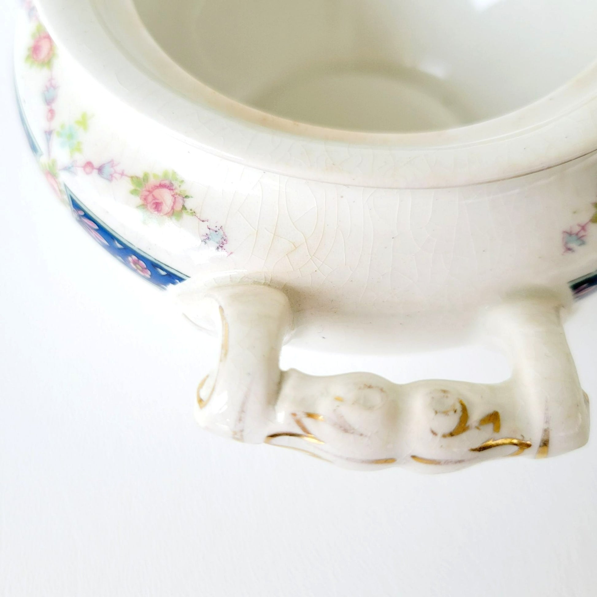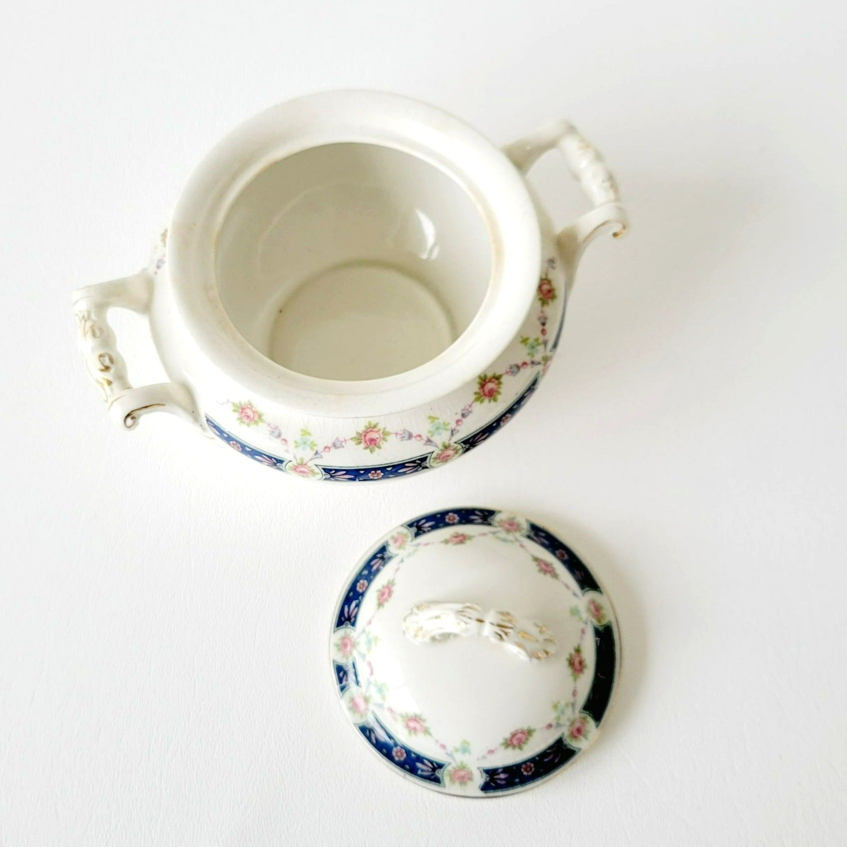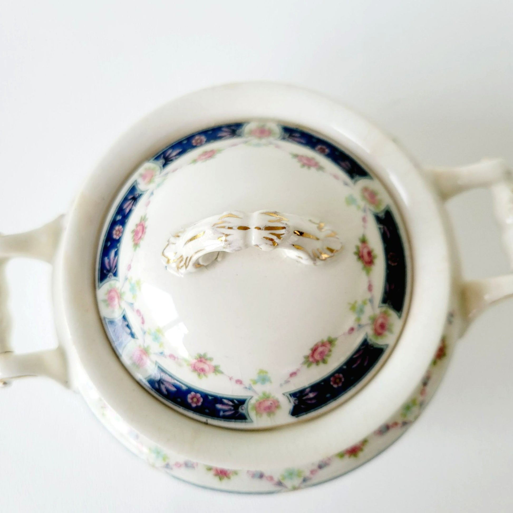 Vintage Johnson Bros. sugar bowl and creamer set in white, blue, and pink, featuring a beautiful floral design and complete with a lid. The sugar bowl has crazing, adding to its vintage appeal. Made in England.