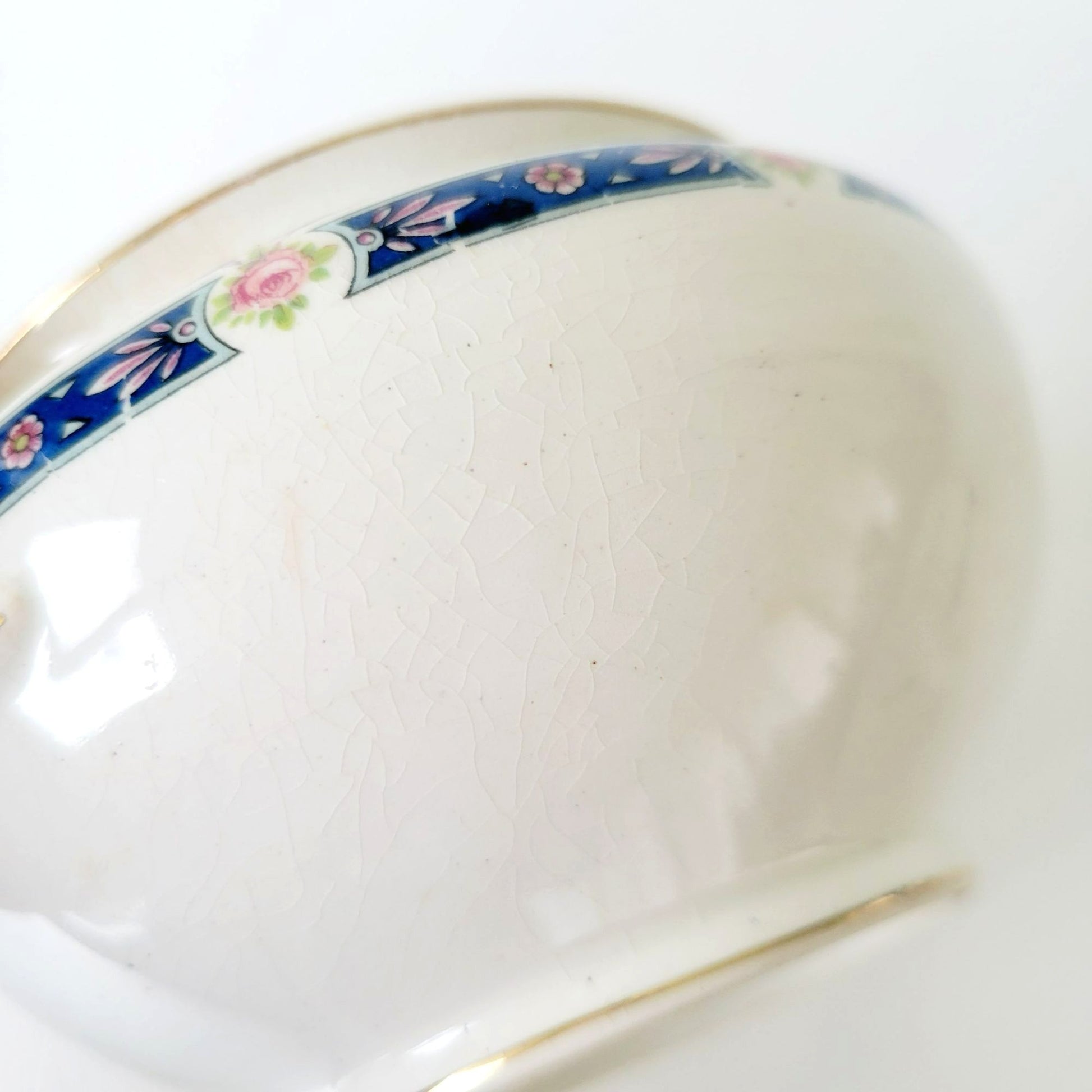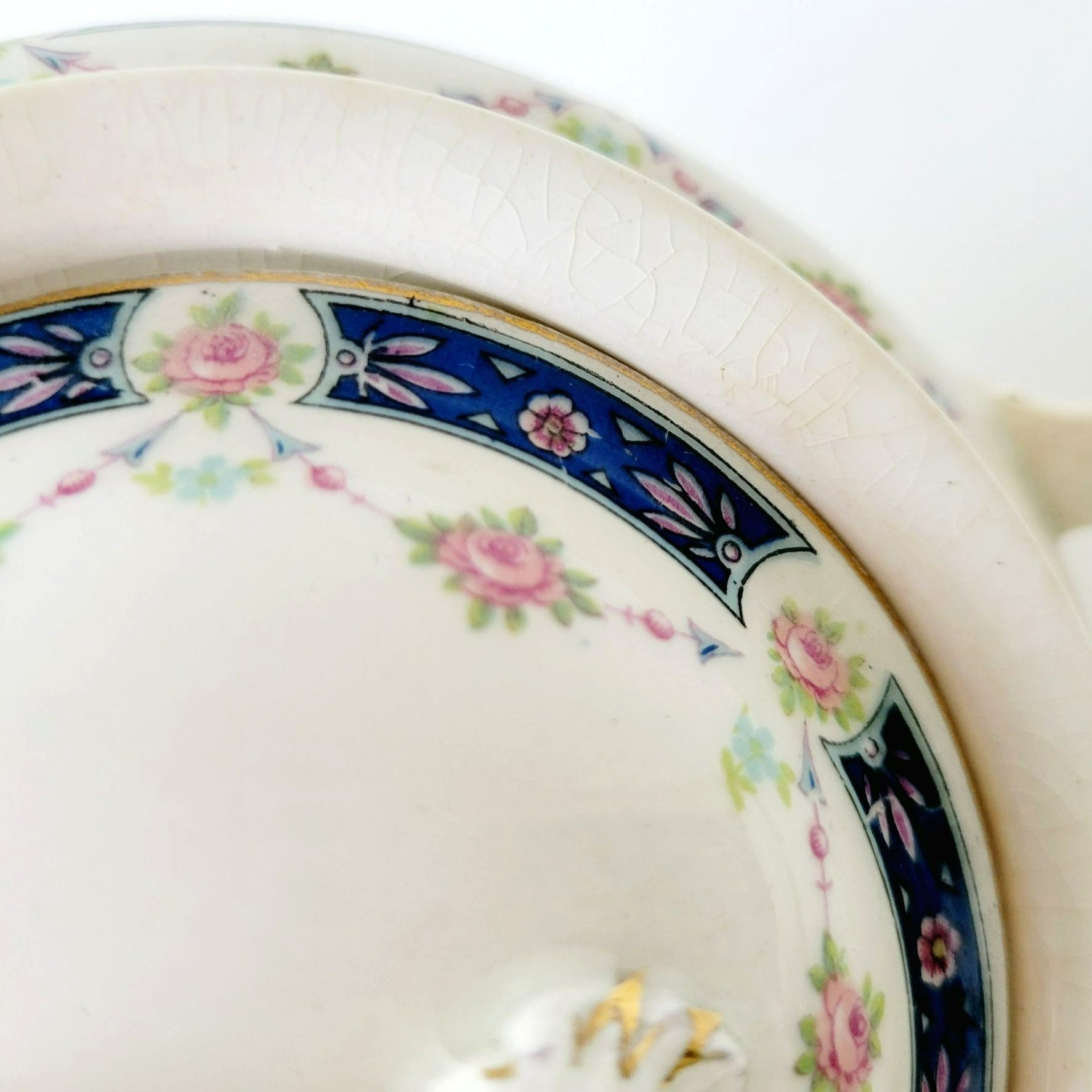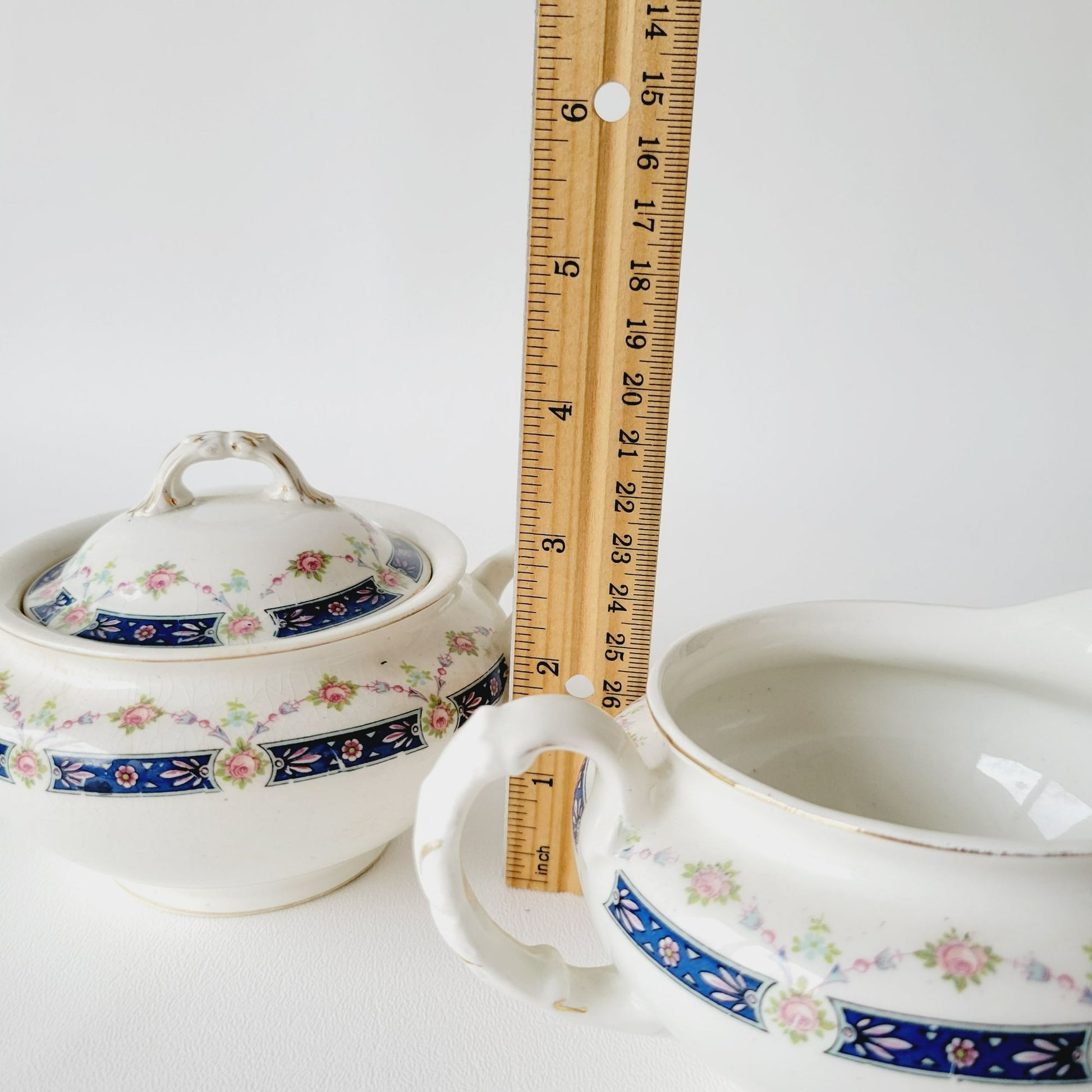 Rare Johnson Bro Sugar Bowl & Creamer, Blue Accent, Pink Floral, with CRAZING