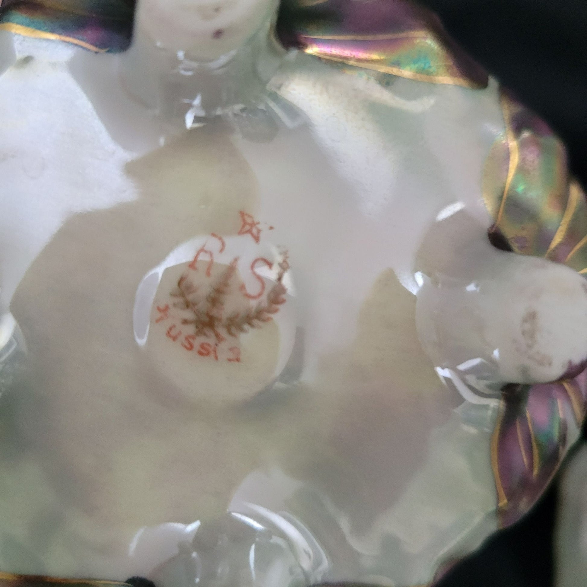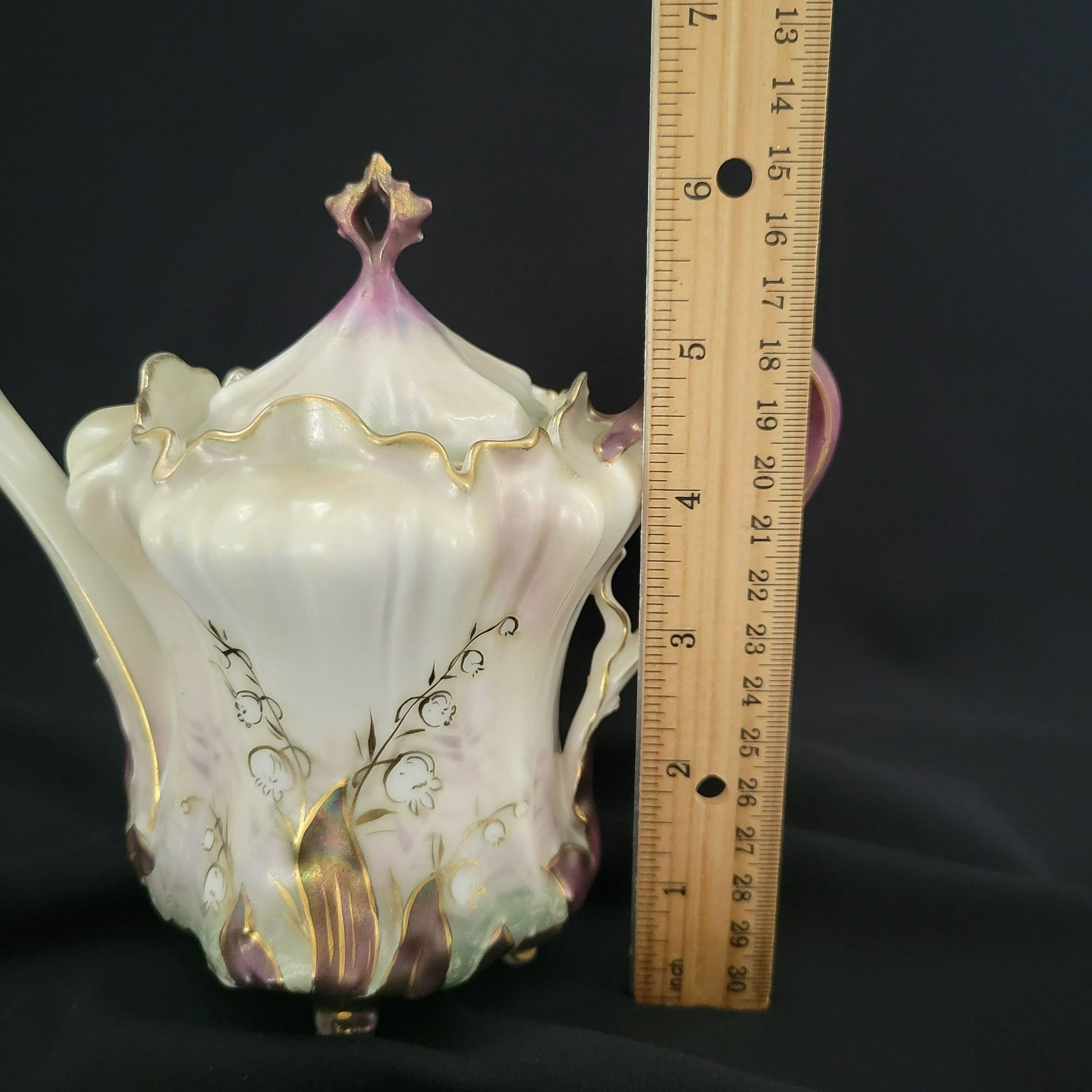 Rare Footed Bone China Teapot by RS Prussia. Pattern is Lilly of the Valley, hand painted with gold edging. This pieces is stunning and feels like silk to the touch. The embossed gold accent add a touch of elegance on an already beautiful piece. Pot is delicate, only weighing 10oz.