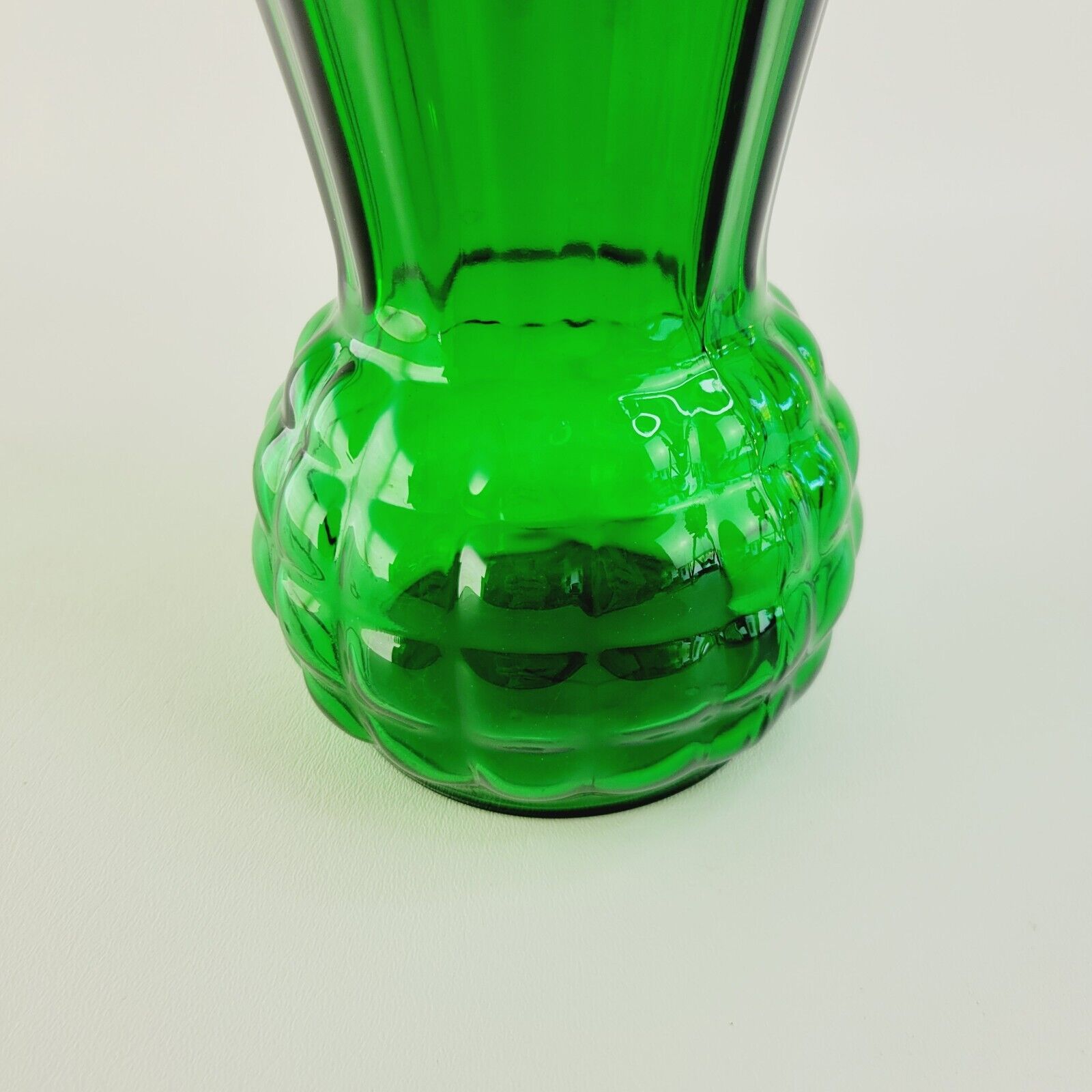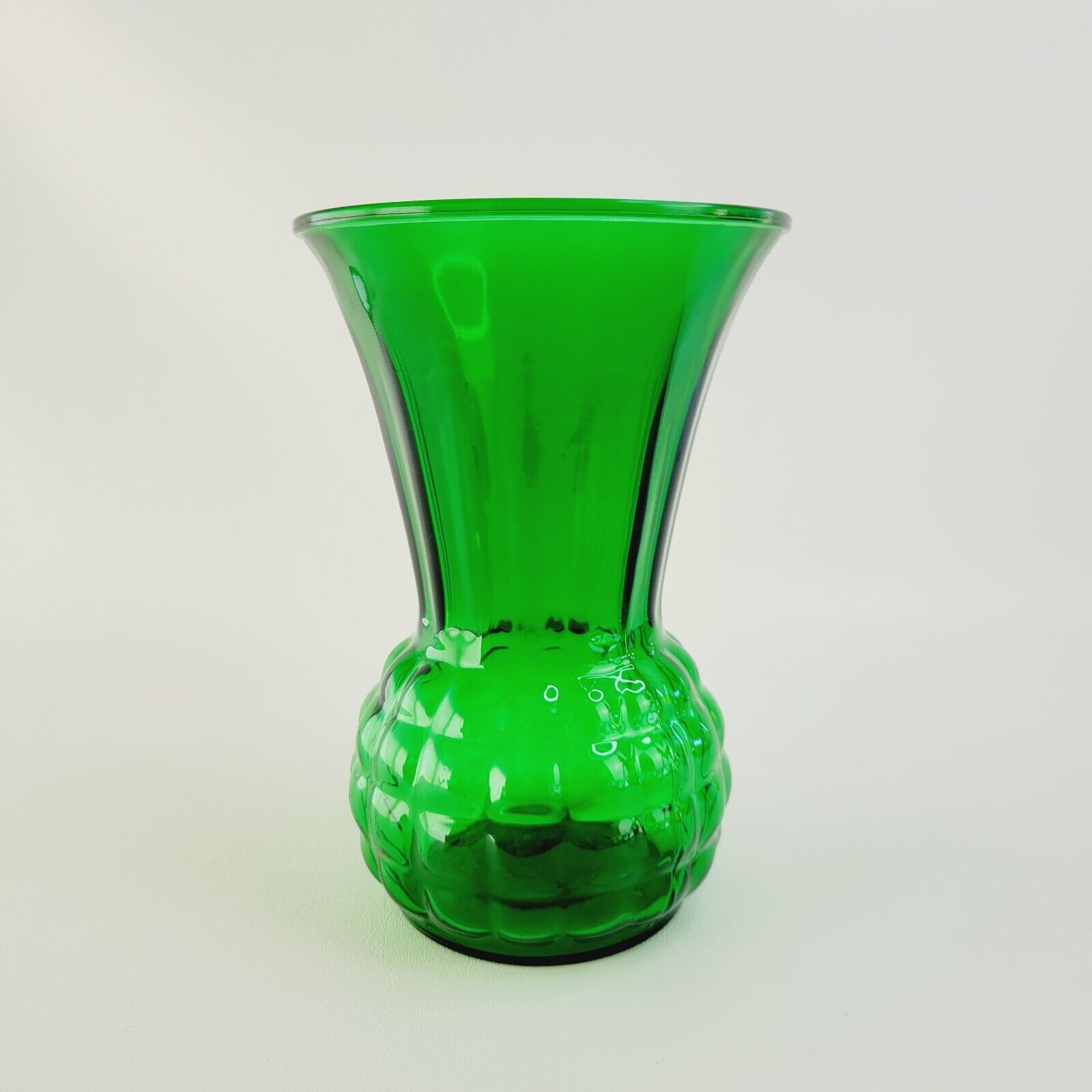 This Retro Forest Green Glass Vase by Anchor Hocking is a vintage piece with a flared pineapple shape and scalloped rim. Ideal for mid-century modern table décor.