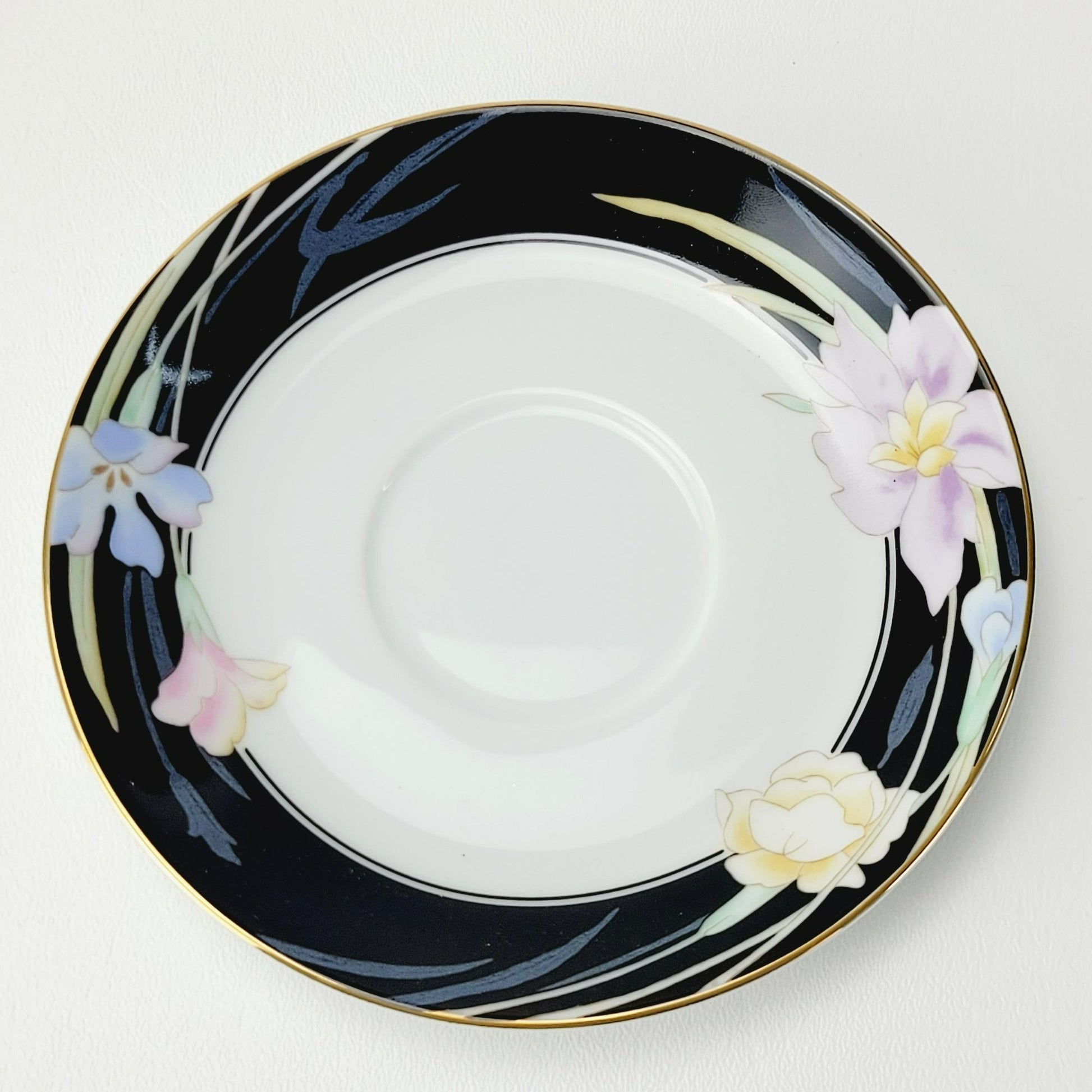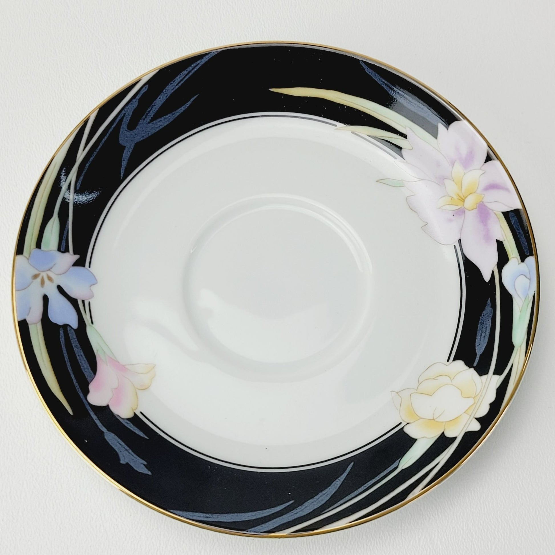 Retro Mikasa Charisma Black Footed Teacup & Saucer, 2 Sets, Black & White with Pink & Blue Floral Design, c.1980s Japan