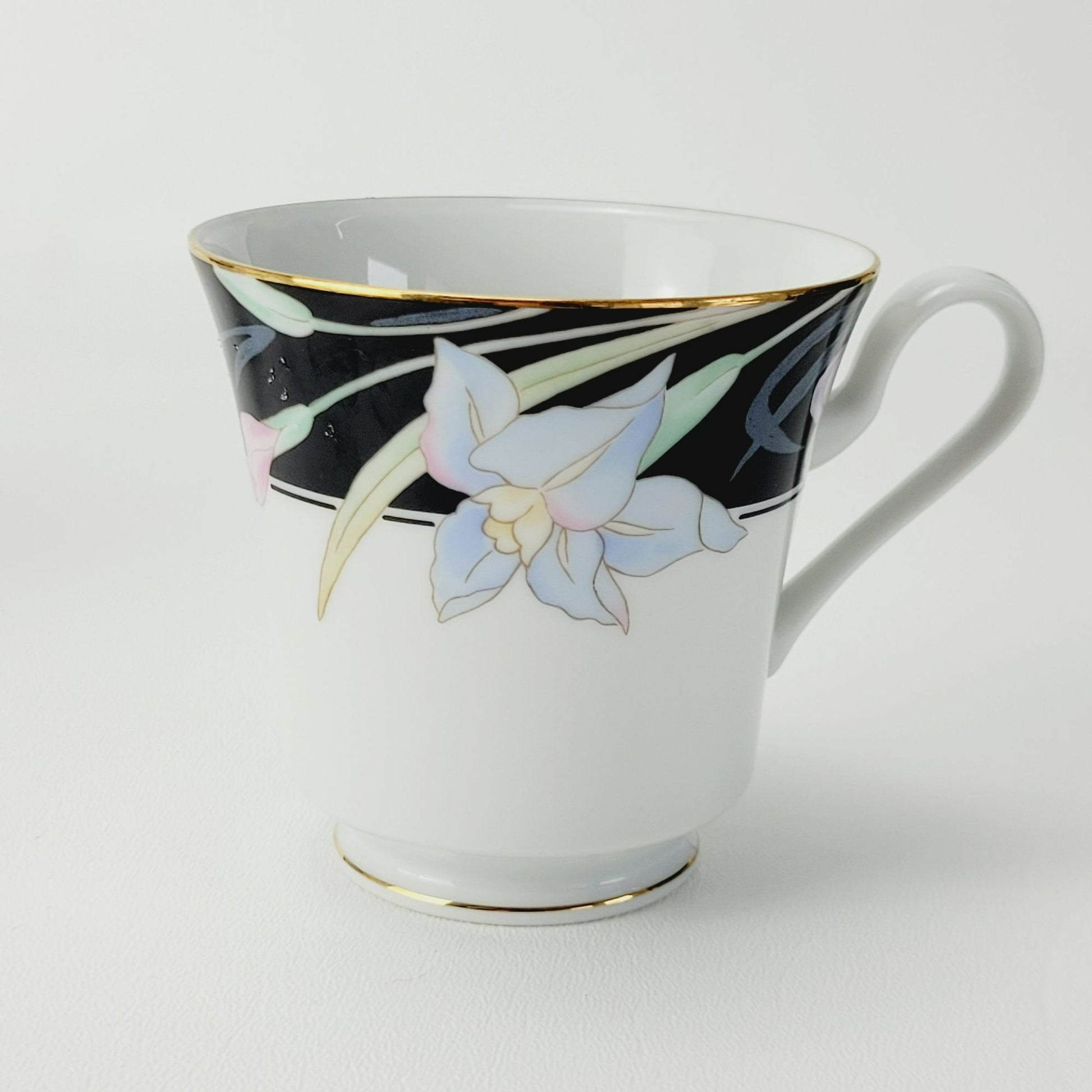 These Mikasa Charisma Black Footed Teacup & Saucer Sets from the 1980s are a retro delight. Its black and white base is elegantly contrasted with pink and blue floral design. Made of fine china, it holds 8 fl. oz.
