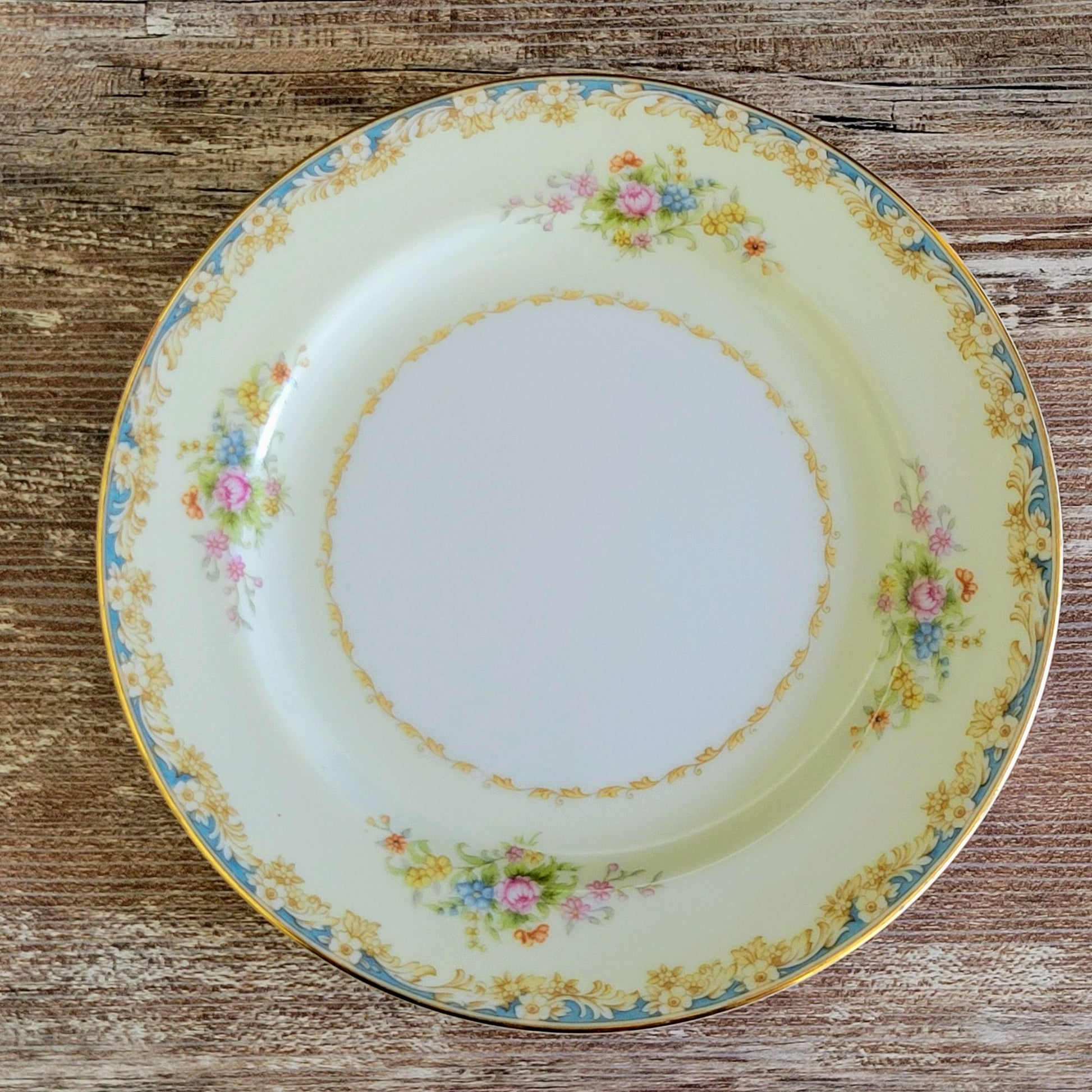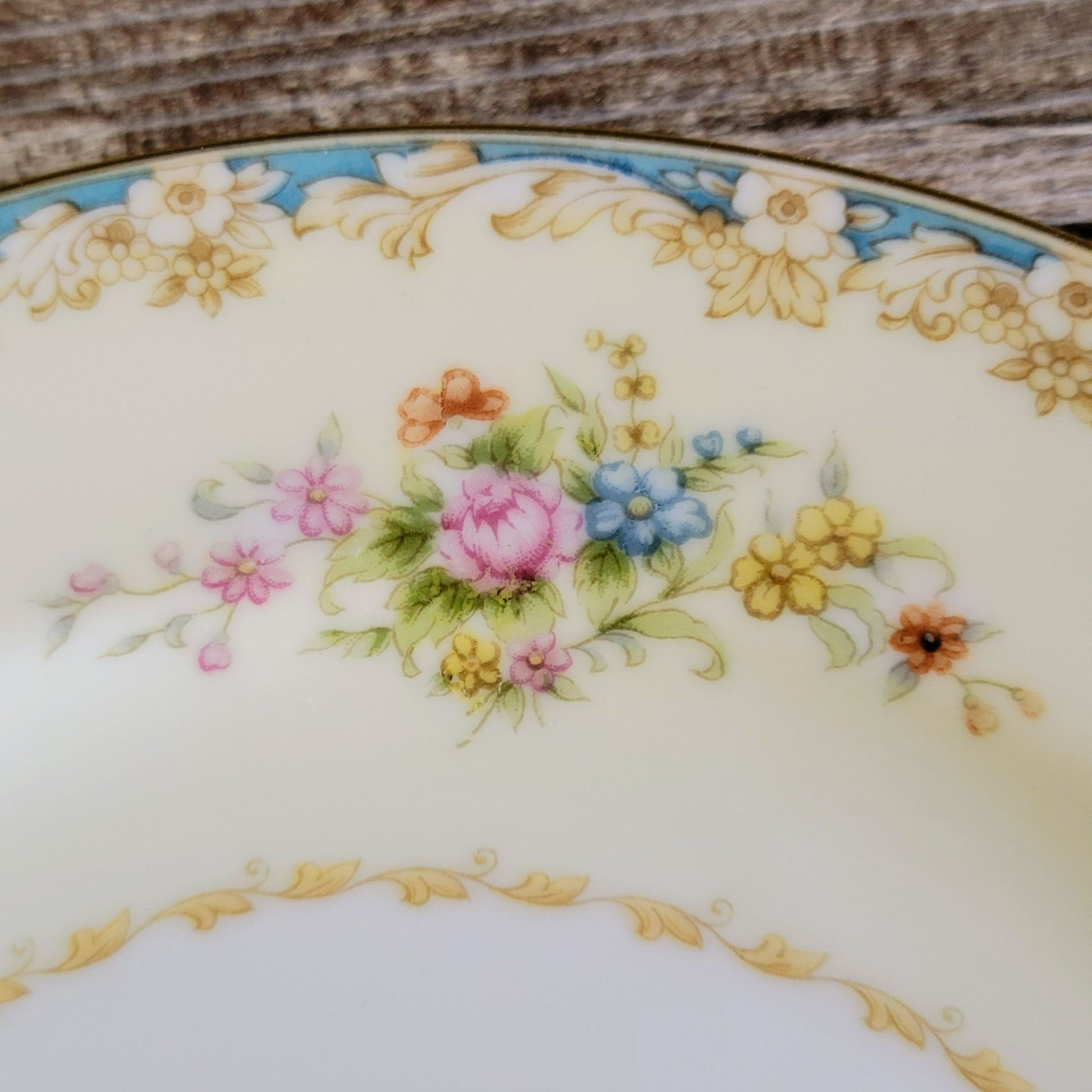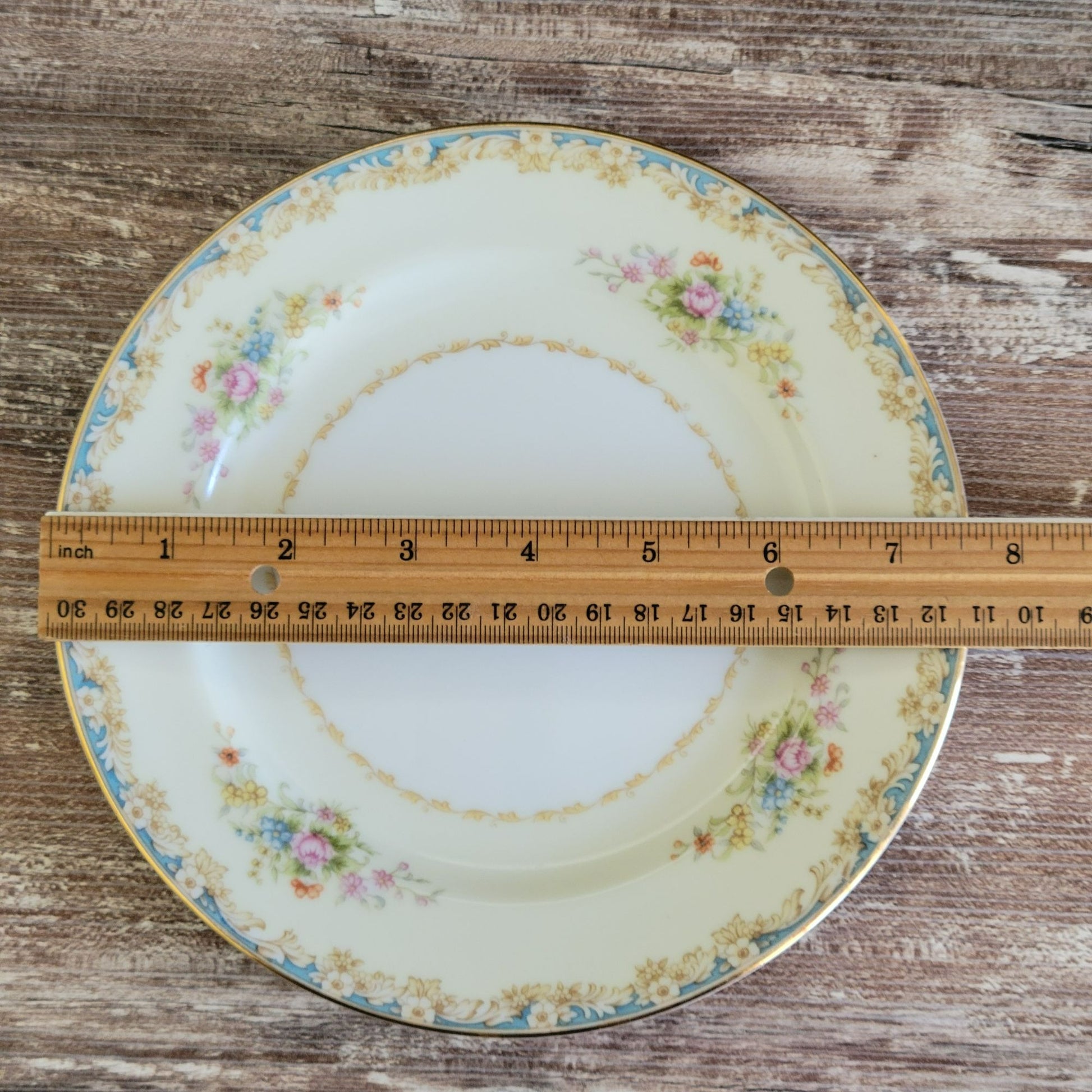 These 7 5/8" Rose China salad plates are gorgeous vintage plates from 1945-48. Pattern number is RO1. The cream porcelain is adorned with a blue and tan border and a floral spray for an elegant dining experience.
