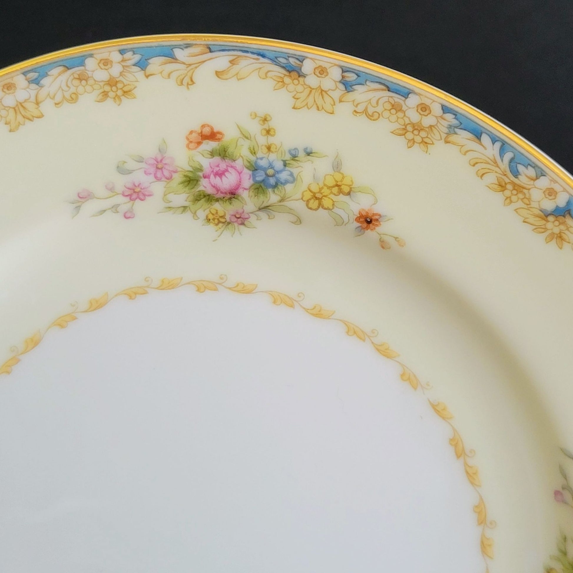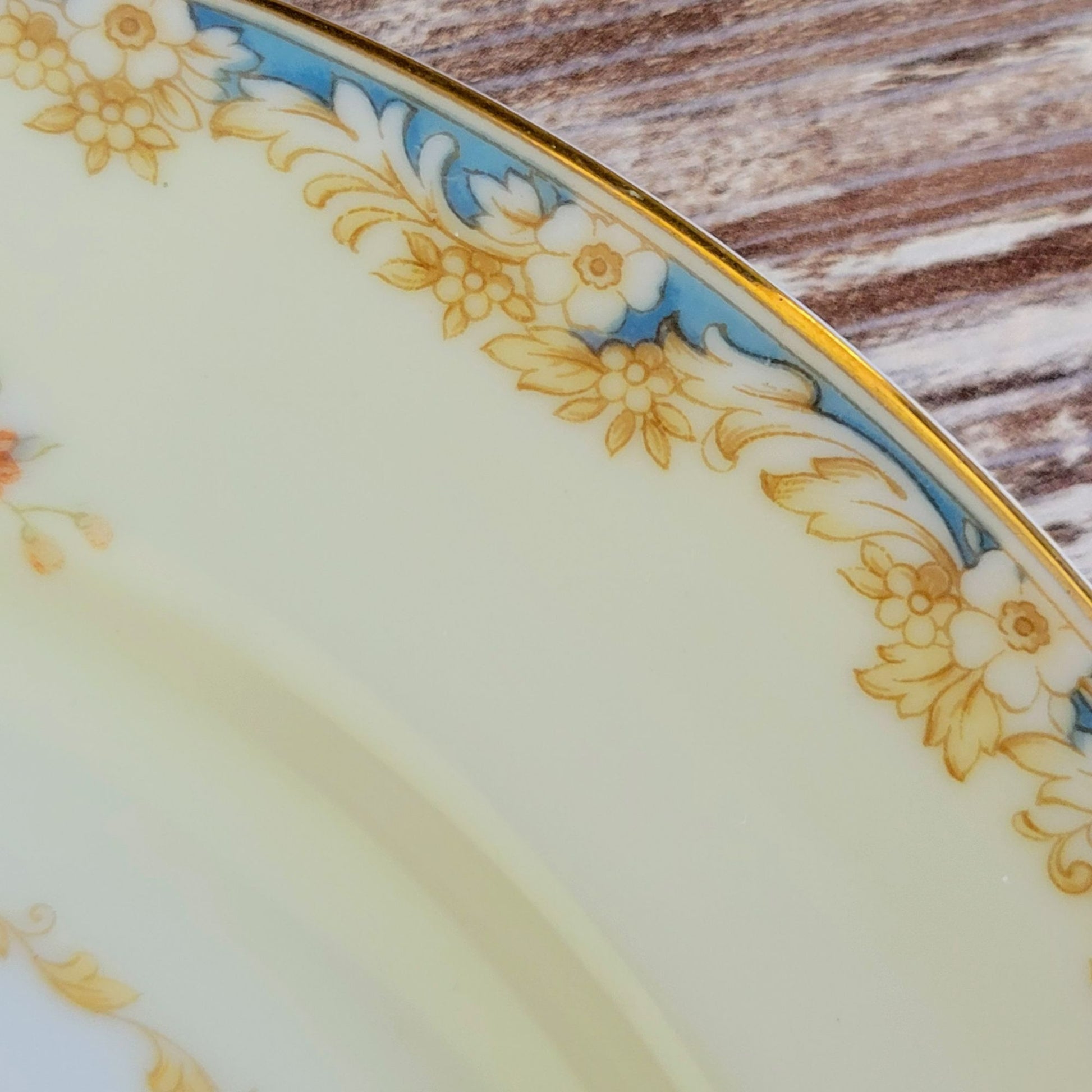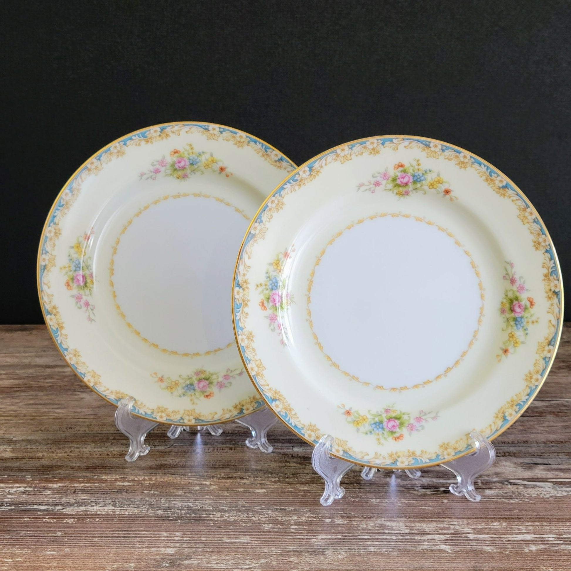 These 7 5/8" Rose China salad plates are gorgeous vintage plates from 1945-48. Pattern number is RO1. The cream porcelain is adorned with a blue and tan border and a floral spray for an elegant dining experience.