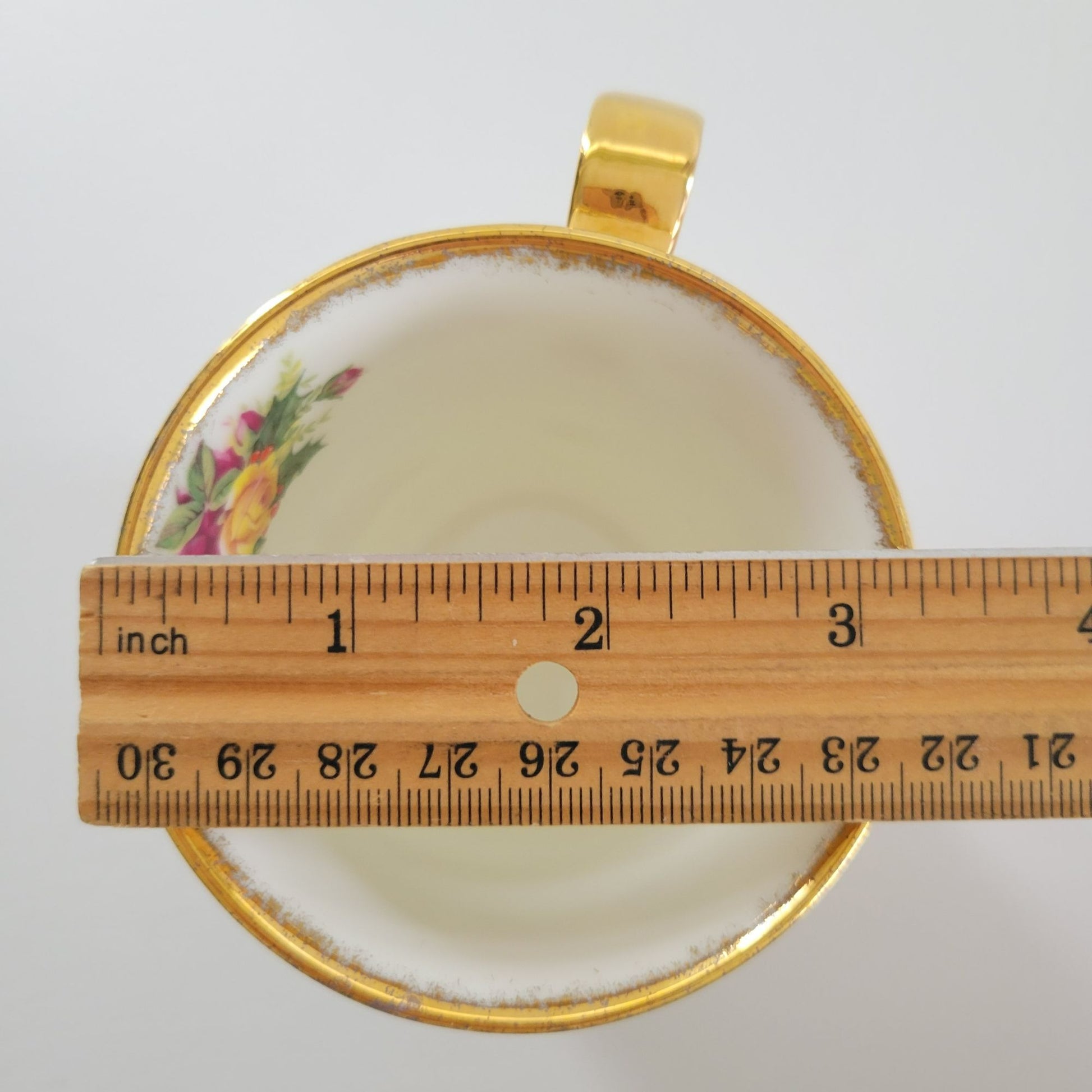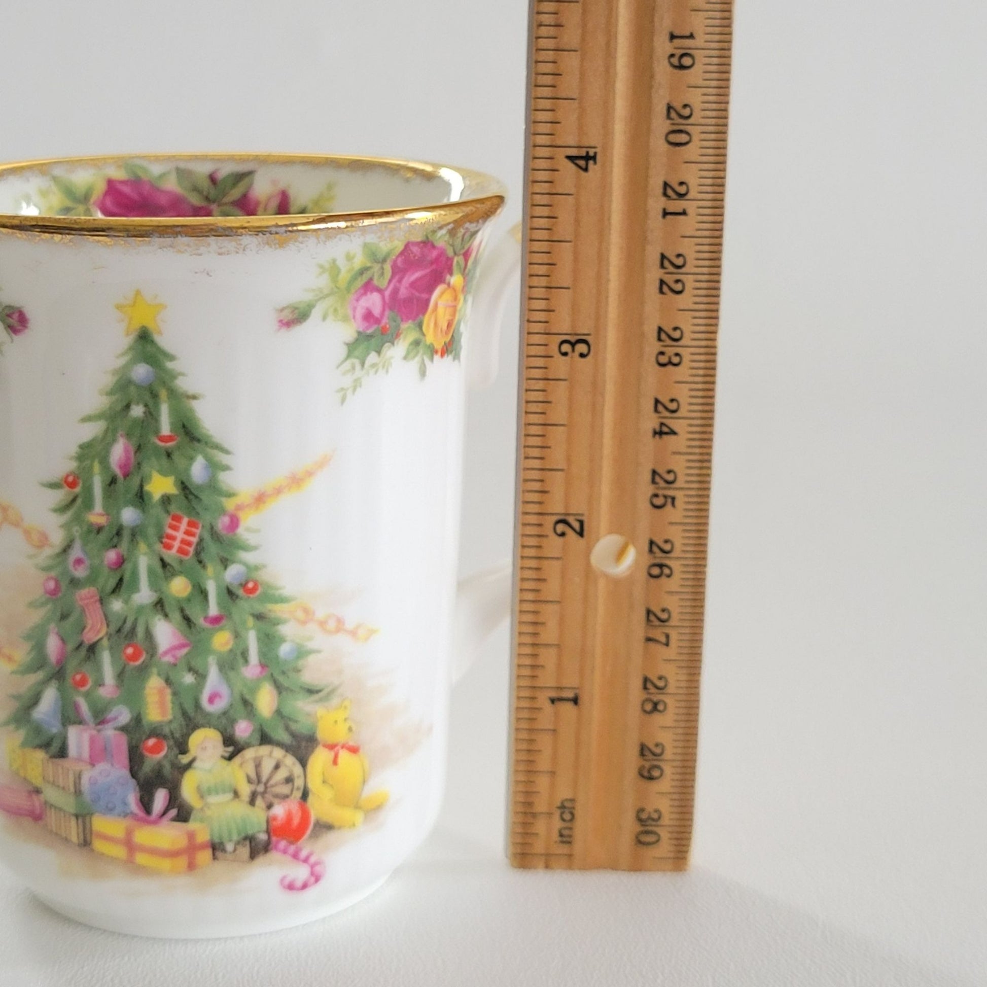This vintage Royal Albert mug showcases the 1990 "Christmas Magic" design. Adorned with a Christmas tree, gifts, and old country roses accents, it radiates nostalgic charm.