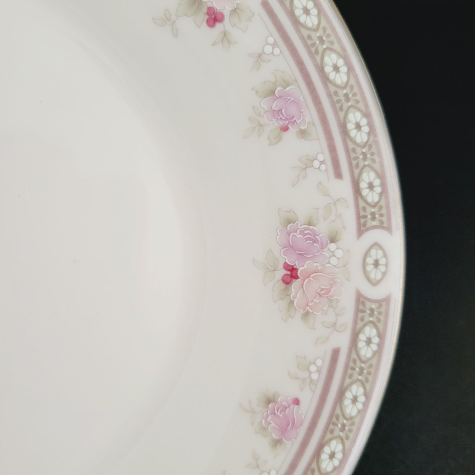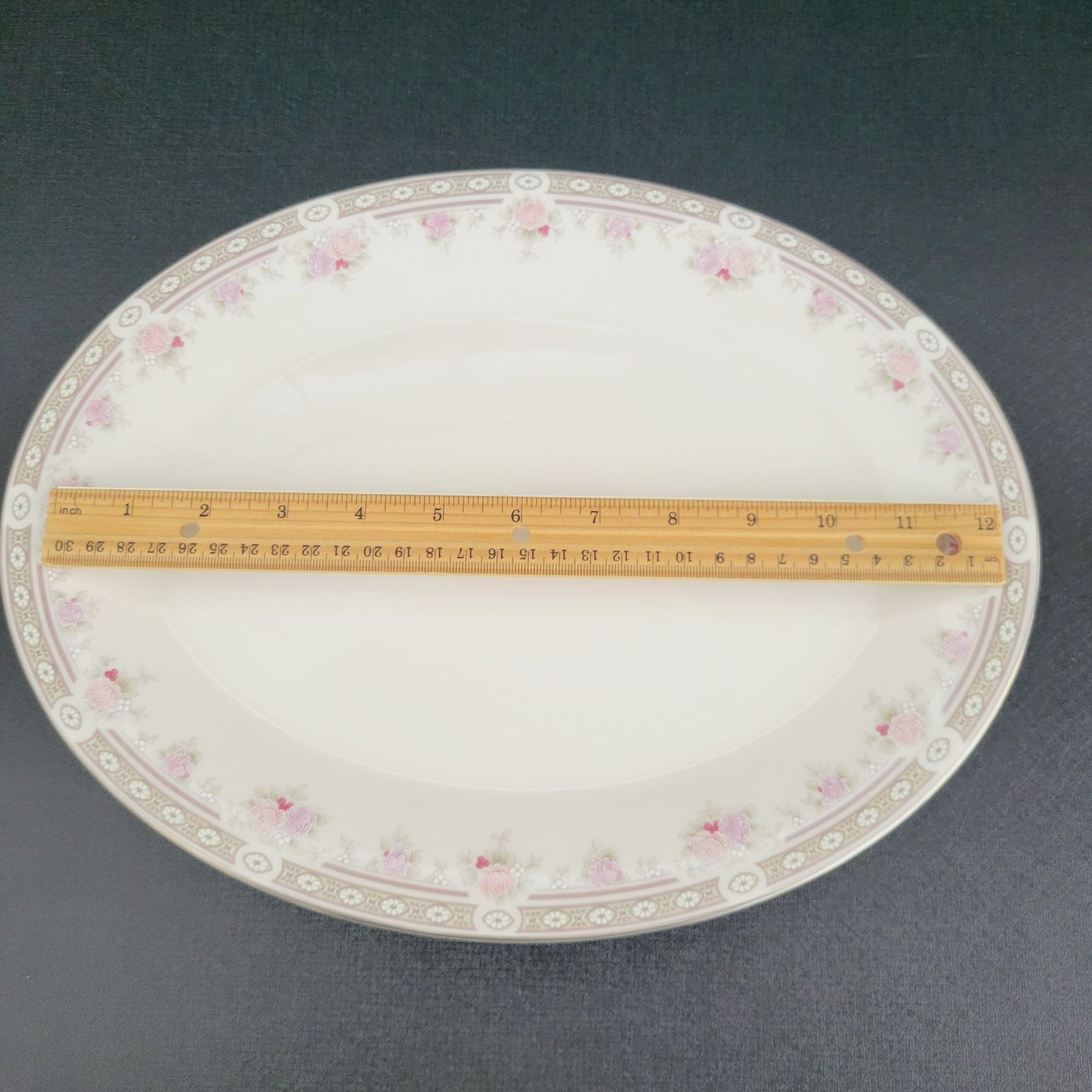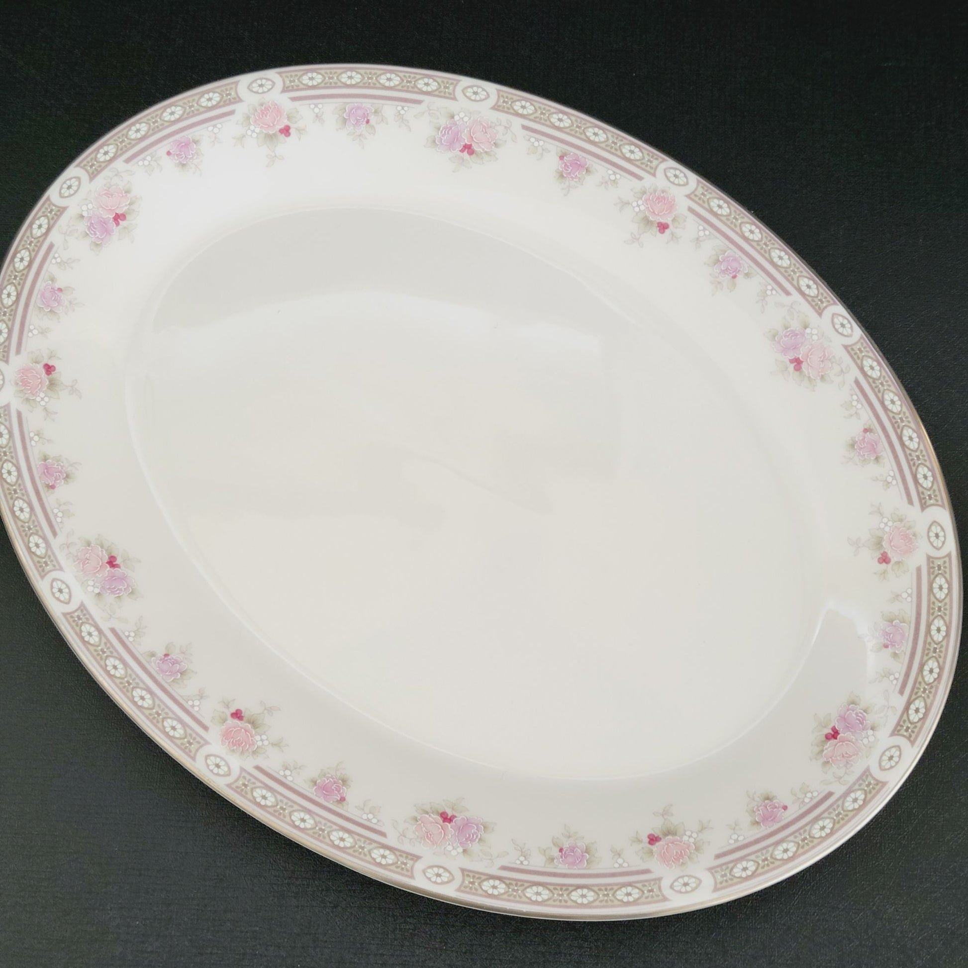 This vintage Royal Doulton serving platter from the 1980s Vogue Collection features elegant pink and purple rose designs on an off-white base. Made of fine Porcelain in England, it measures 13.25"x10".