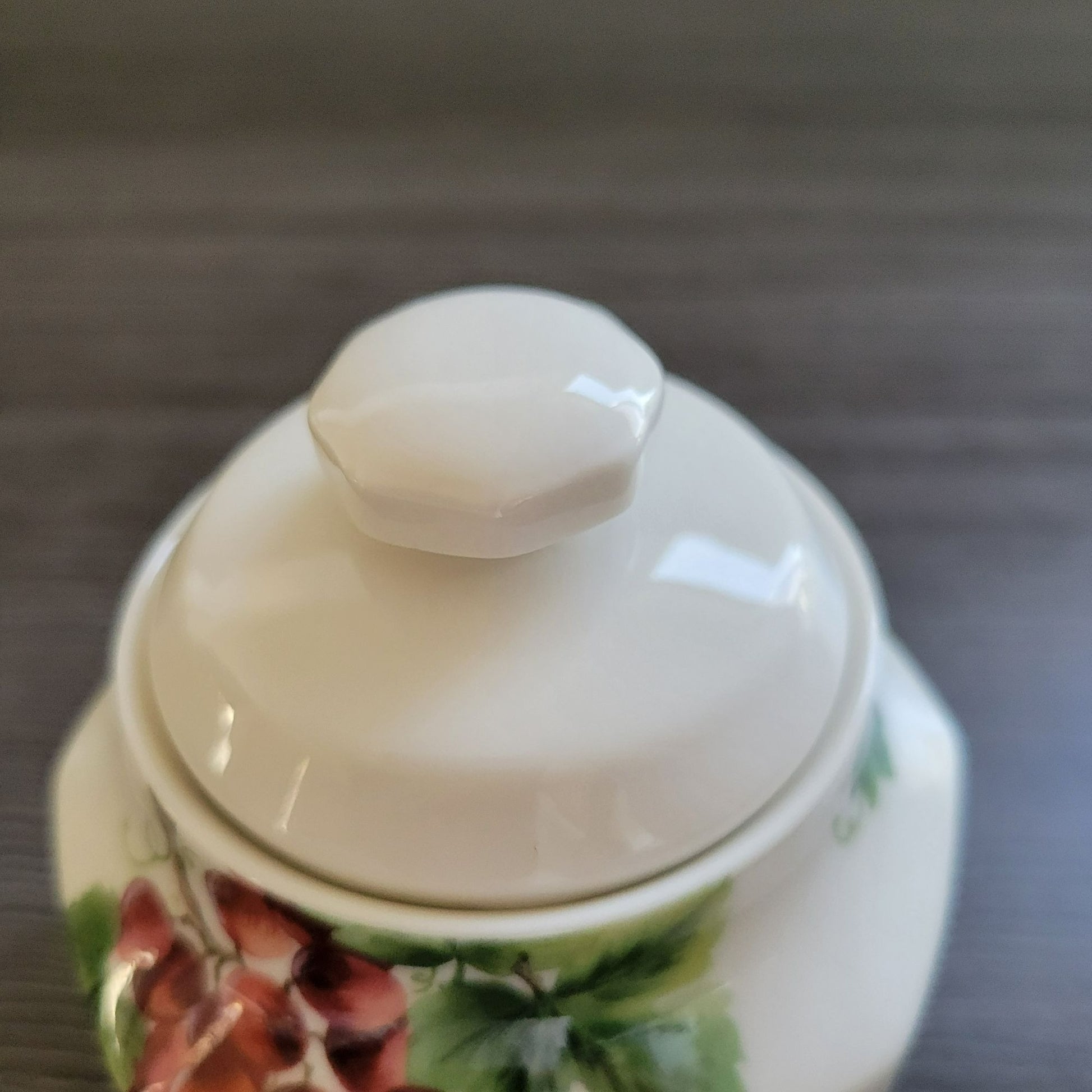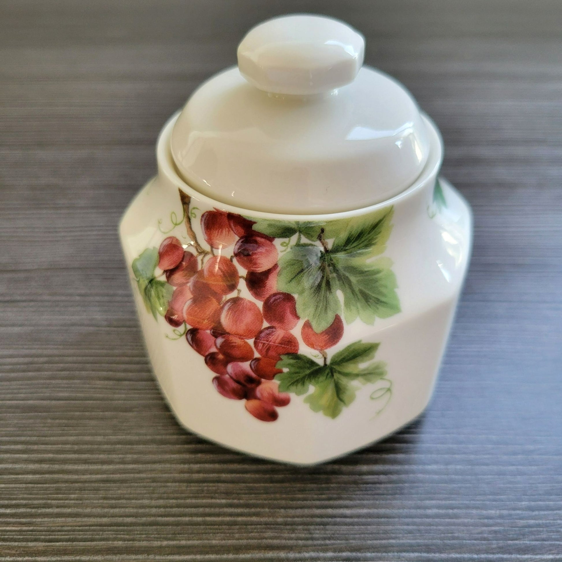 Royal Doulton Vintage Grape Creamer & Sugar Bowl from the 1990s in fine china. White with multi-color fruit motifs. Holds 12 fl. oz. Perfect for fall gatherings.