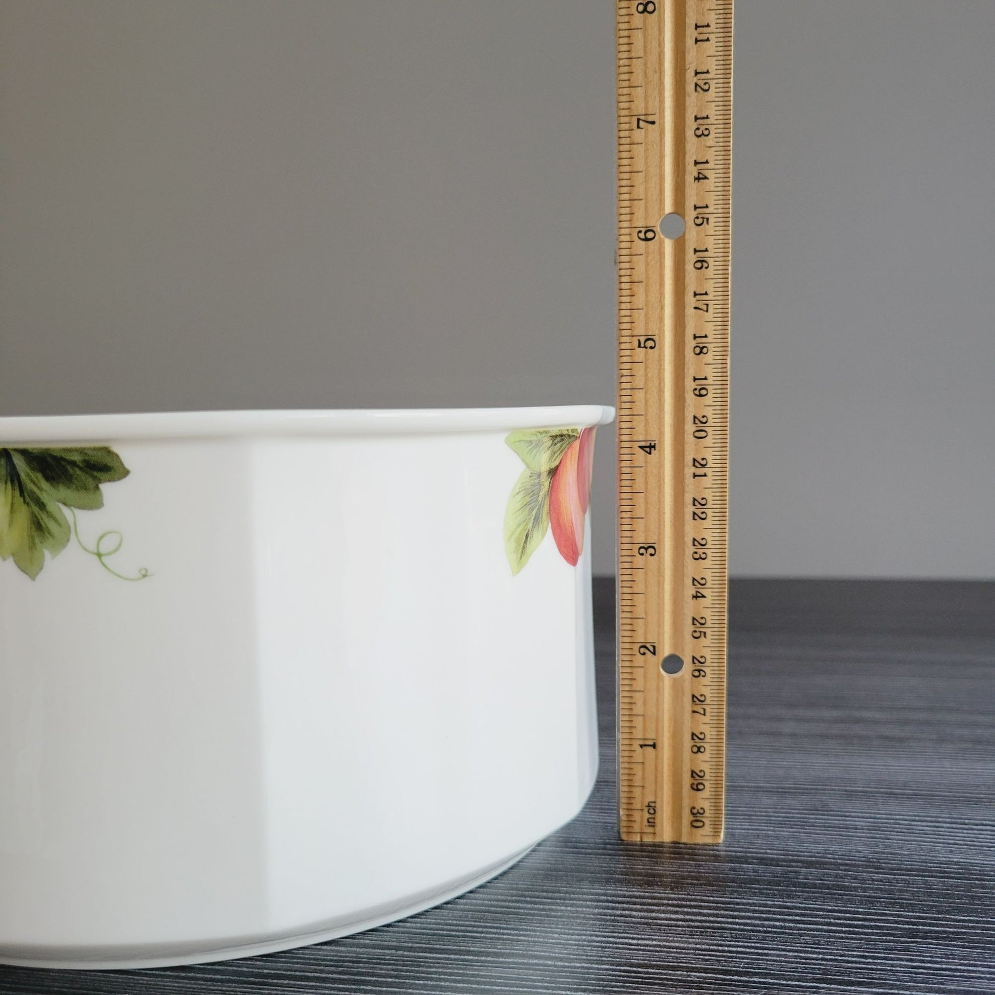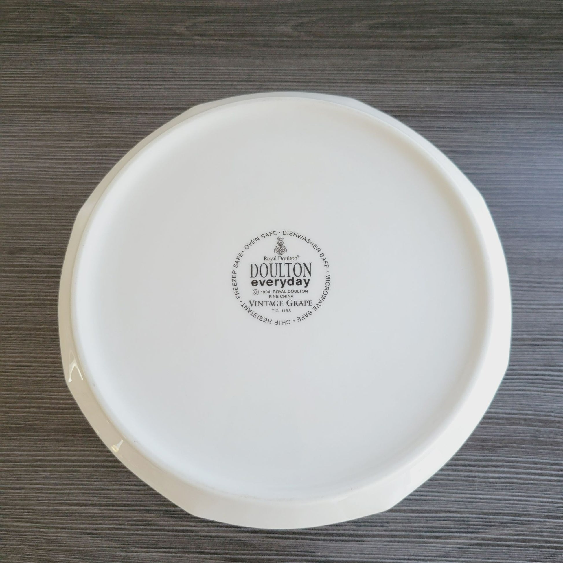 Royal Doulton Vintage Grape 9" Salad Serving Bowl features intricate grapevine patterns, perfect for adding elegance to your dining experience. Made in England from fine china, this 1990s dinnerware piece combines durability with timeless beauty.