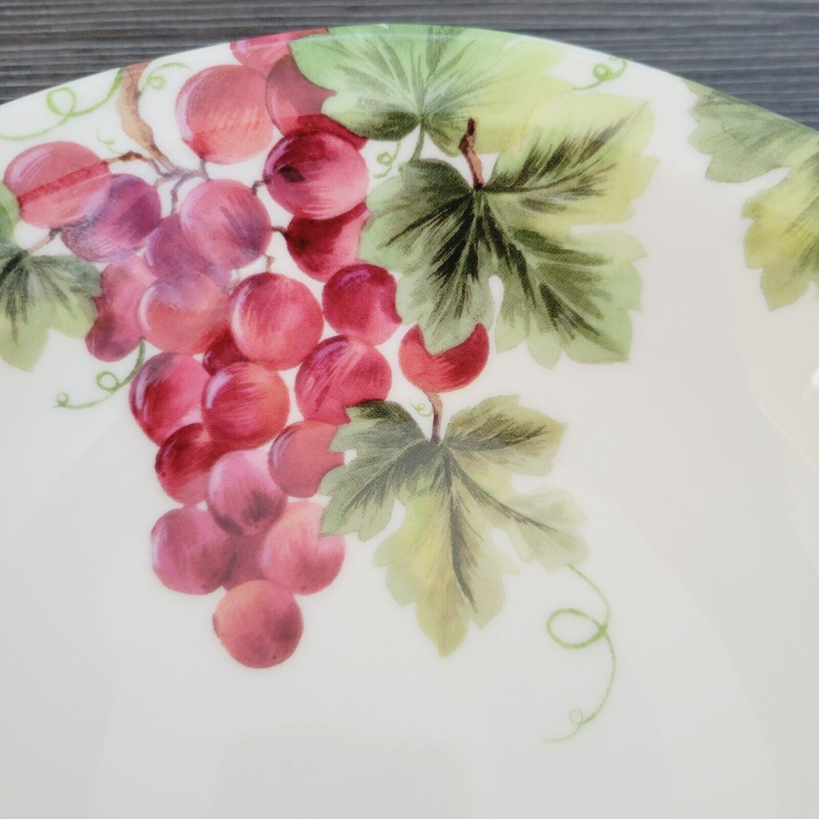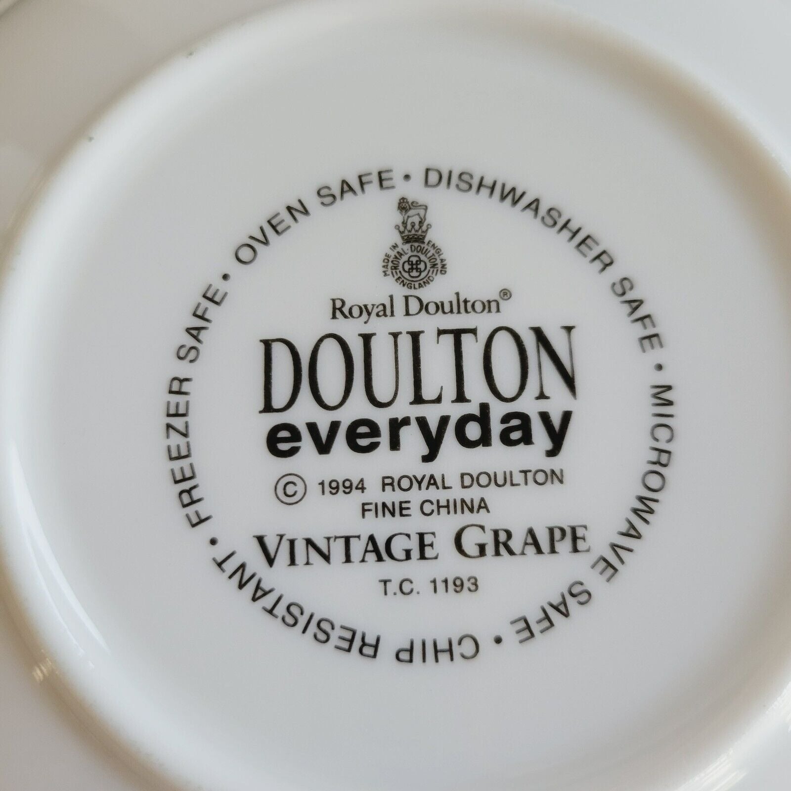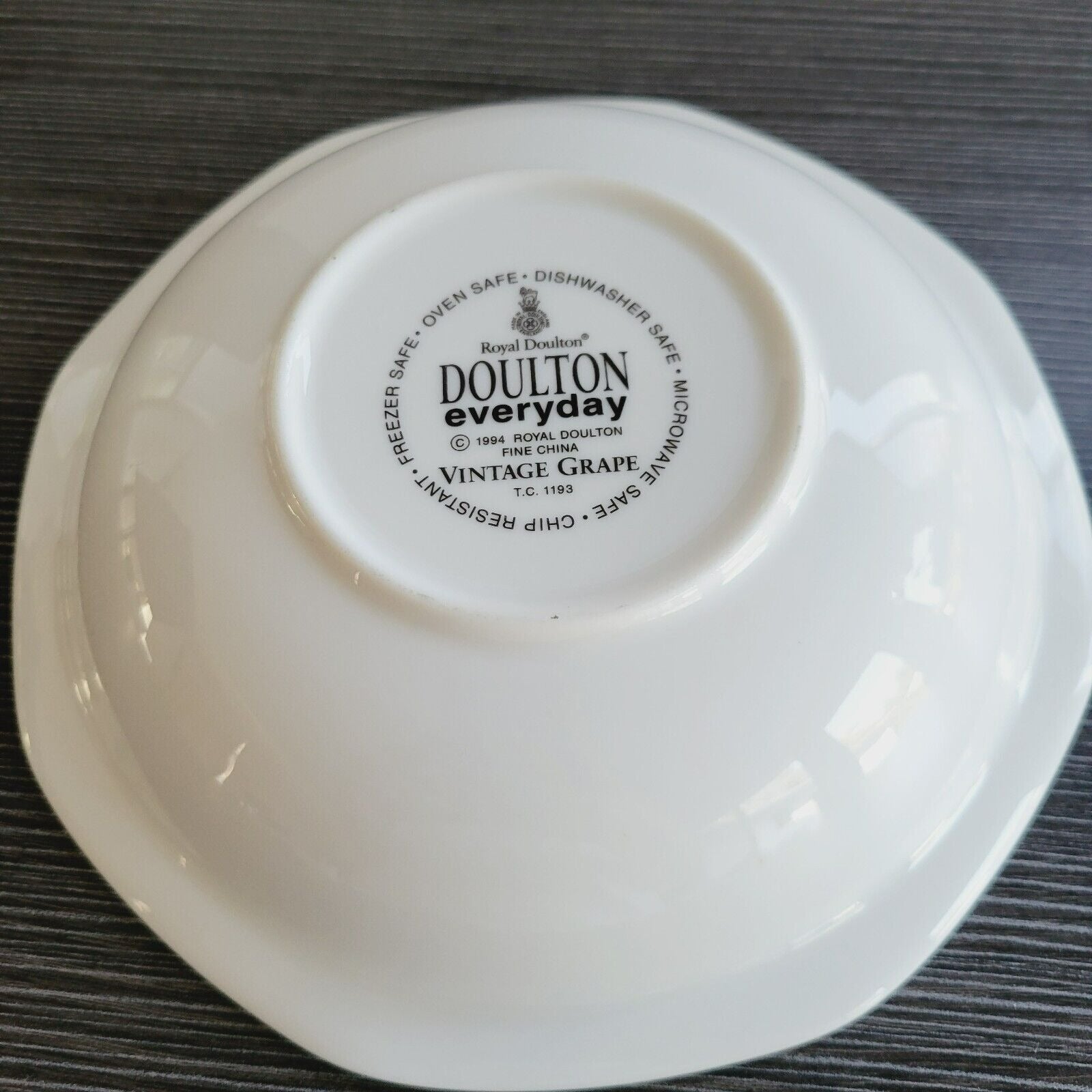 Royal Doulton Vintage Grape Soup/Cereal Bowl features intricate fruit pattern, perfect for adding elegance to your dining experience. Made in England from fine china, this 1990s dinnerware piece combines durability with timeless beauty.