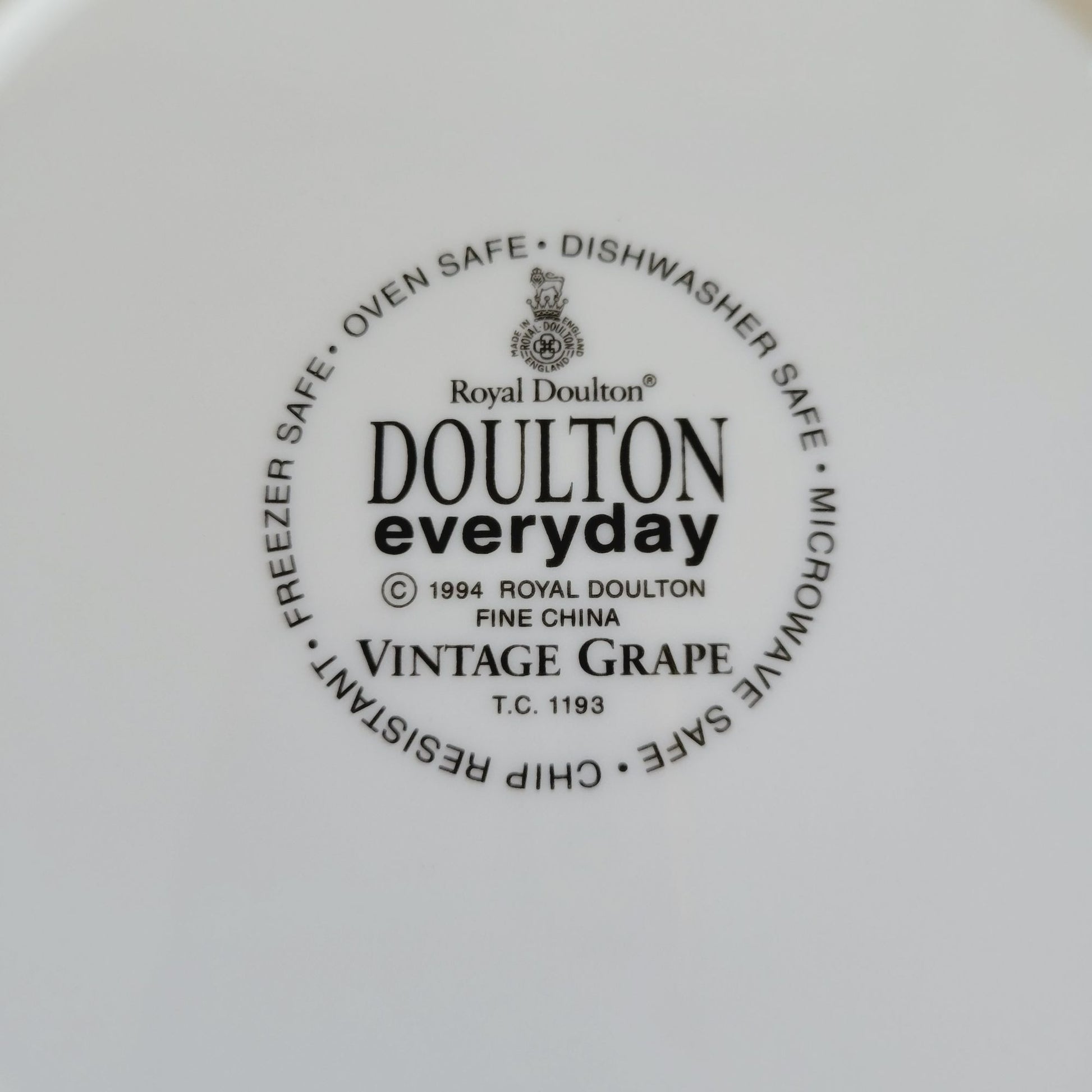 Royal Doulton Vintage Grape Salad Plate from the 1990s features a white plate adorned with multi-colored fruit designs. This fine china piece adds elegance to any dinnerware collection.