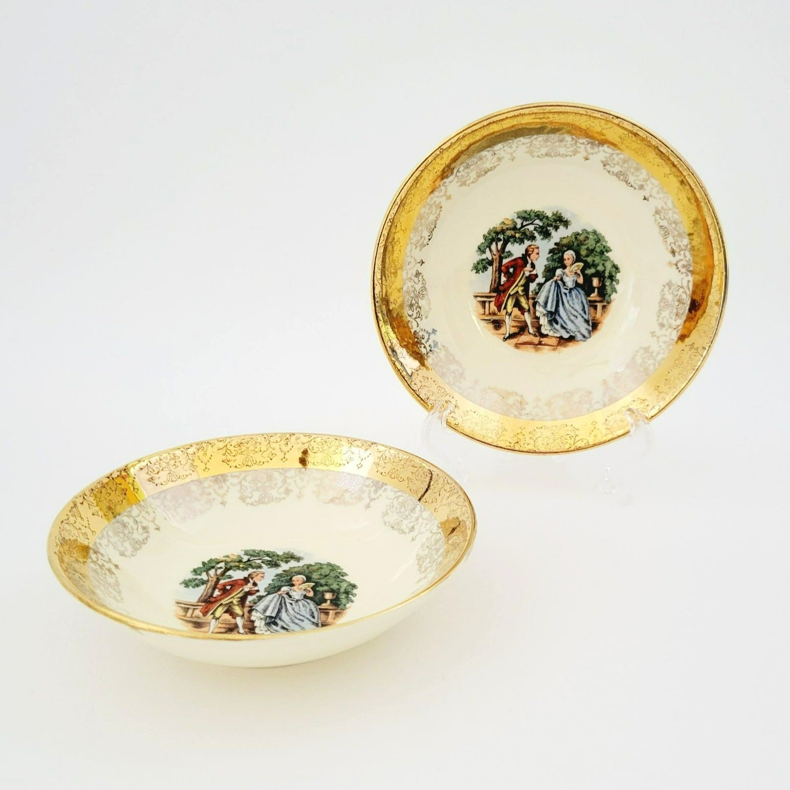 Elegant Sabin Crest O Gold George & Martha Berry Bowls (2) featuring a Colonial Courting Couple motif. These 5.5" porcelain bowls are cream with a gold filigree edge, offering a touch of Rococo elegance.