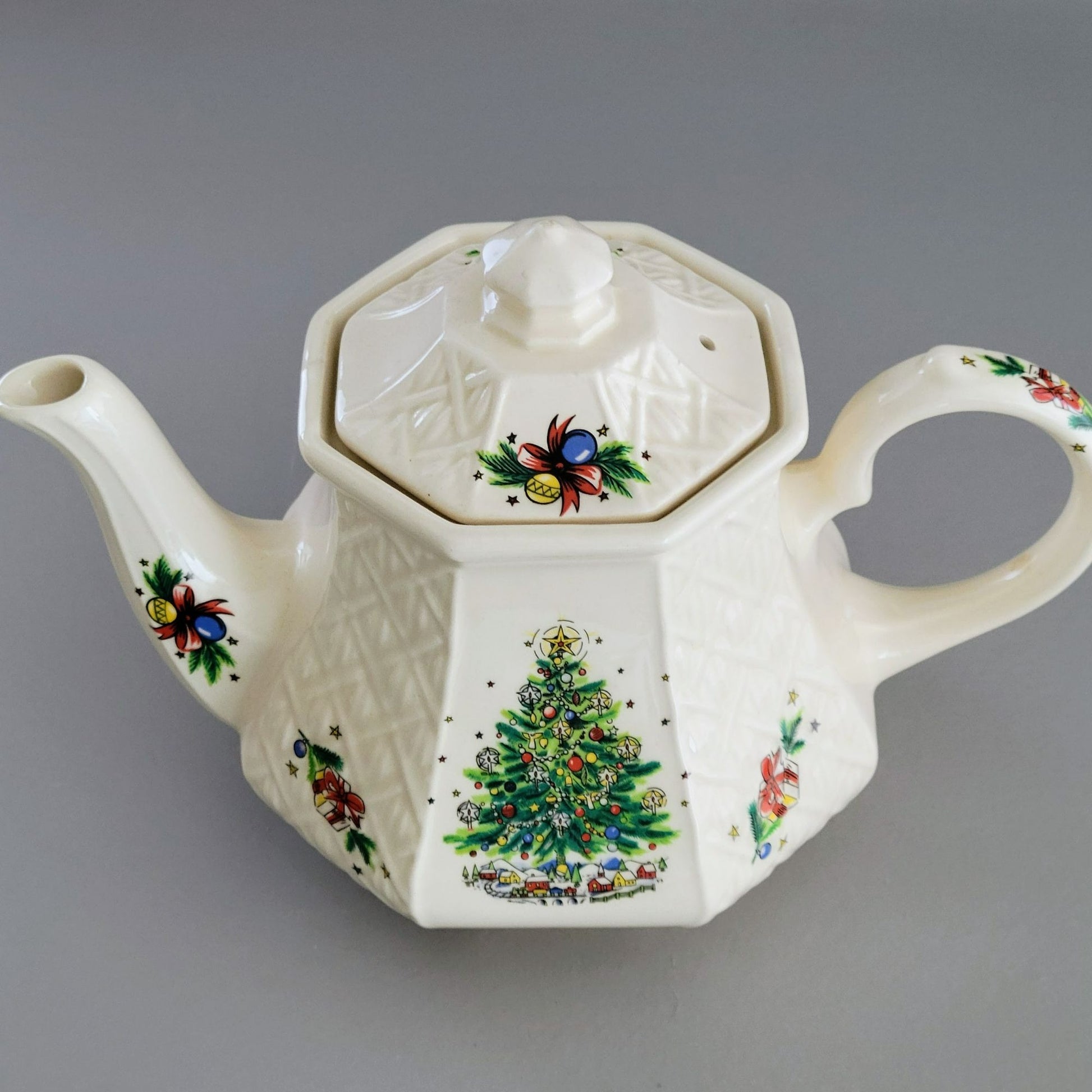 This charming vintage Sadler teapot captures the holiday spirit with its festive Christmas tree design. Crafted from earthenware its lattice texture adds elegance, while intricate hand-painted accents evoke nostalgia for cozy holiday gatherings. A timeless collectible for tea enthusiasts and seasonal decorators alike.