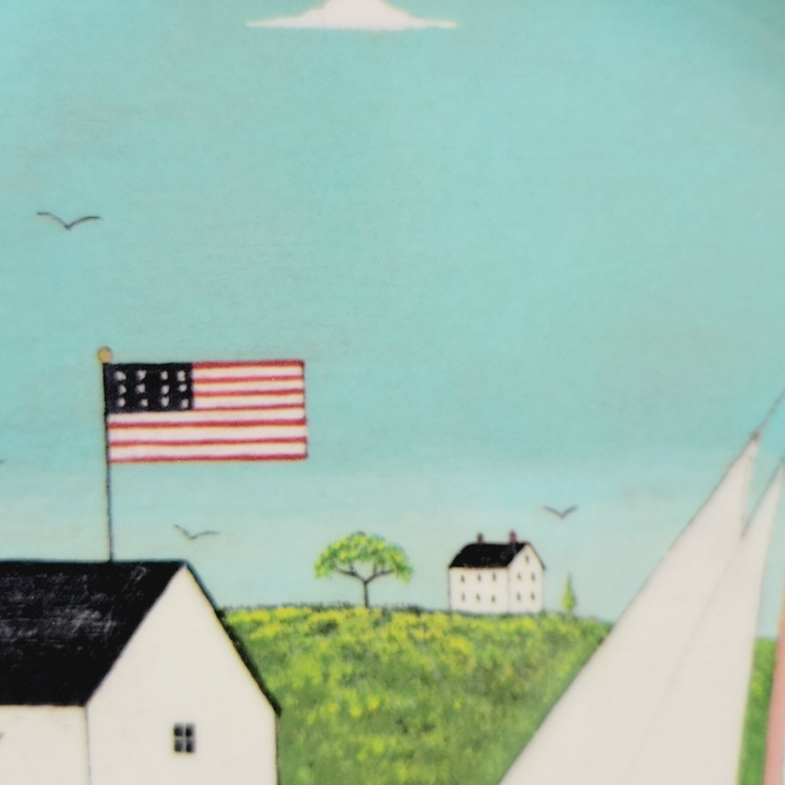 Vintage Coastal Breeze Plastic Salad Plate Set features a charming folk art design by Warren Kimble, showcasing lighthouses, ocean, and flags. This discontinued dinnerware by Sakura is perfect for collectors or everyday use. Durable and lightweight, these plates add a coastal charm to your dining experience.