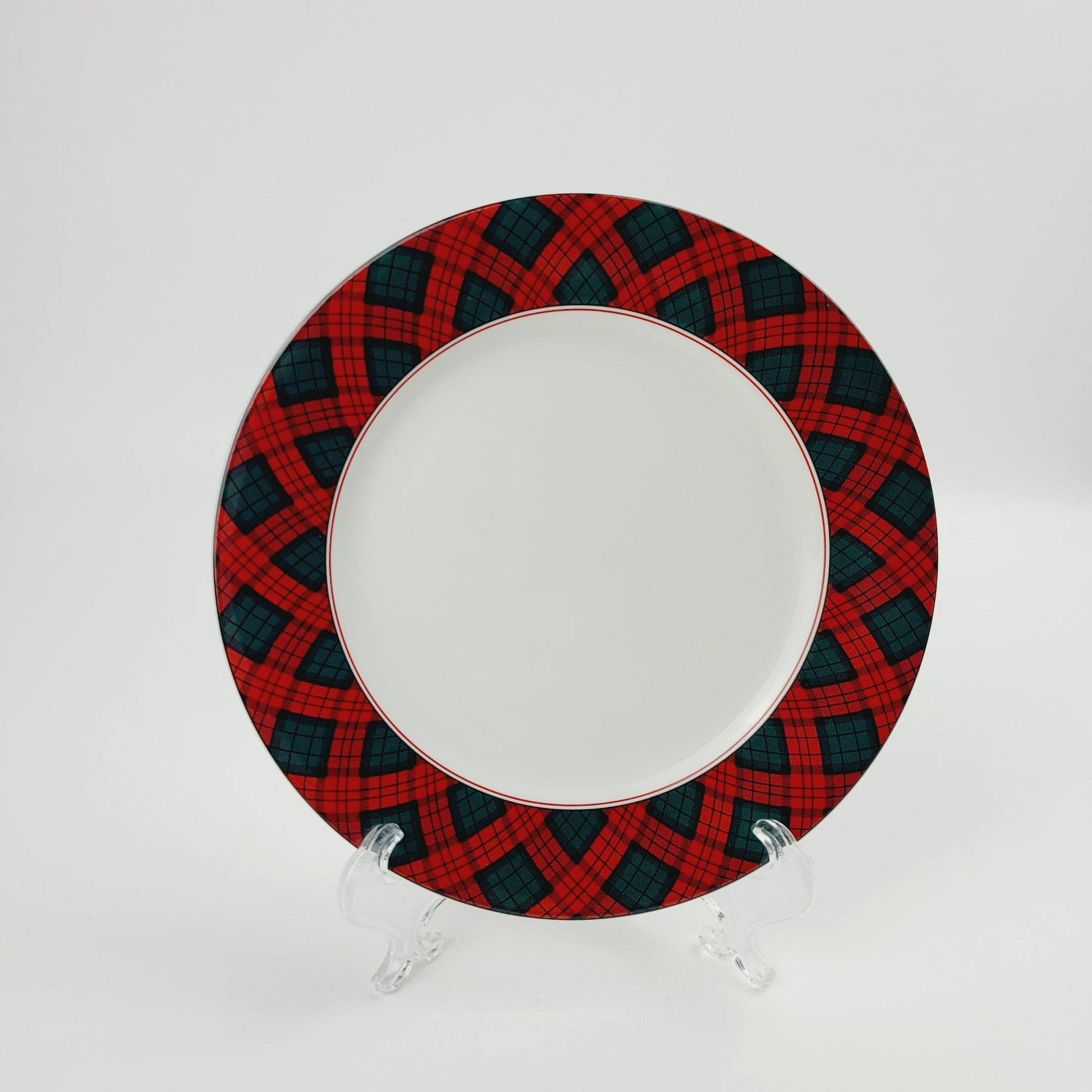 Elegant Sasaki Tartan Bread Plate with a deep red and green plaid design by Charles Roberts, made in Japan in the 1990s. Perfect for winter dinnerware collections and as a discontinued replacement piece to complement your set.