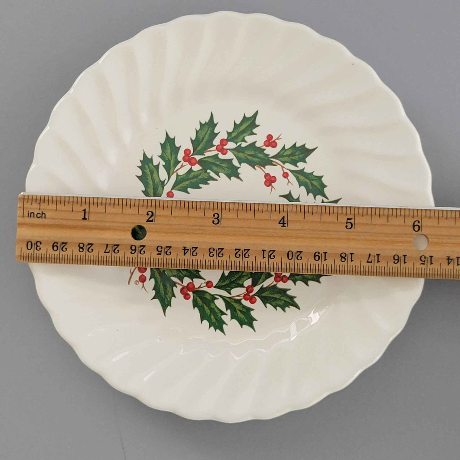 Add a touch of vintage charm to your holiday table with these Scio Holly bread plates. Featuring a scalloped edge and classic red and green holly berry design in the center, this platter is perfect for serving festive dishes.