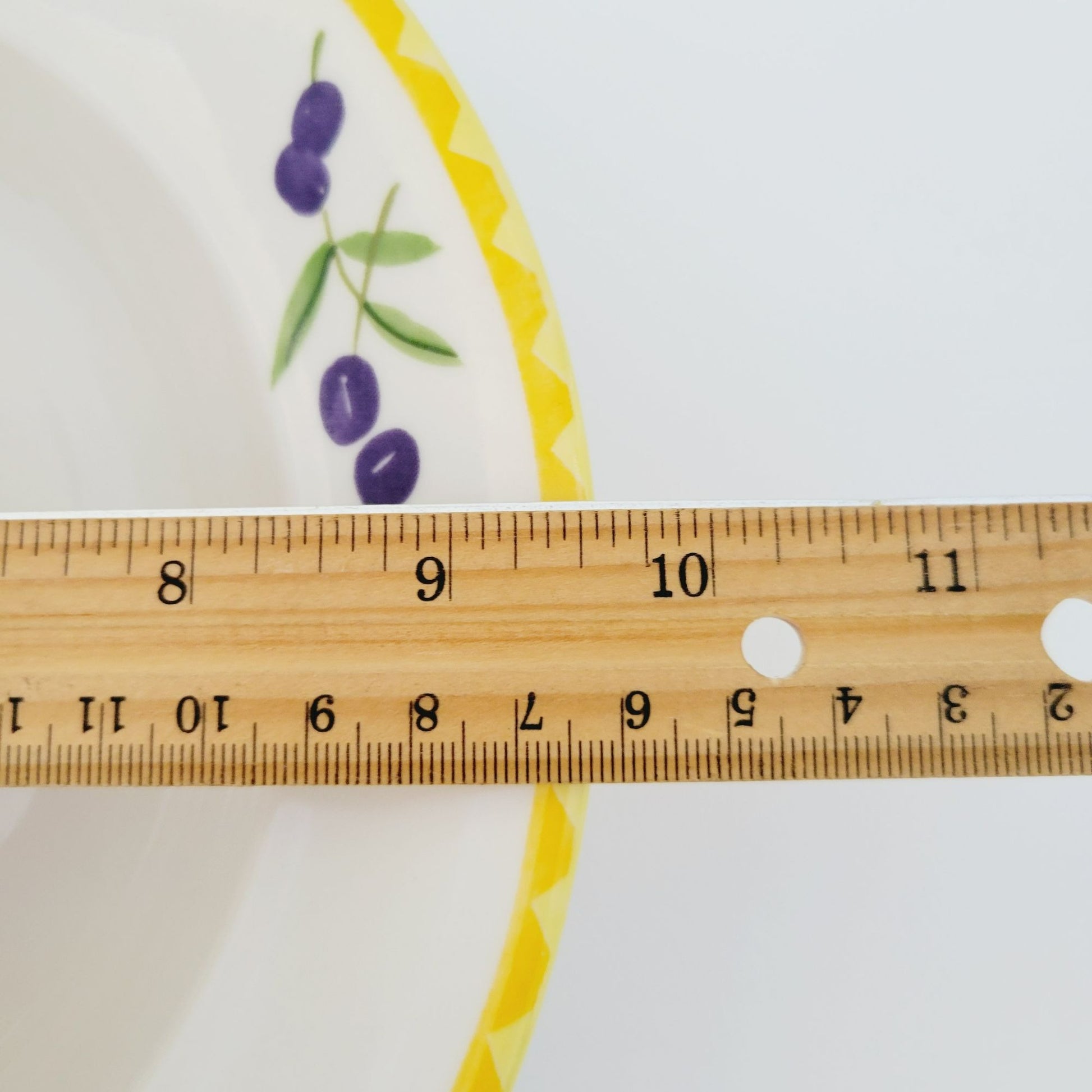 A Studio Nova Olive Branch Soup Bowl from 2002-2006. Beige stoneware with yellow trim, decorated with a purple and green olive design. Perfect as a replacement china piece or to add to your collection.