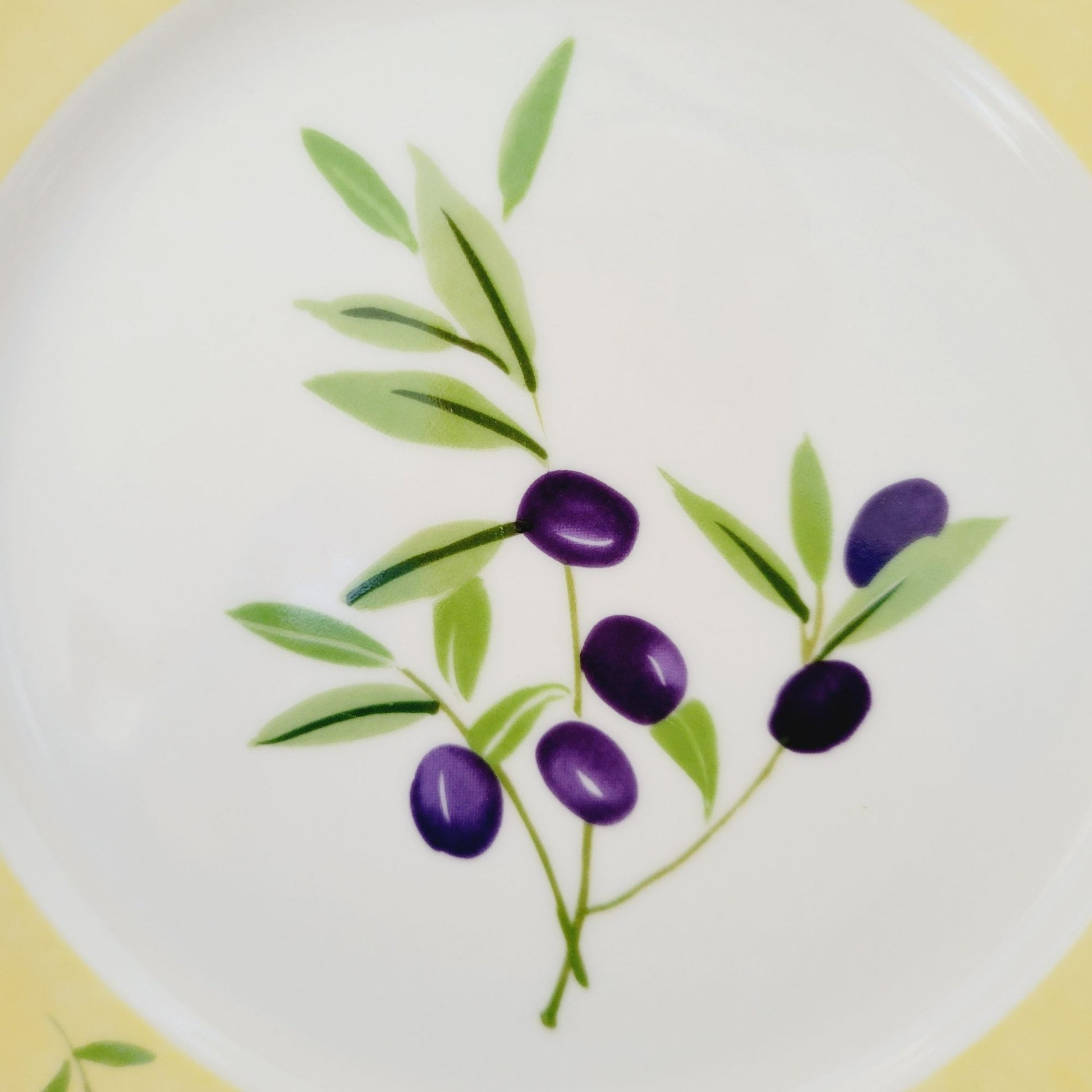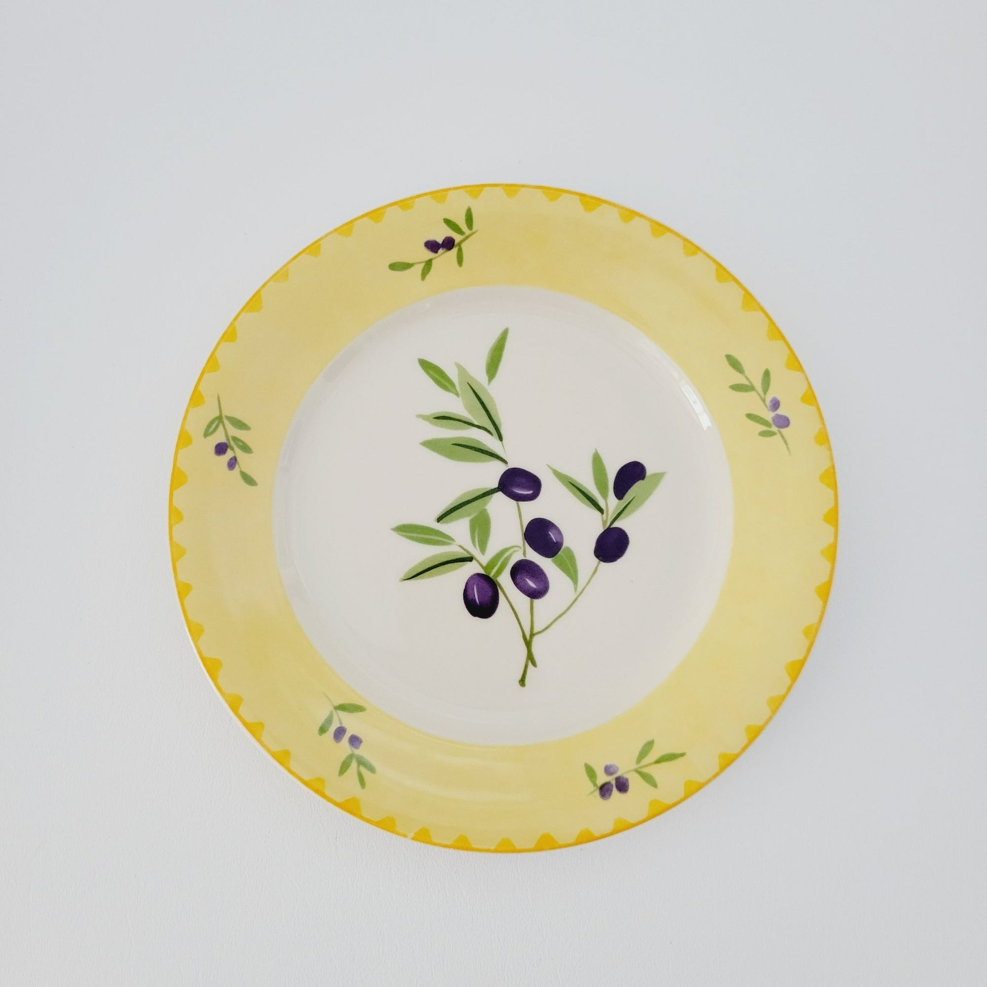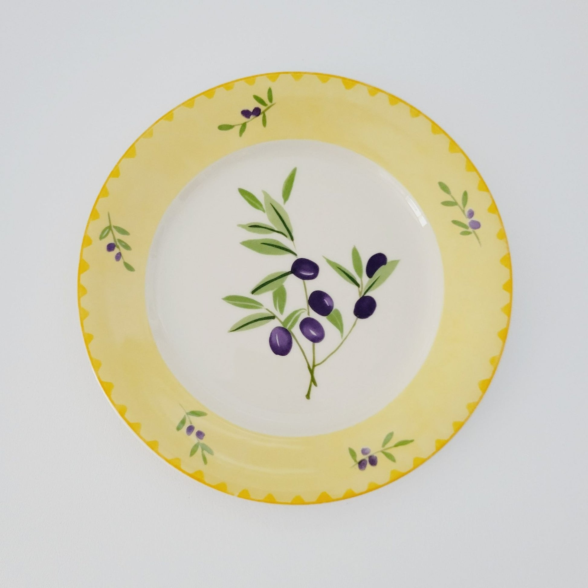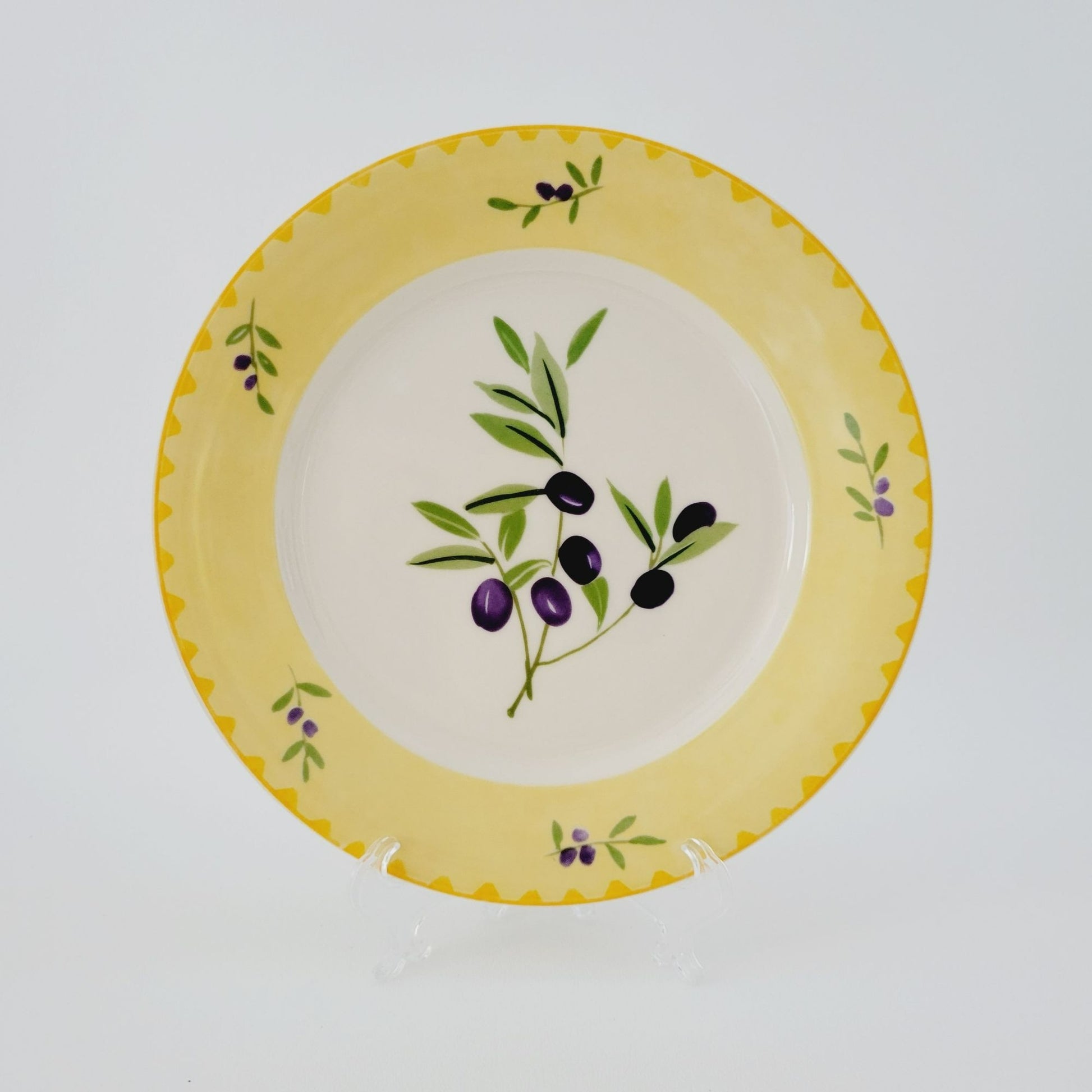 This Studio Nova Olive Branch salad plate, measuring 8.75", features a charming olive design in purple and green, framed by a yellow trim. Manufactured between 2002-2006, it's perfect as replacement china.