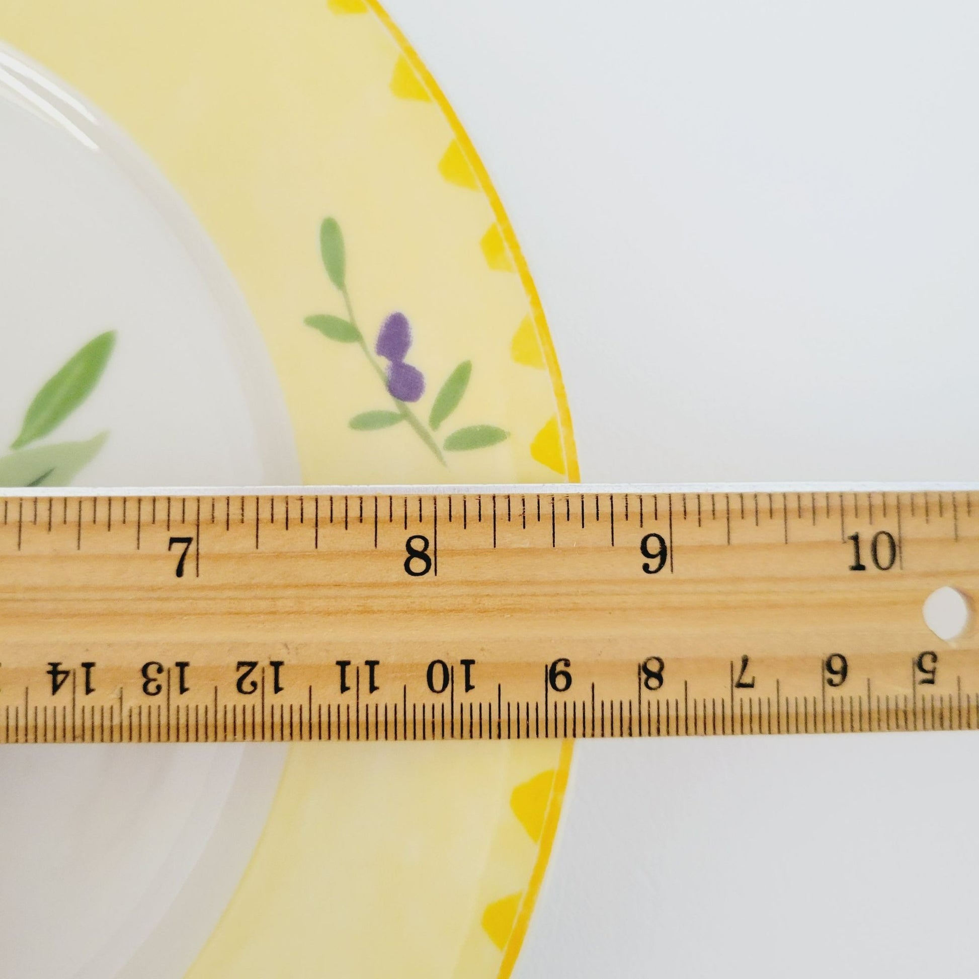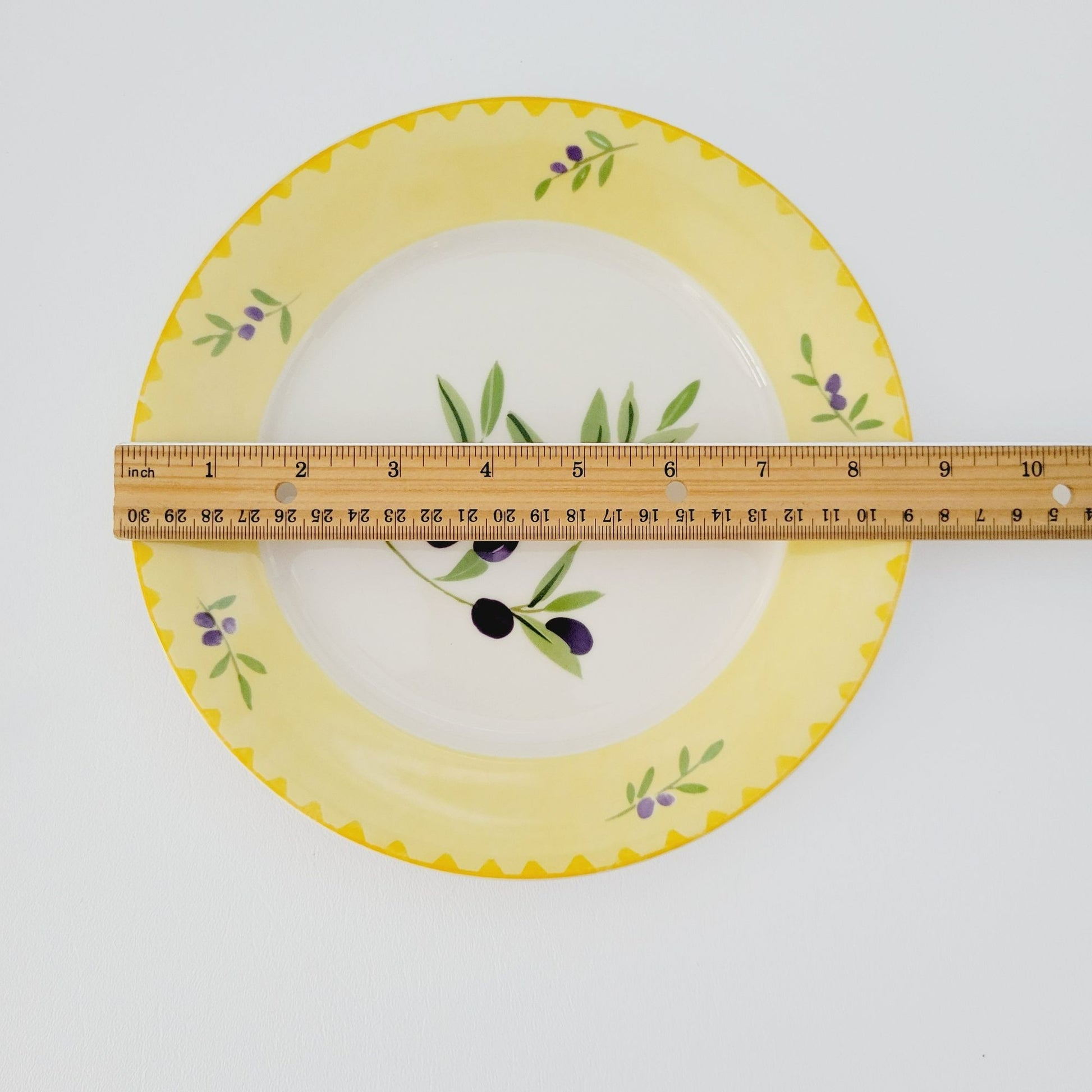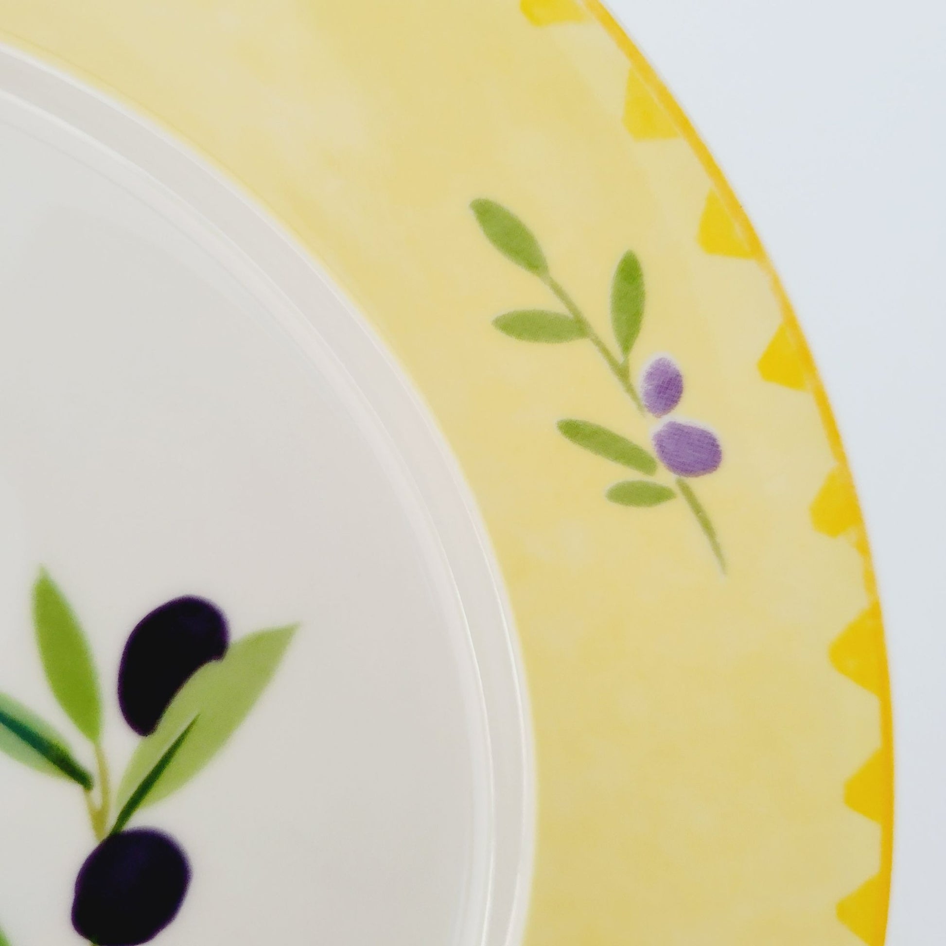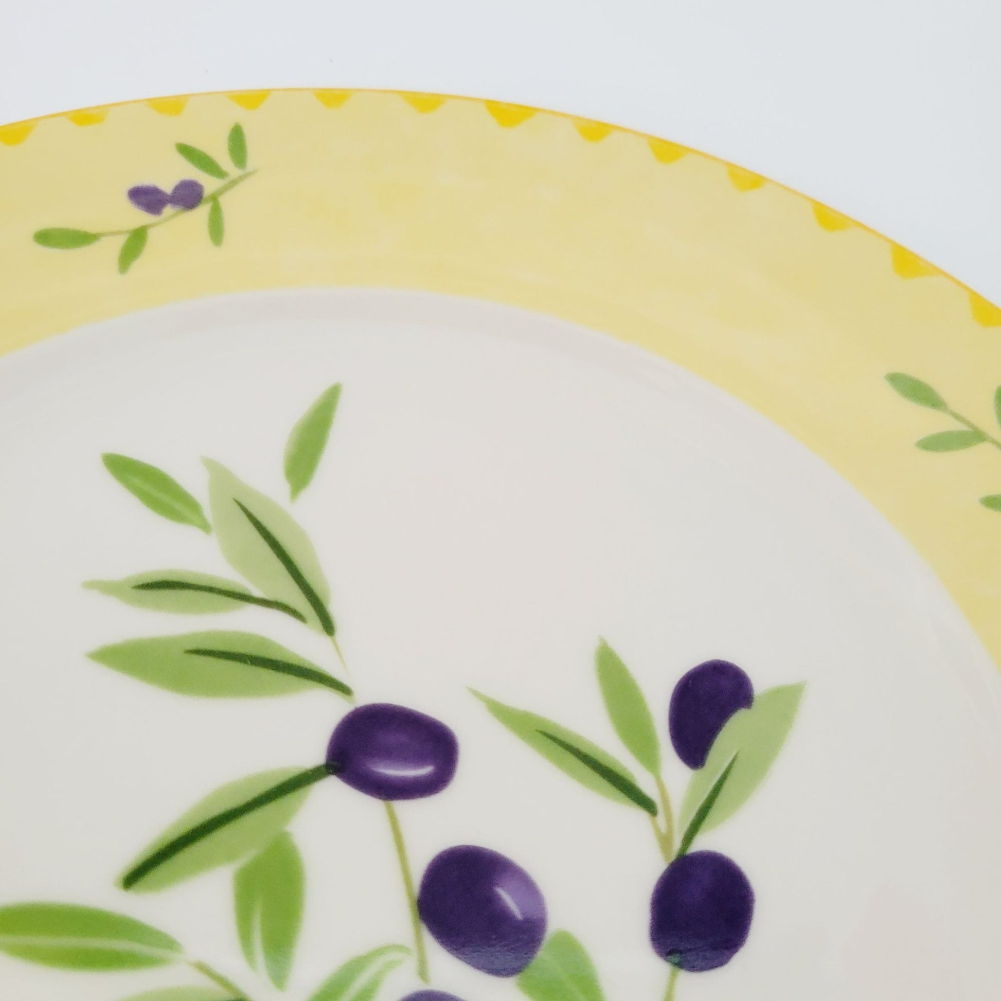 This Studio Nova Olive Branch salad plate, measuring 8.75", features a charming olive design in purple and green, framed by a yellow trim. Manufactured between 2002-2006, it's perfect as replacement china.