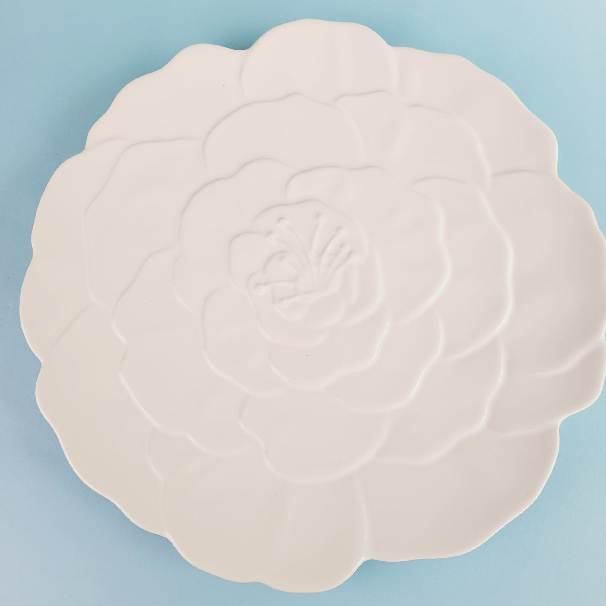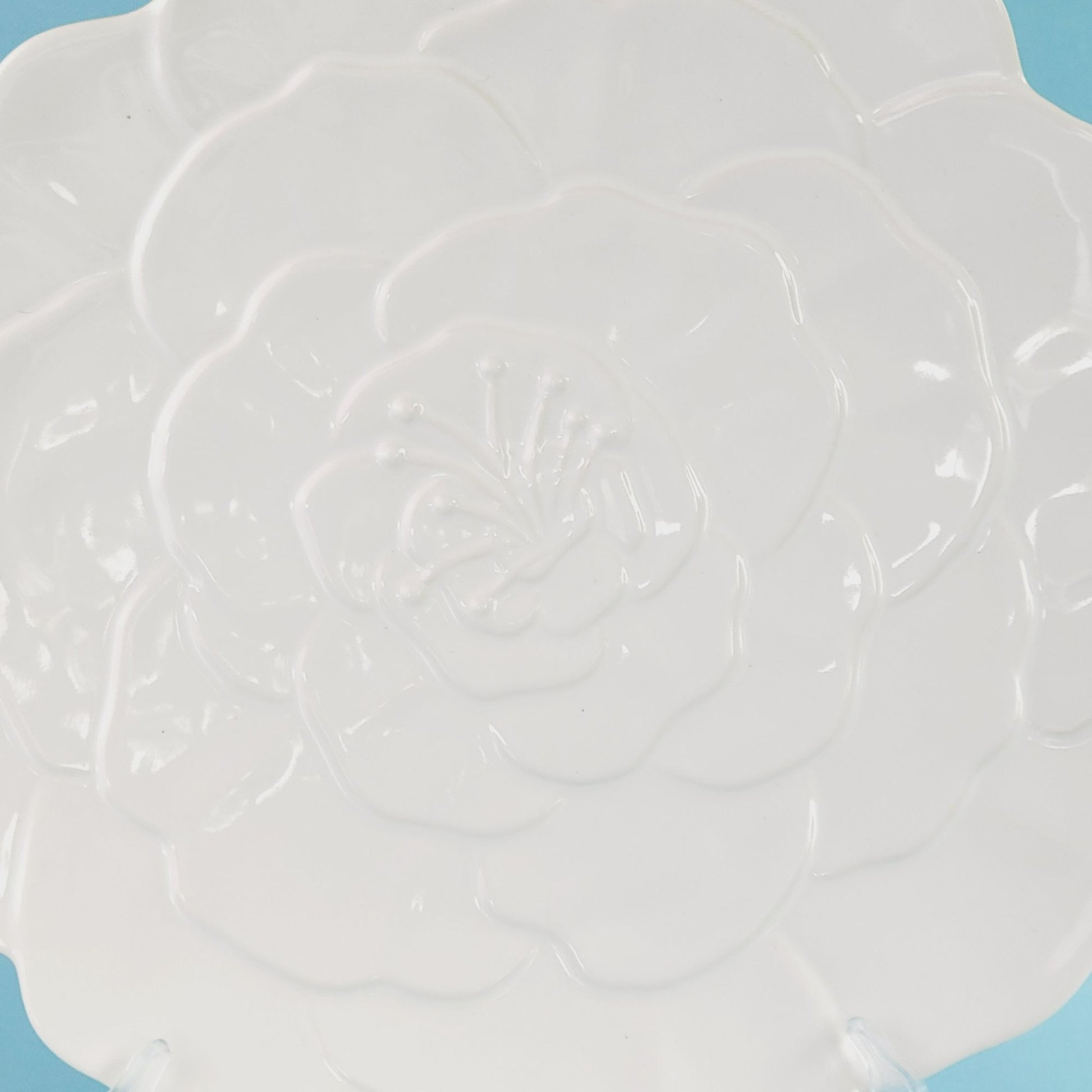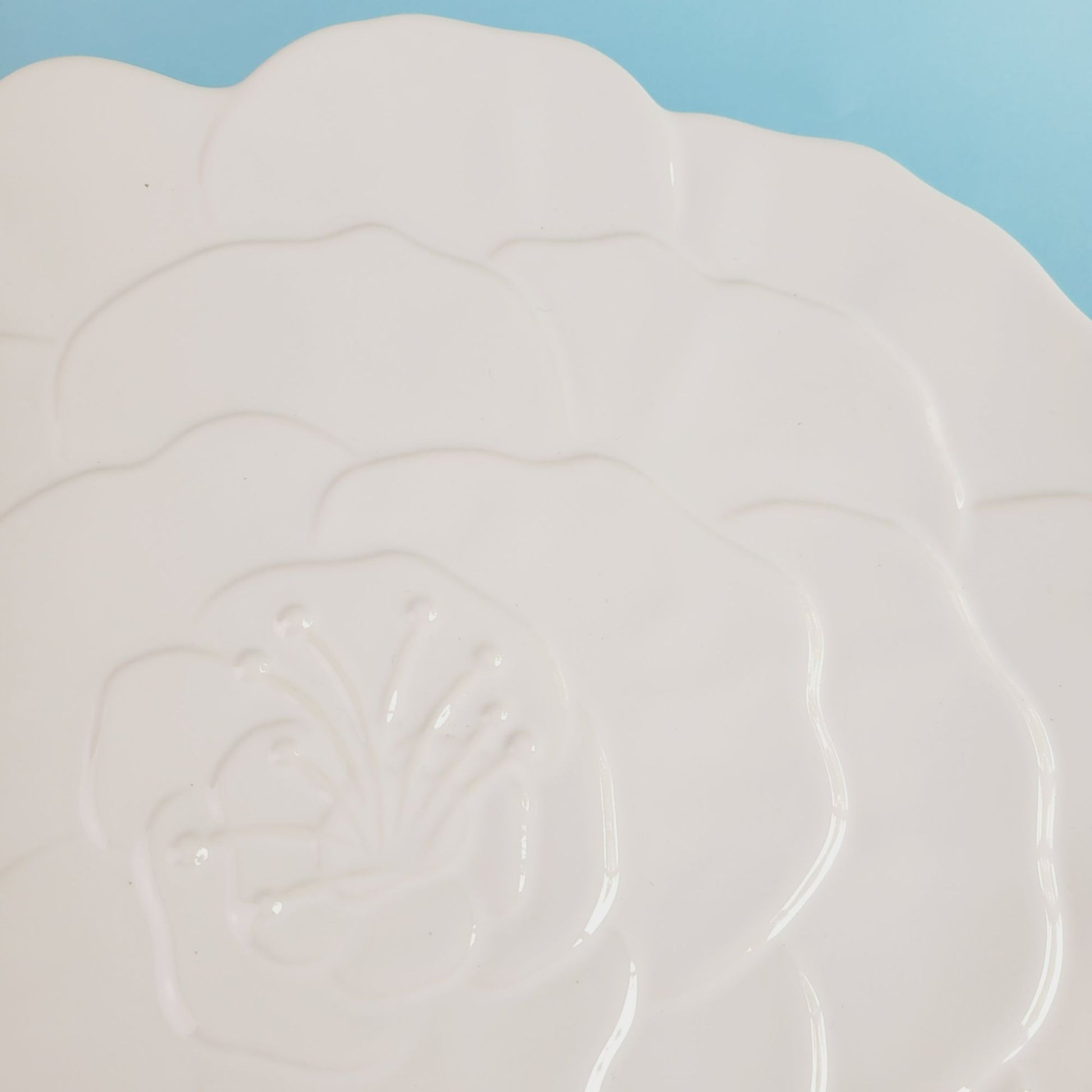 This Studio Nova White Hibiscus Flower Platter is a 13 5/8" round chop plate crafted from porcelain, boasting an elegant raised flower petal design. Perfect for making a statement at any gathering, this platter is a wonderful serving piece and an exquisite gift.