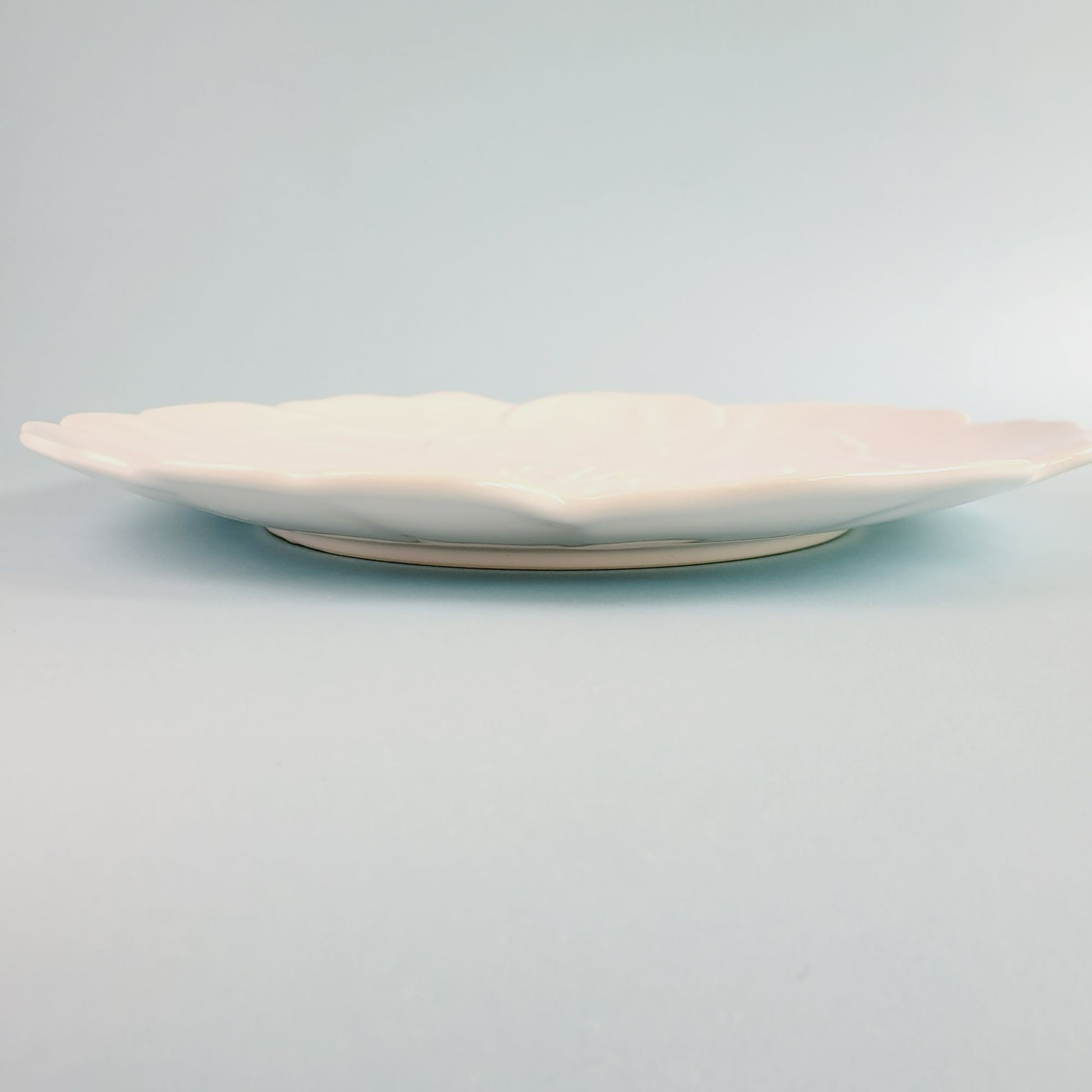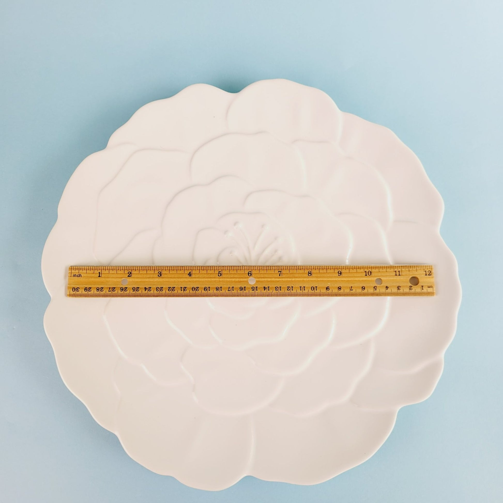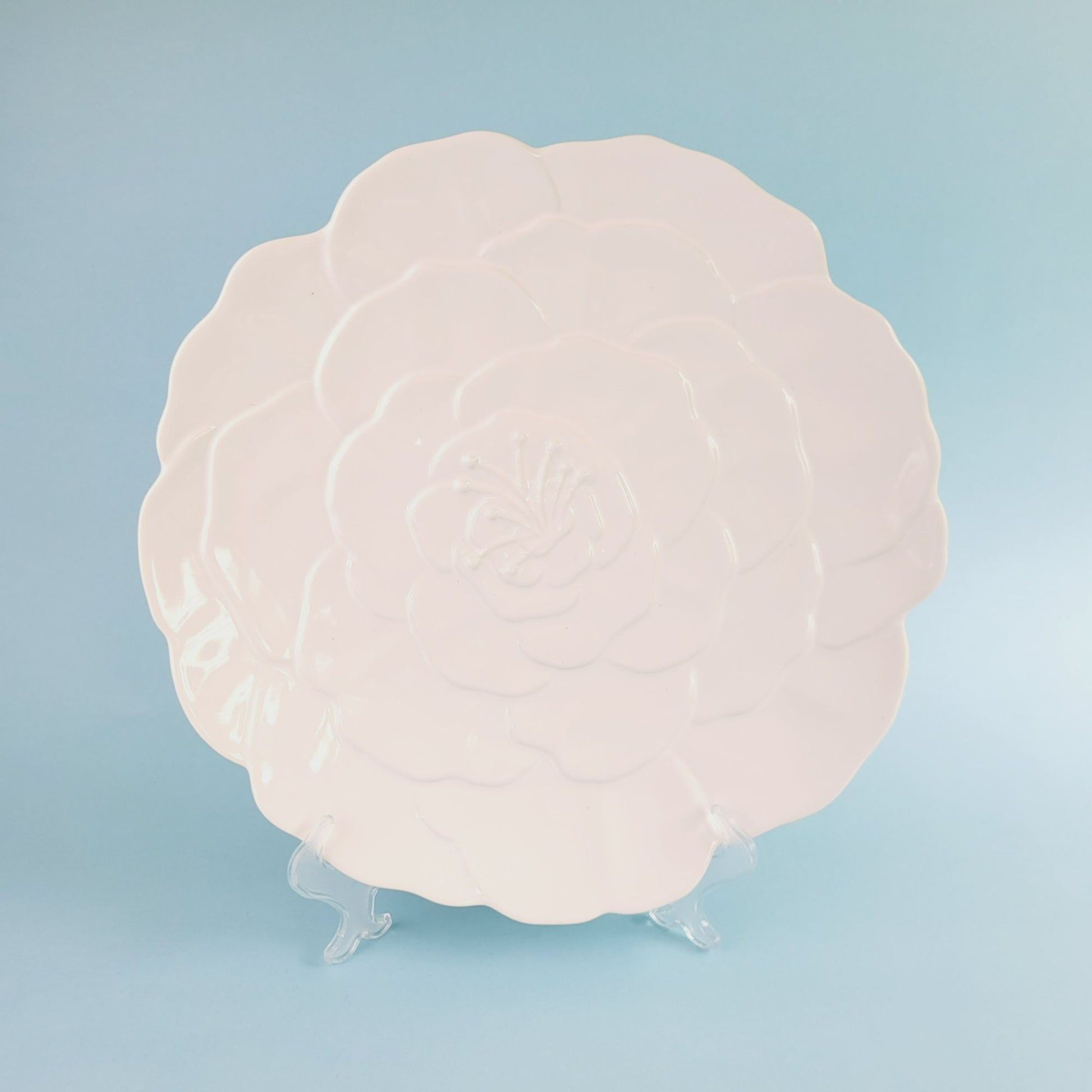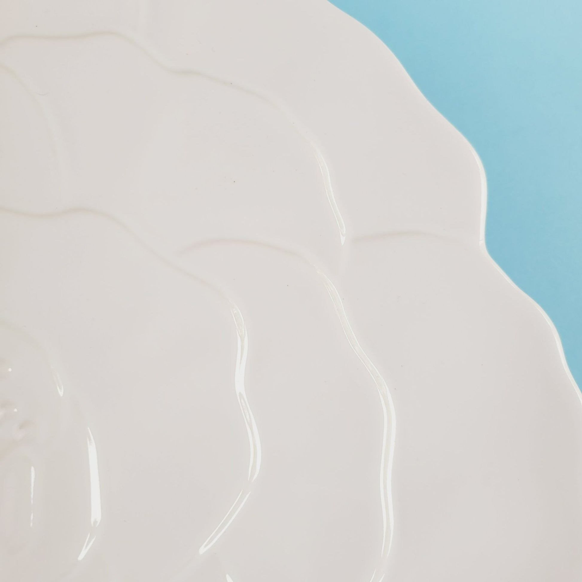 This Studio Nova White Hibiscus Flower Platter is a 13 5/8" round chop plate crafted from porcelain, boasting an elegant raised flower petal design. Perfect for making a statement at any gathering, this platter is a wonderful serving piece and an exquisite gift.