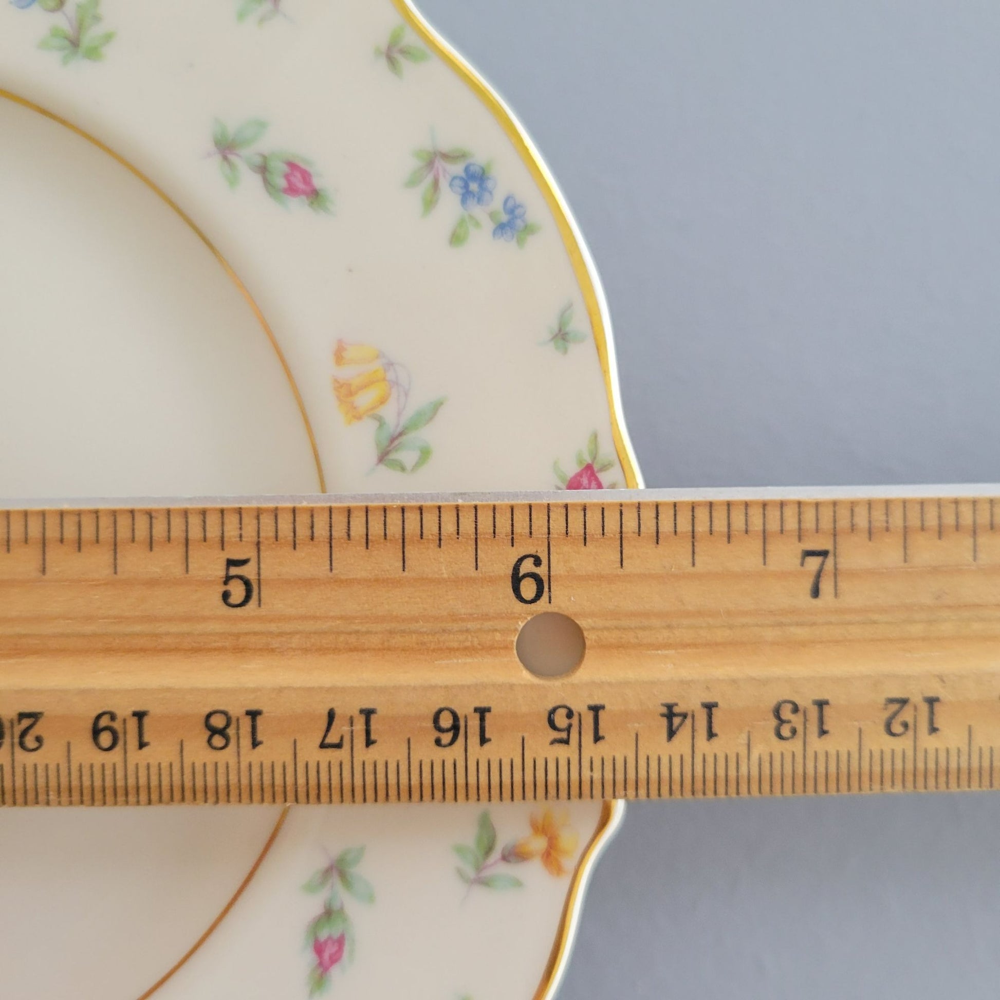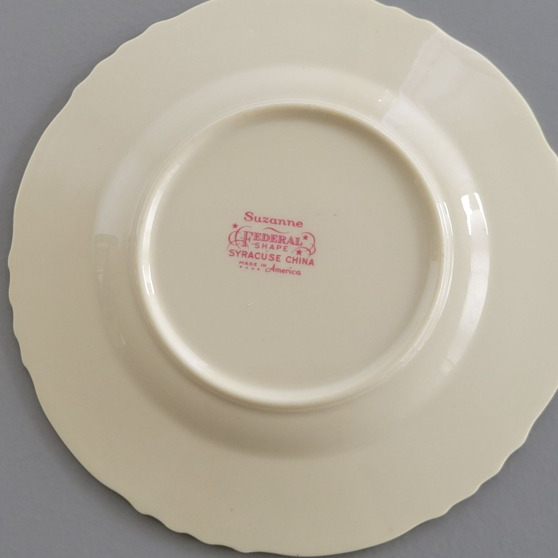 Syracuse Suzanne Federal Shape Bread Plate is a vintage c.1950-70s dinnerware piece featuring small flowers on trim with outer and inner gold trim. Perfect for spring/summer dining.