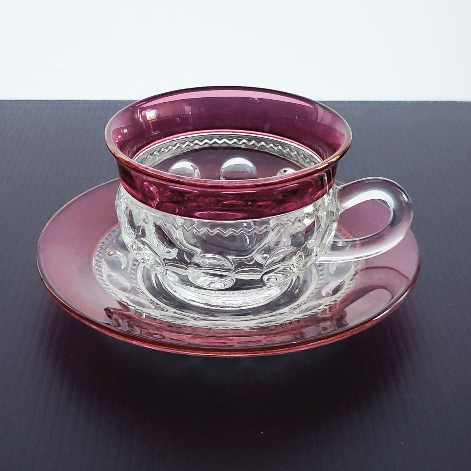 Beautiful vintage Tiffin King's Crown cup and saucer sets in cranberry and clear glass with a textured dot design. Perfect for collectors or as a unique gift.