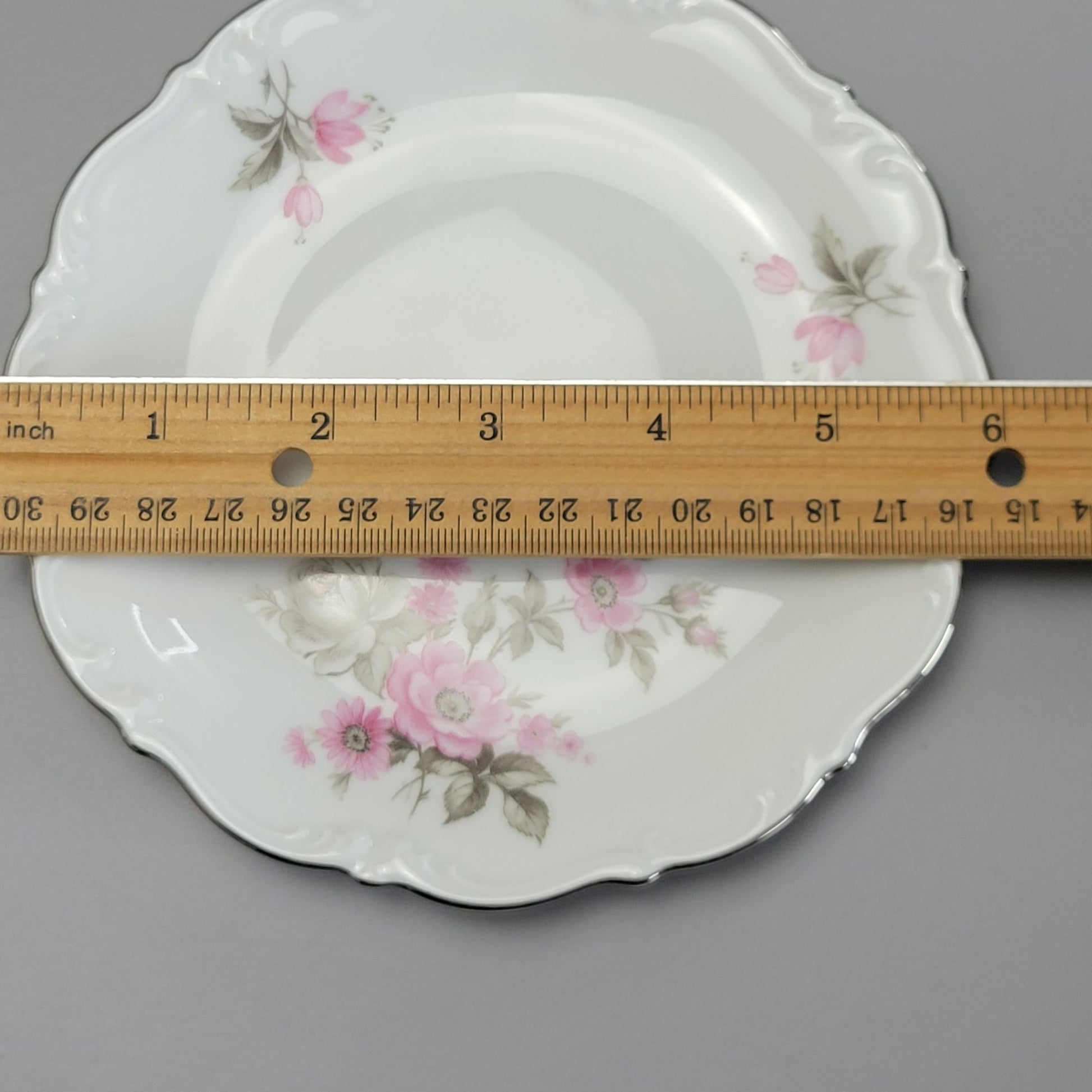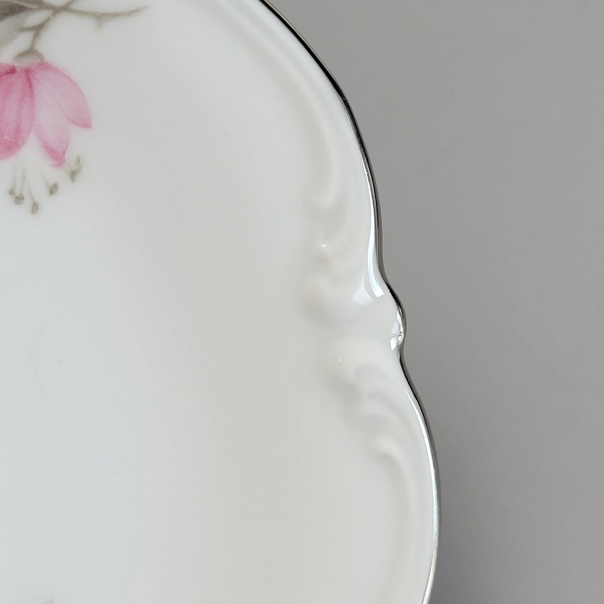 Tirschenreuth Picardy plate exudes elegance with its pink and gray floral design with platinum trim. Made in Bavaria, Germany around 1969, this porcelain plate features the Pasco marking.