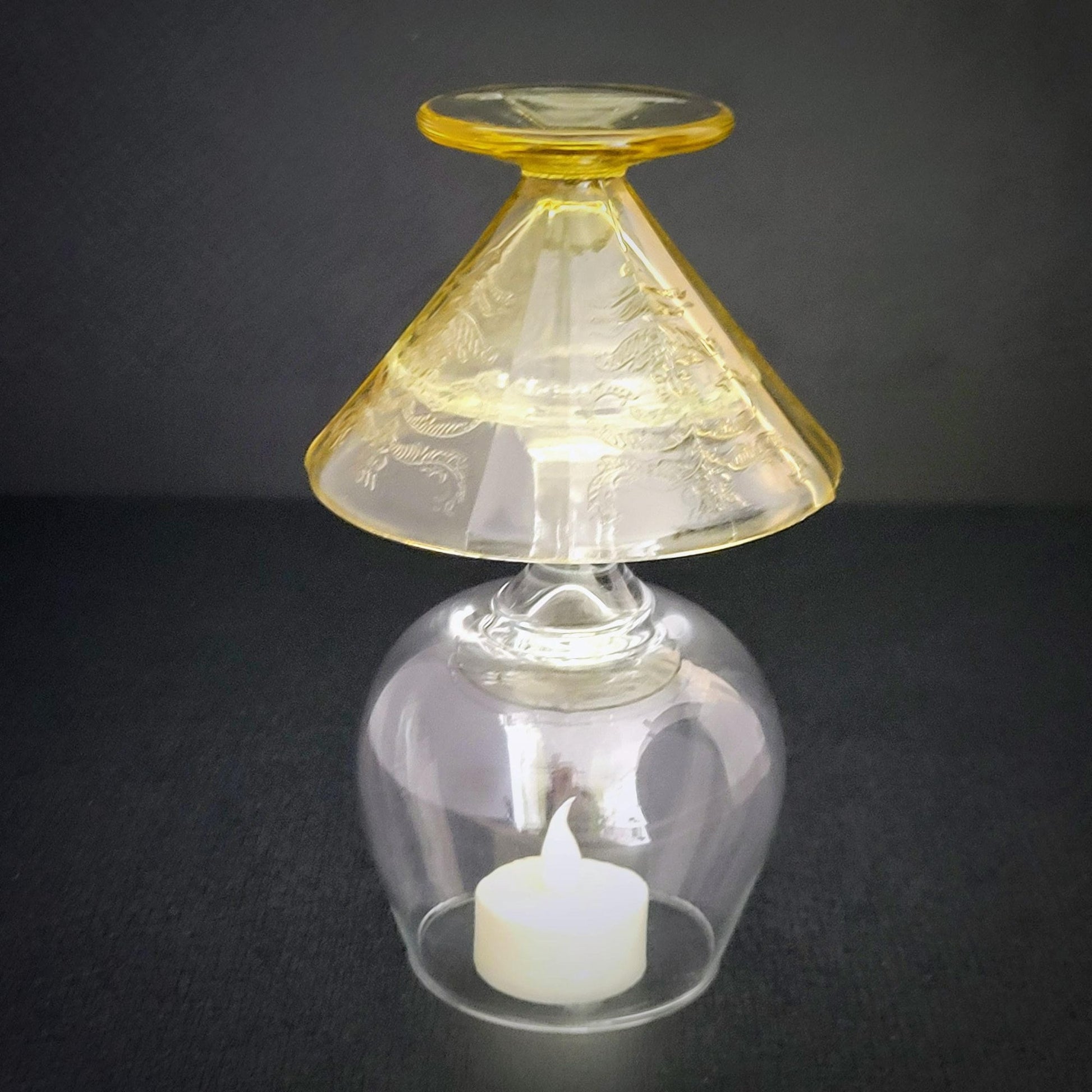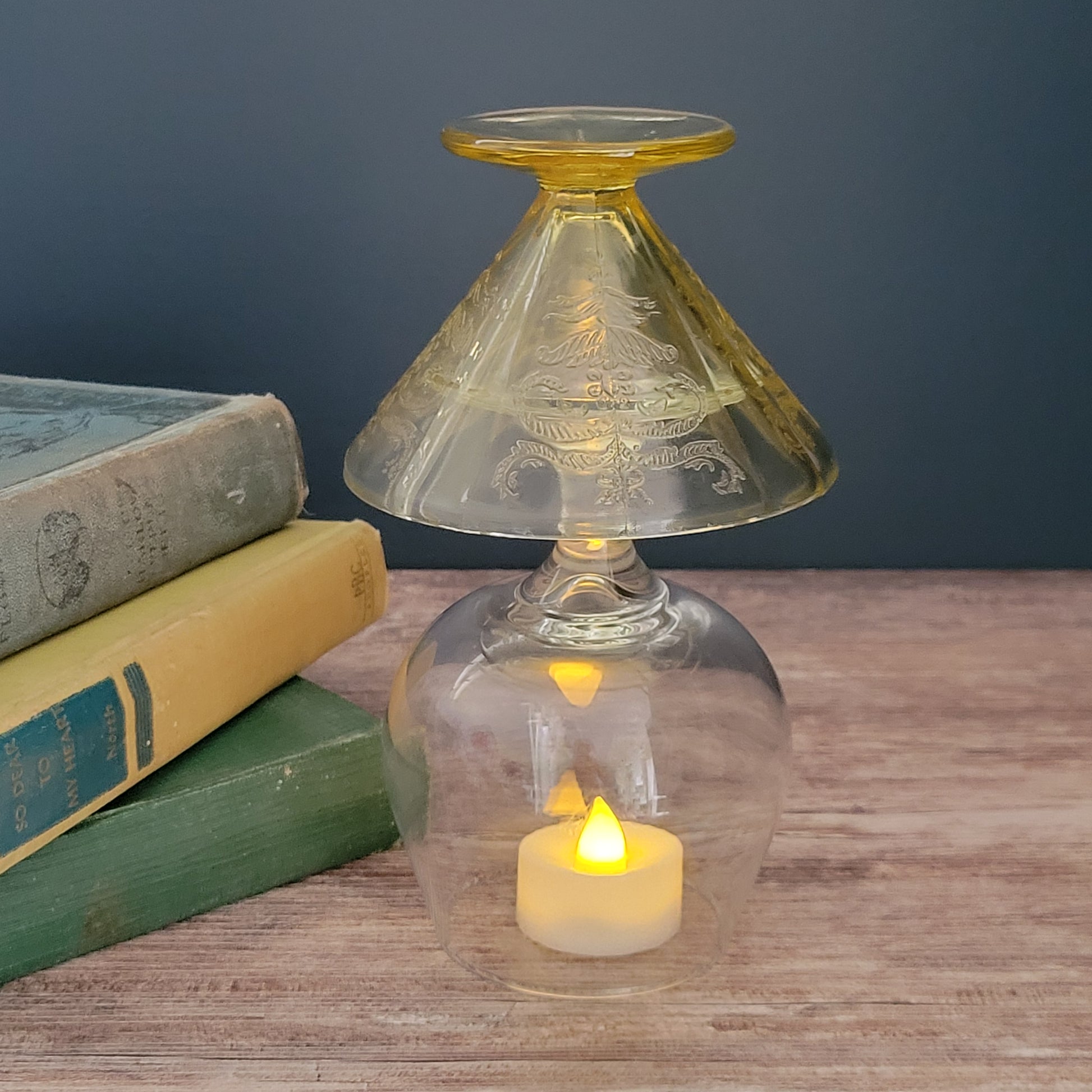 Create the perfect mood for relaxing and unwinding with this cozy, eco-friendly accent piece that enhances any décor style. Handcrafted with quality vintage glassware, this piece is a unique, sustainable addition to your space. It’s the perfect gift for those who appreciate vintage, craftsmanship, and the beauty of sustainable living.