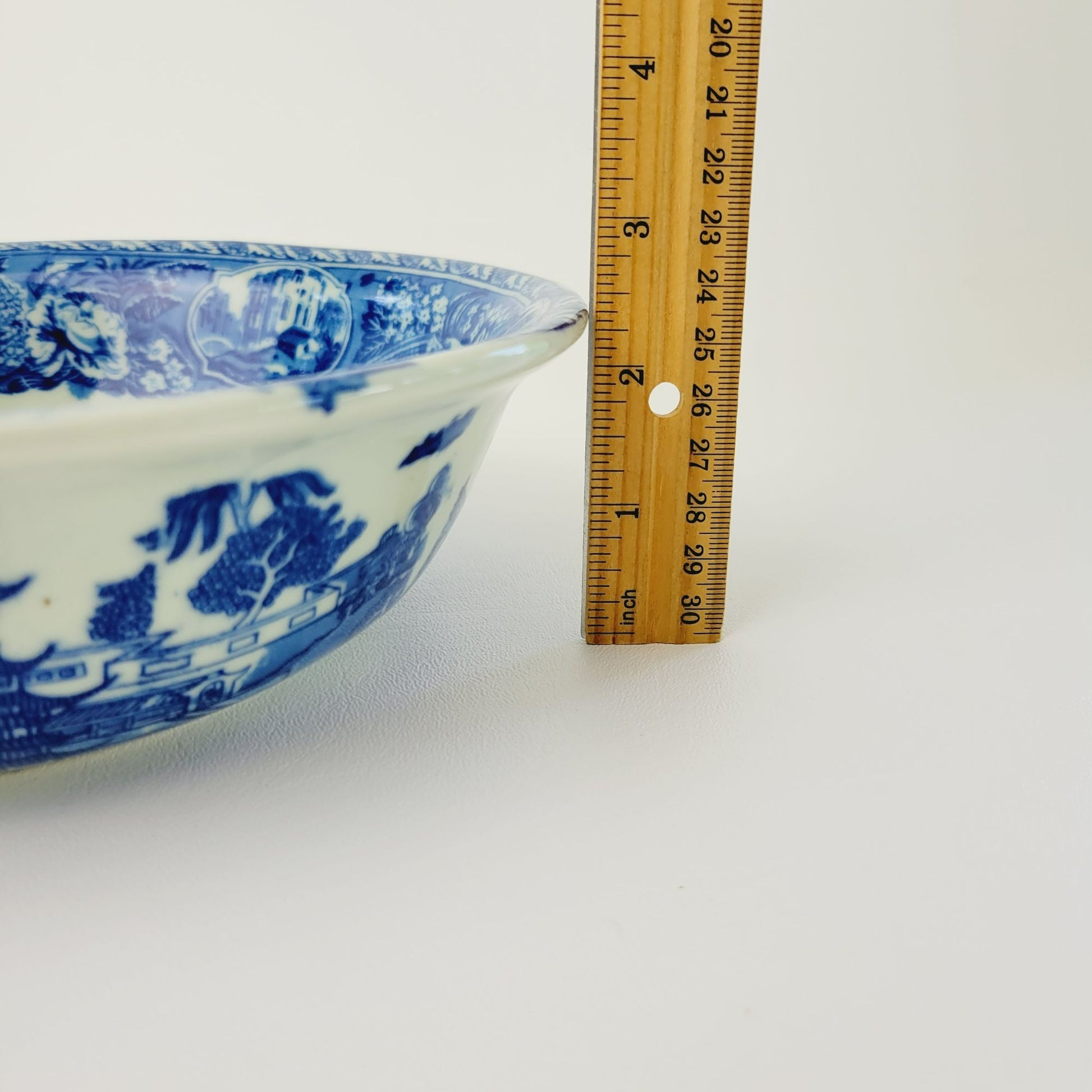 A Victorian Ware Ironstone bowl with a vintage blue and white Chinoiserie Pagoda design. Reflects a Blue Willow style, ideal for Asian home décor and tableware collection.