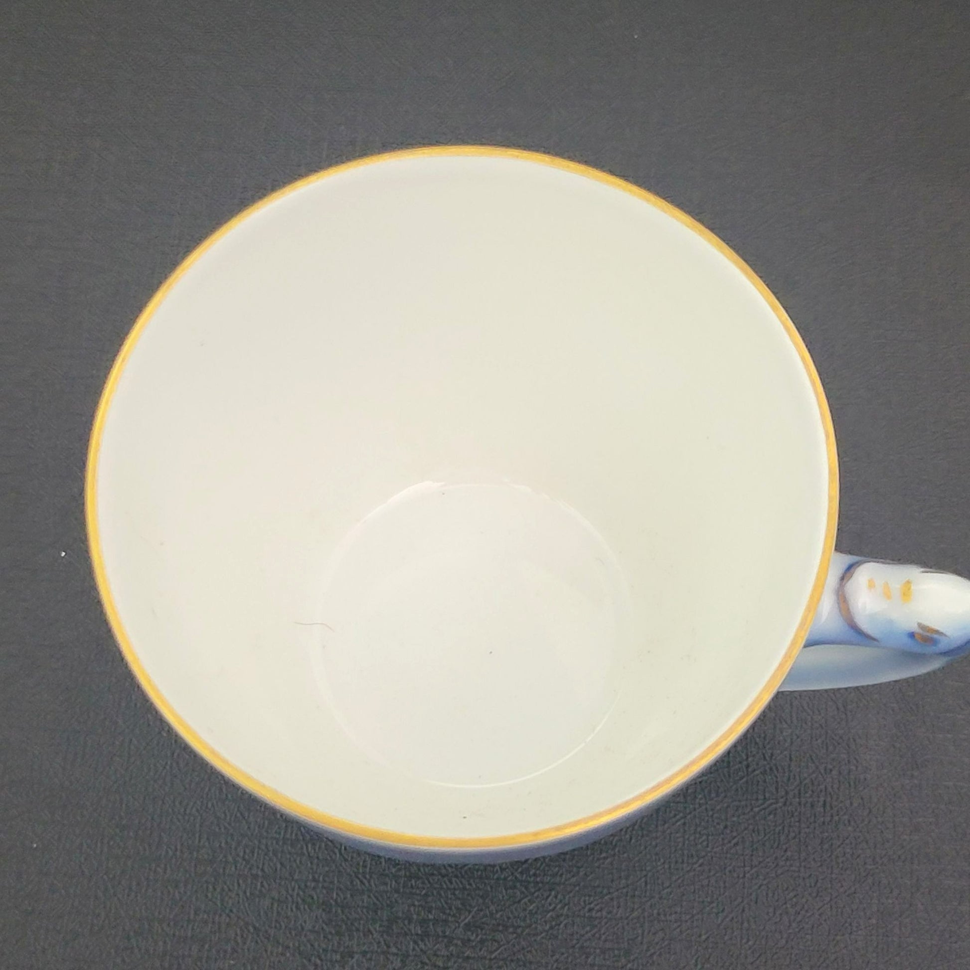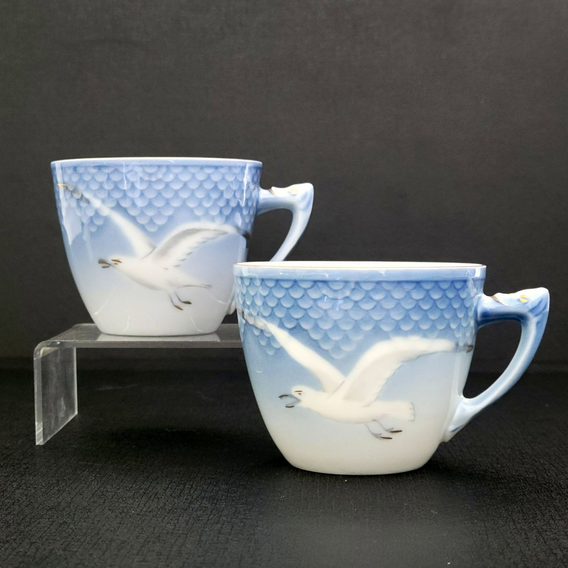 Elegant vintage Bing & Grondahl Seagull flat cups with a blue and white ombre design. Features gold trim and embossed details. Perfect for a coastal housewarming gift.