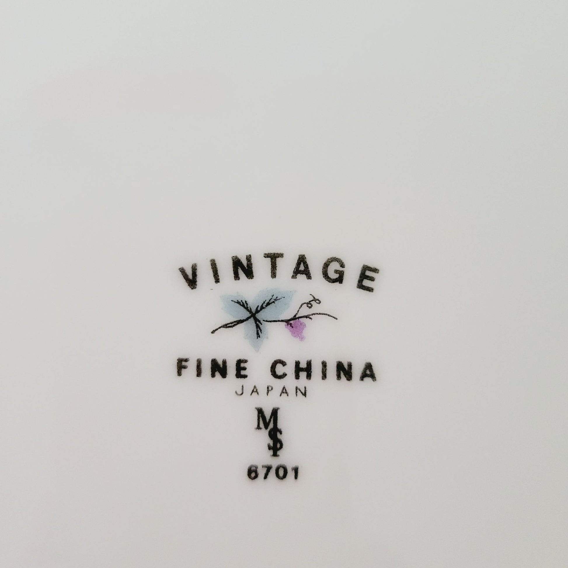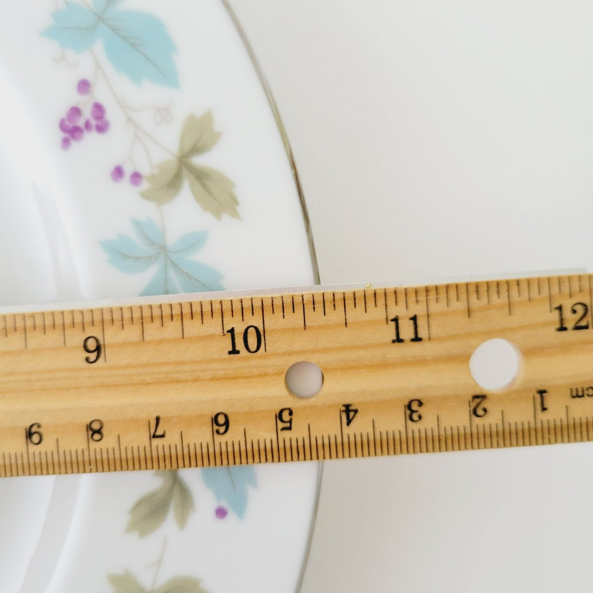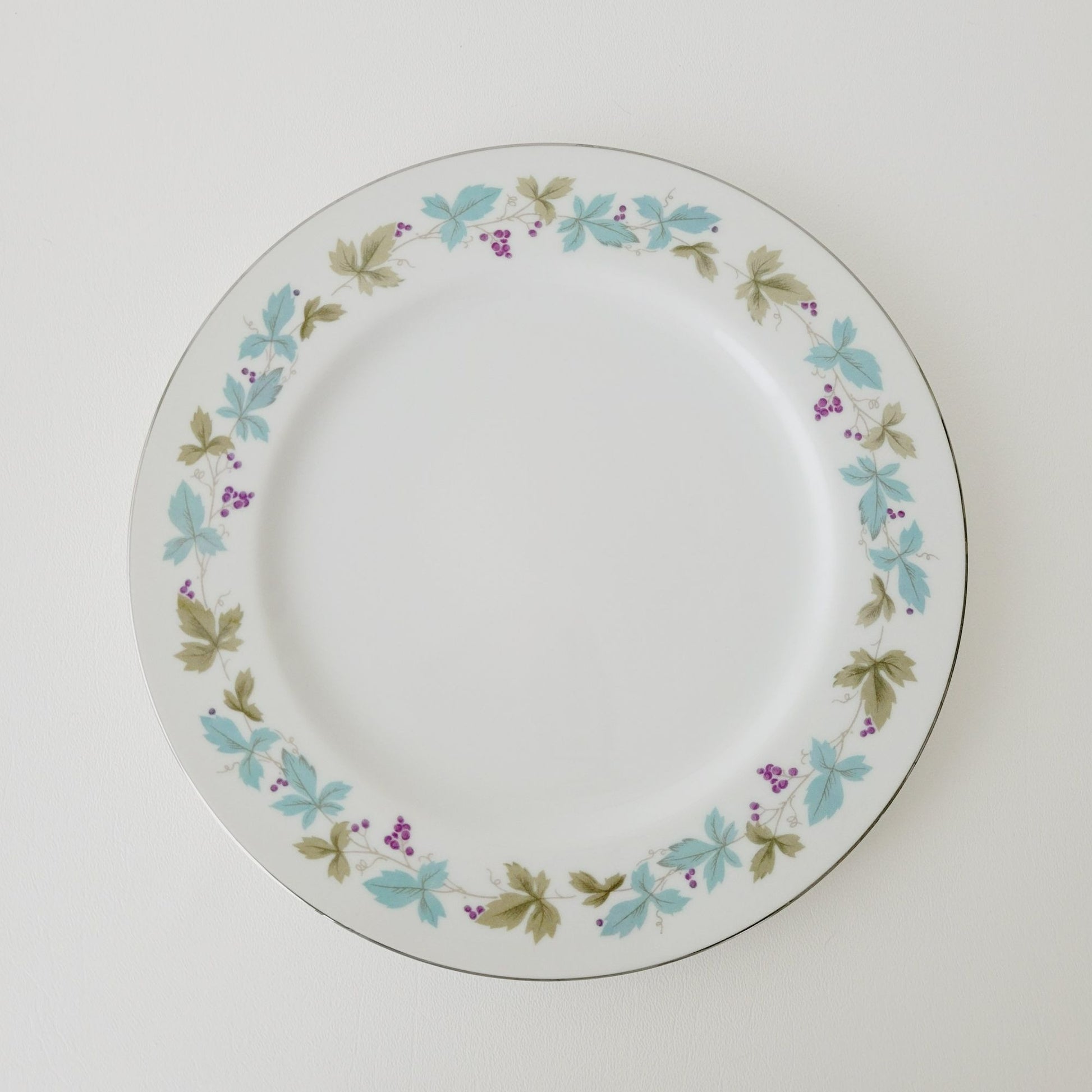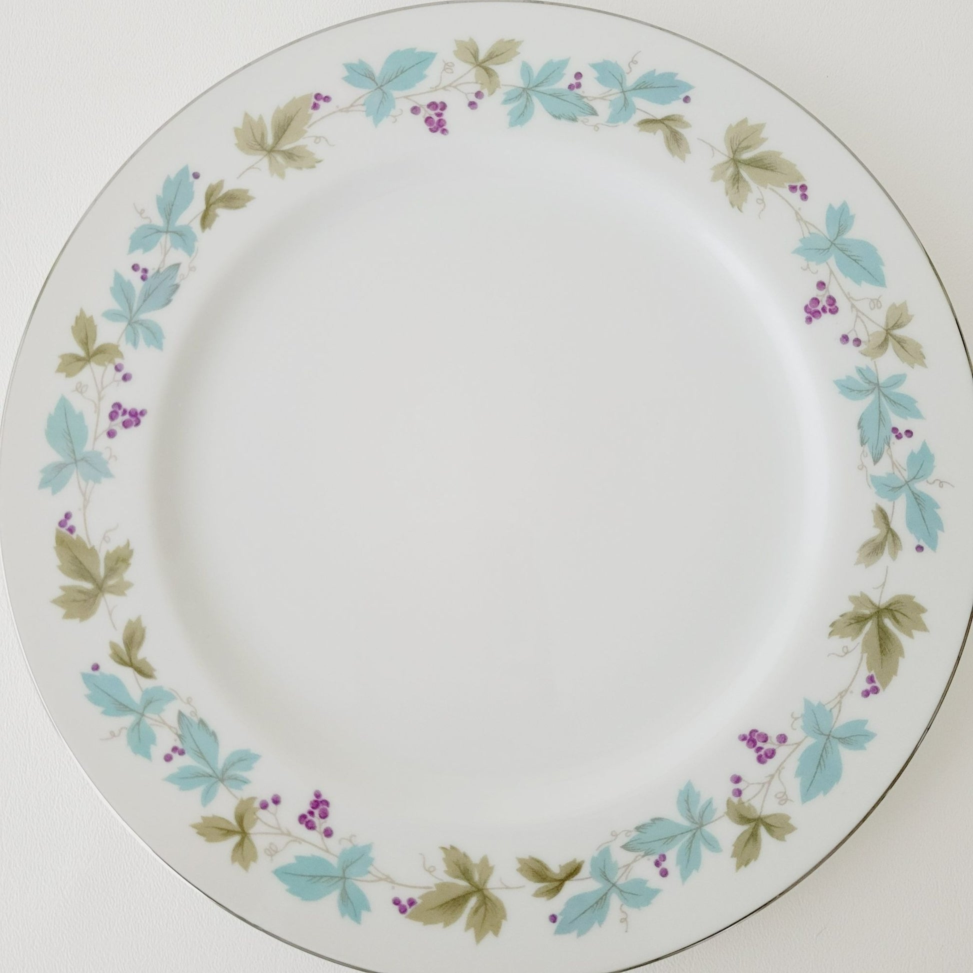 Vintage Blue & Green Leaf Dinner Plates by Fine China of Japan. These kitchen dishes showcase a graceful grape and leaves pattern, perfect for adding a touch of vintage charm to any meal.
