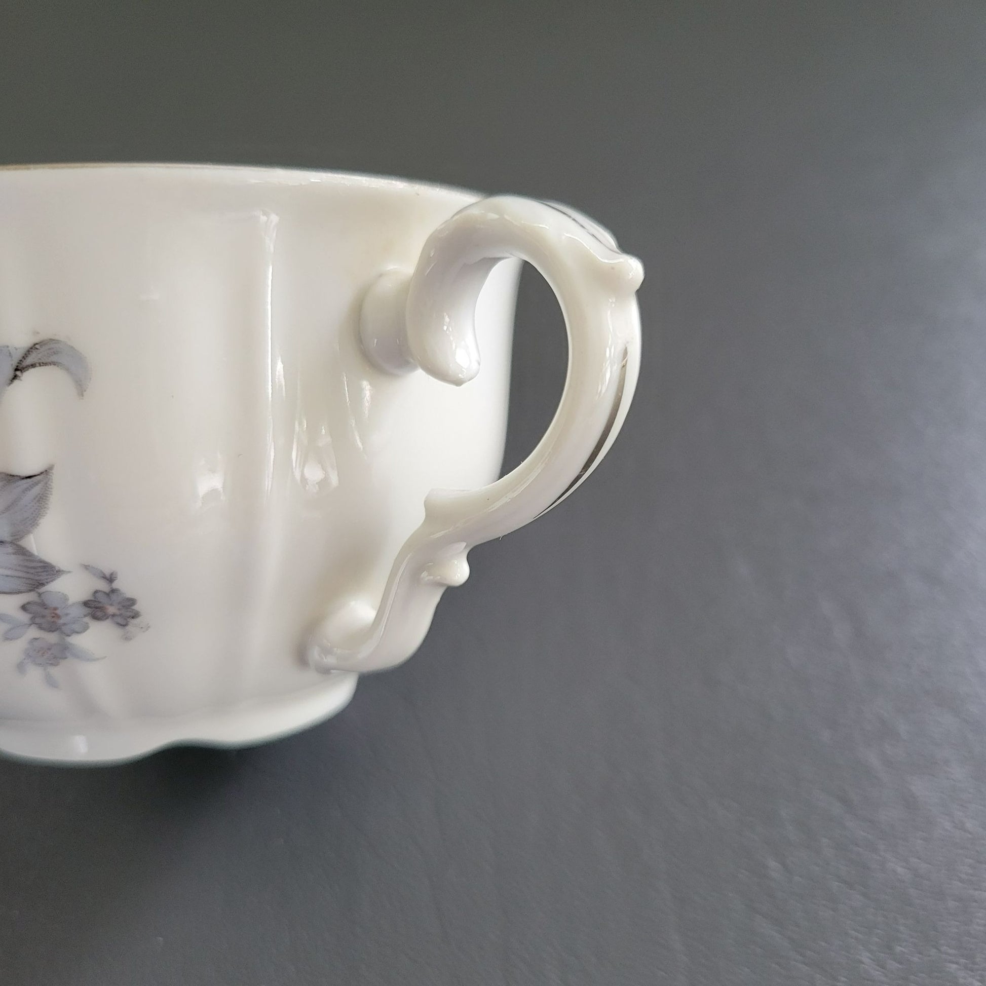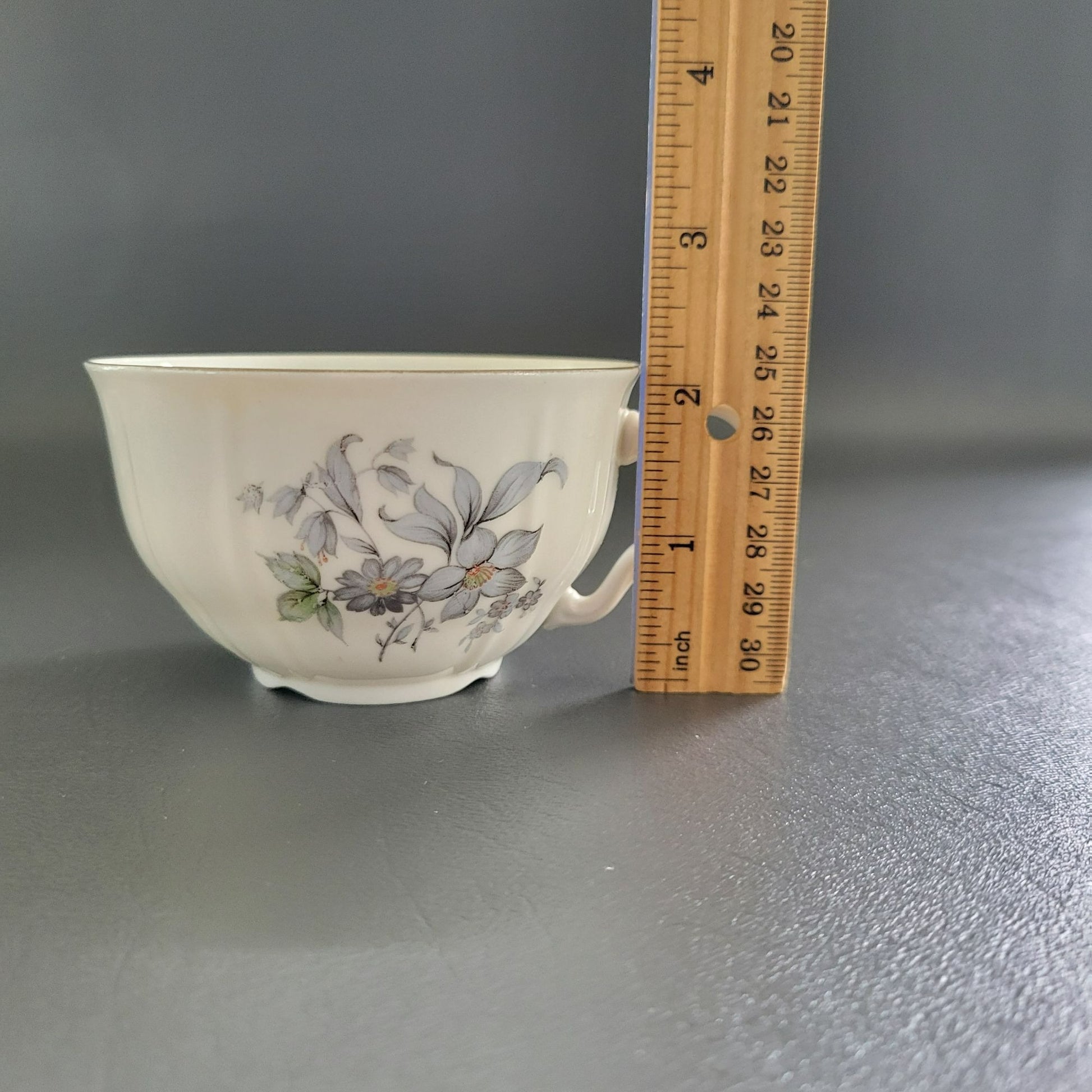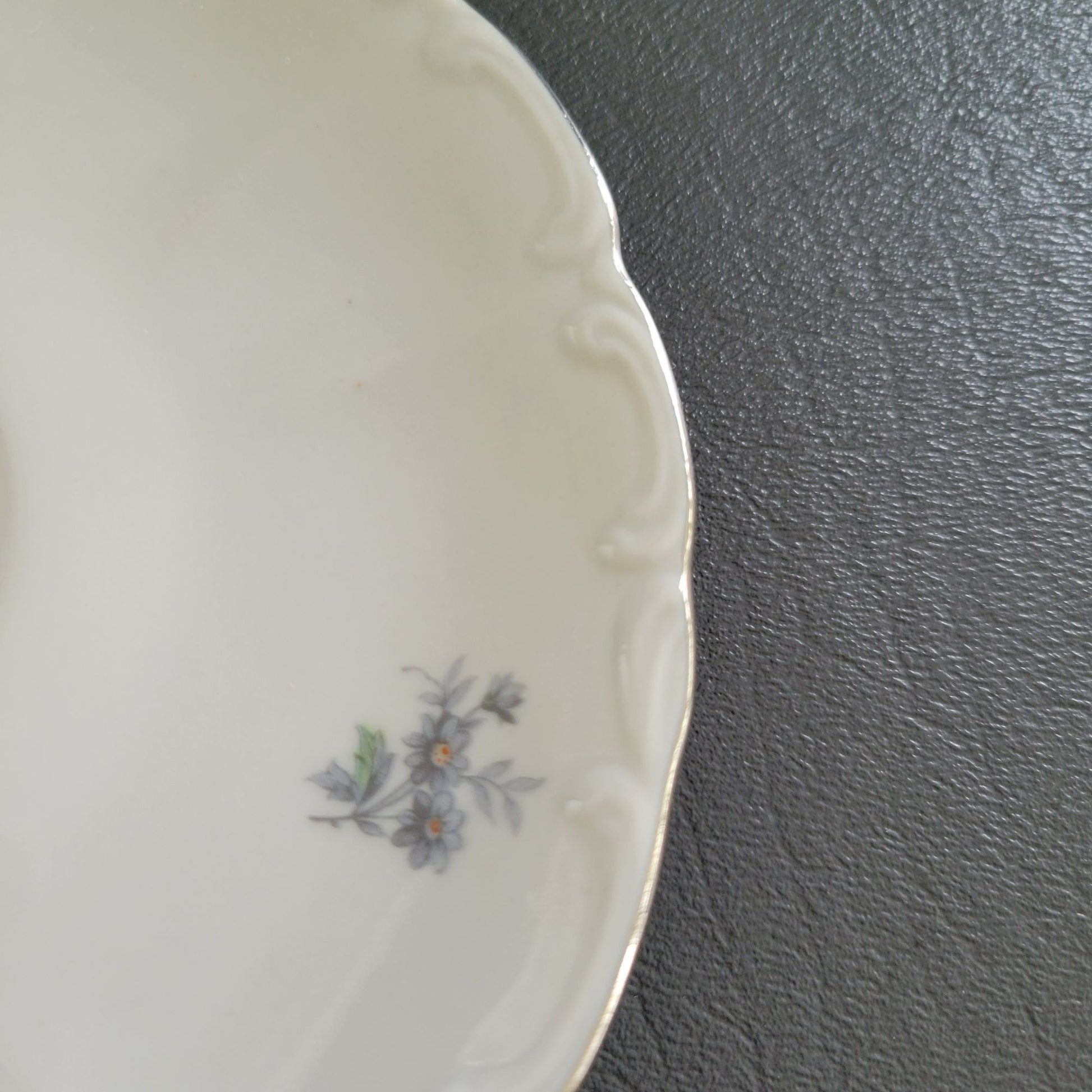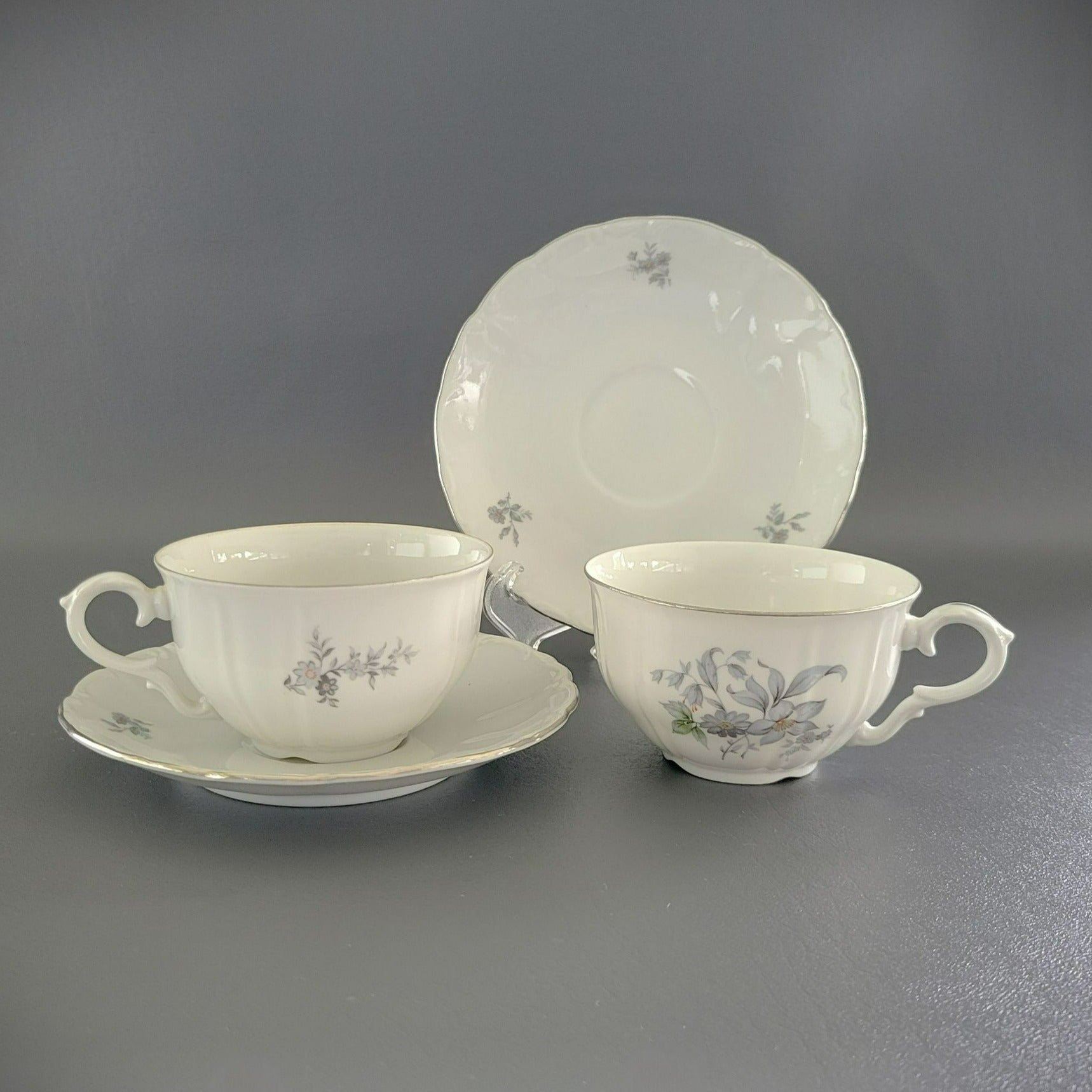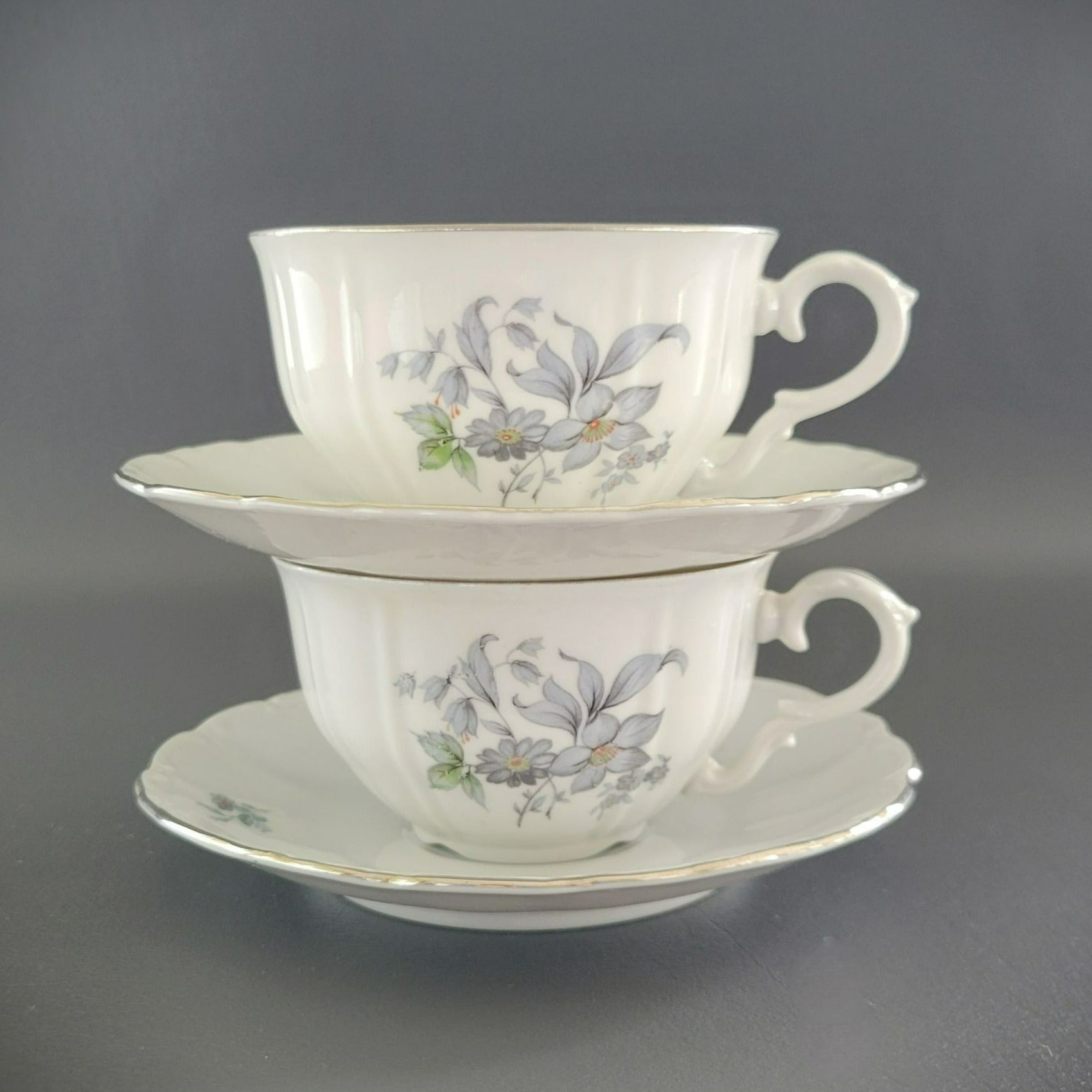 This exquisite set of 2 Bohemian China Wild Flower teacup & saucer sets, in a stunning blue-gray color with silver trim and embossed edge was made in Czechoslovakia.