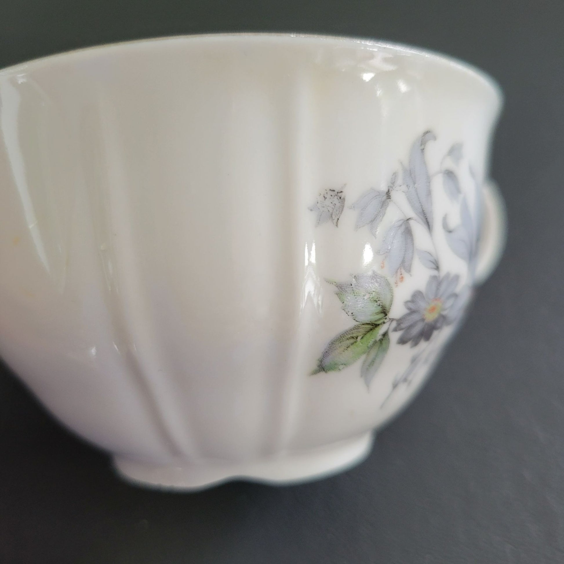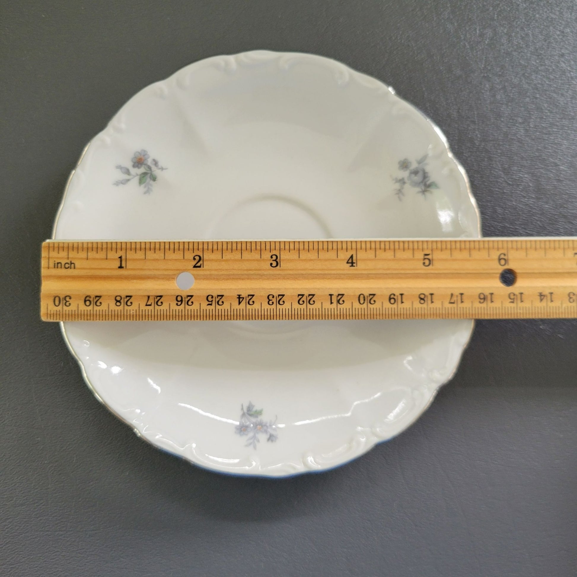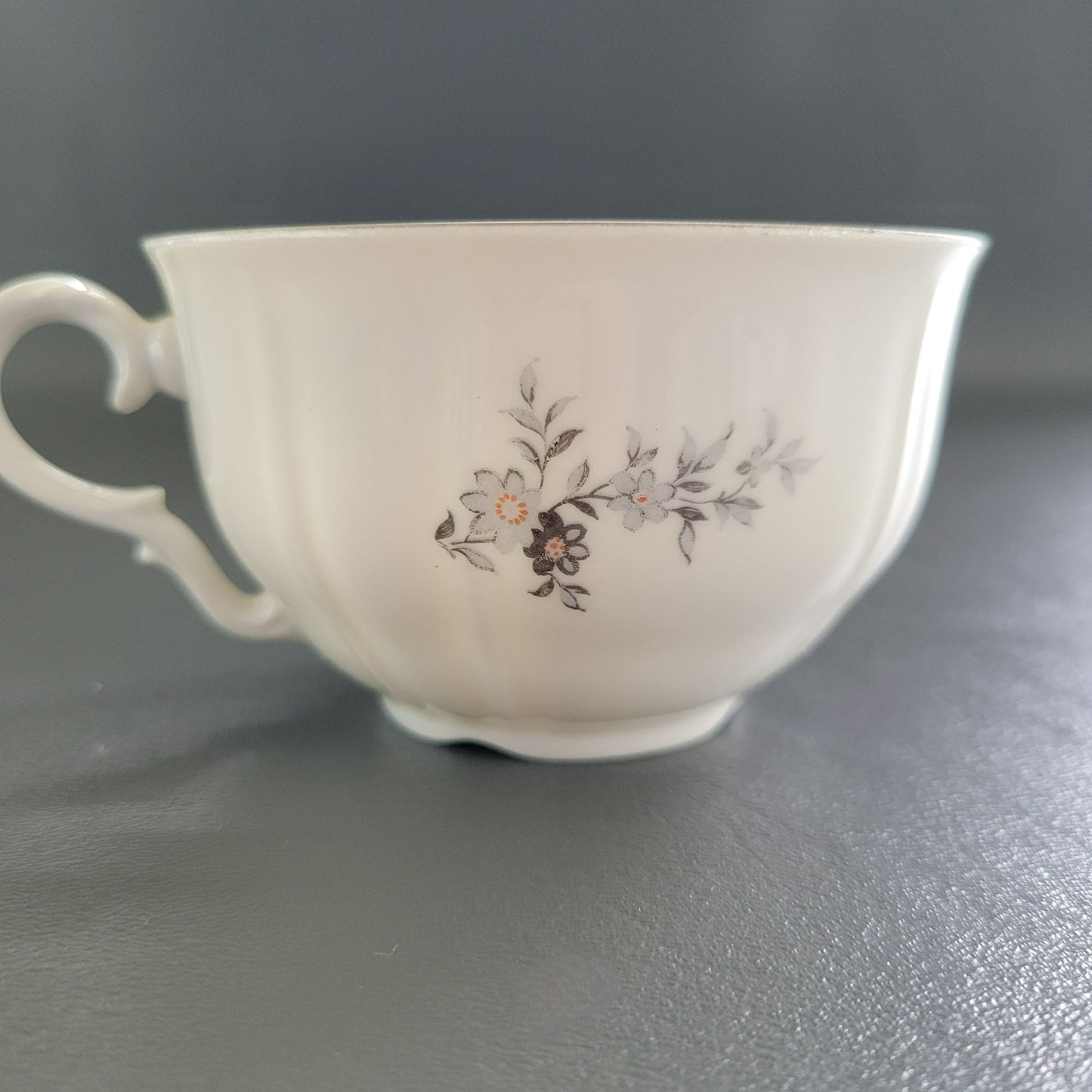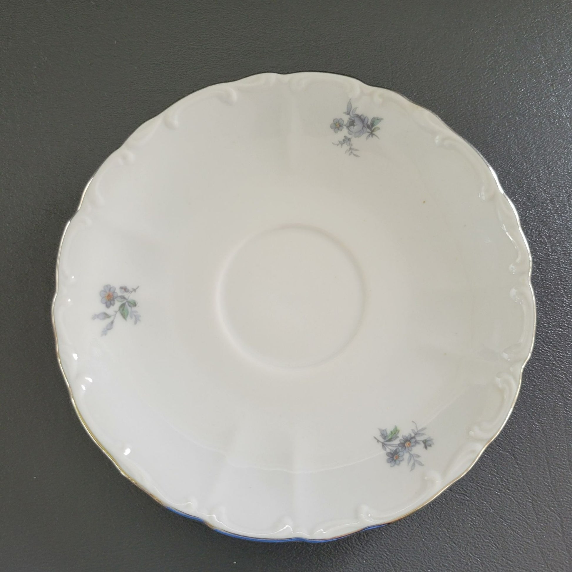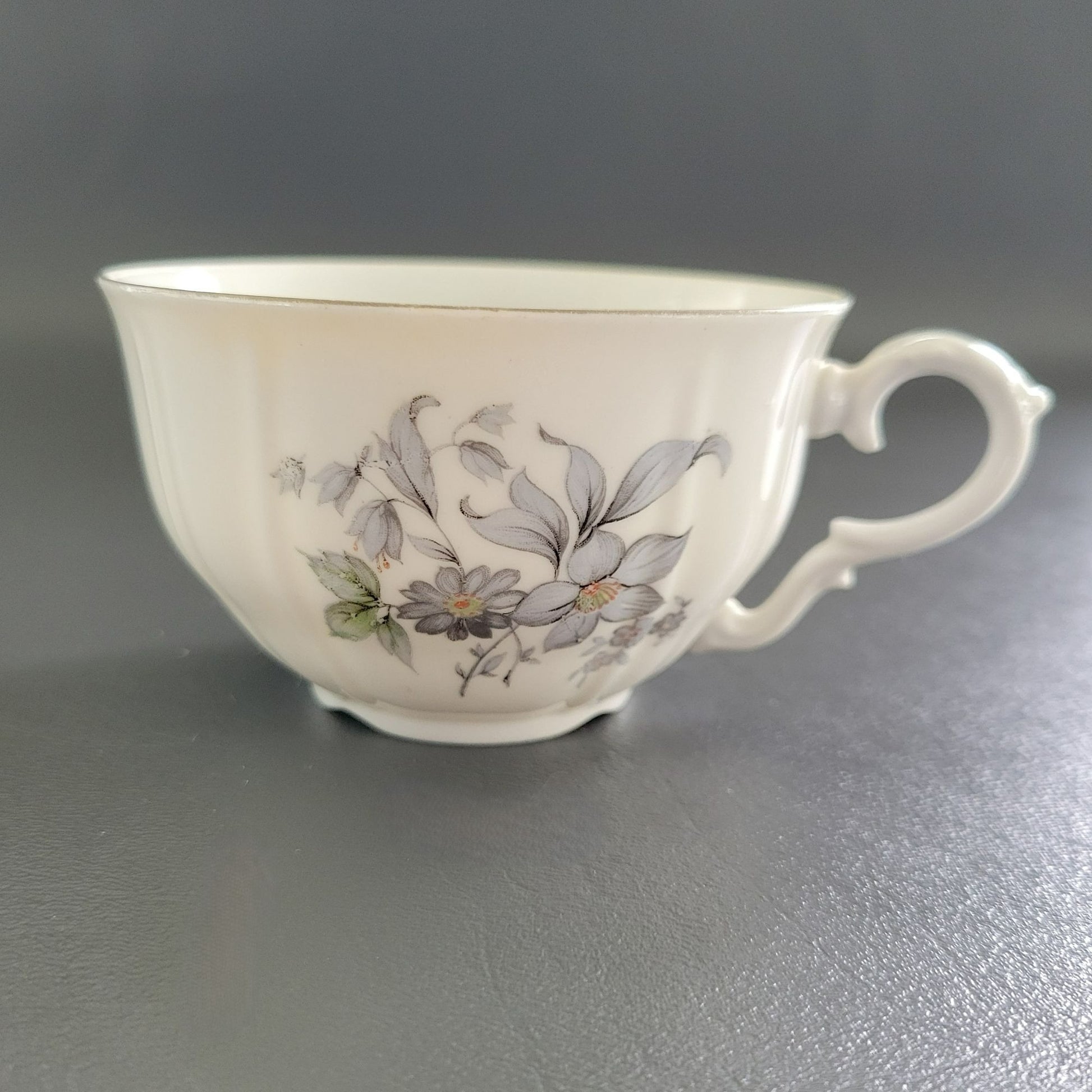 This exquisite set of 2 Bohemian China Wild Flower teacup & saucer sets, in a stunning blue-gray color with silver trim and embossed edge was made in Czechoslovakia.