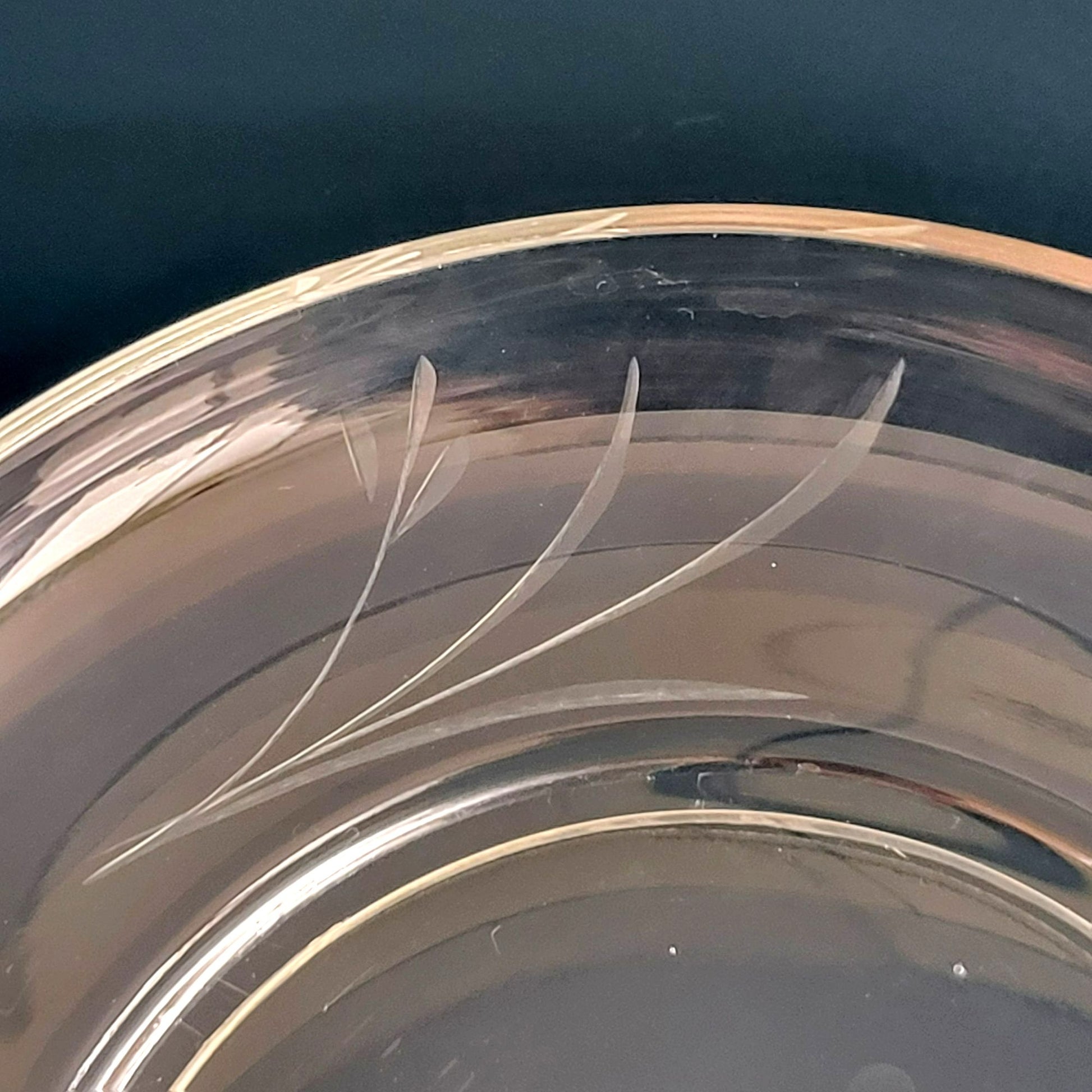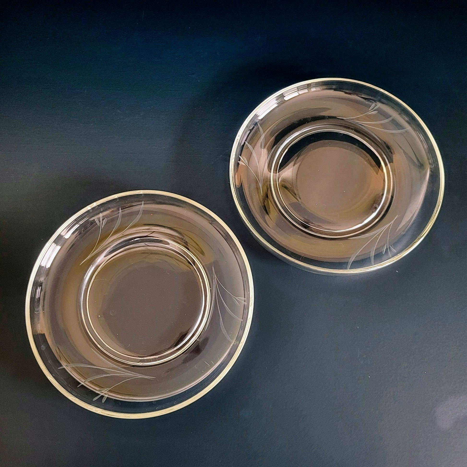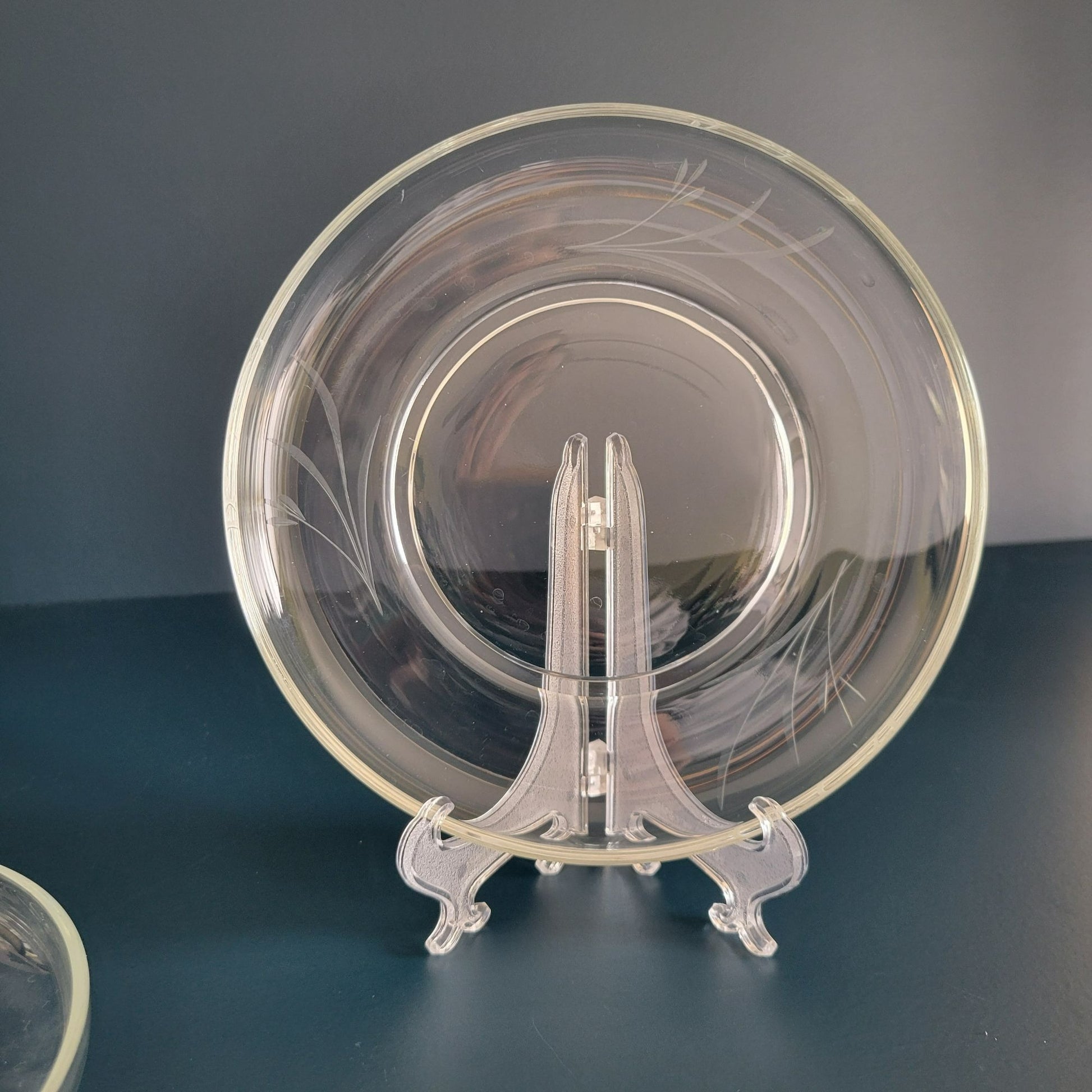Enhance your dining experience with this set of vintage etched clear glass footed salad plates. Featuring floral stem etching, these mid-century modern dishes add a unique touch to any dinnerware collection.