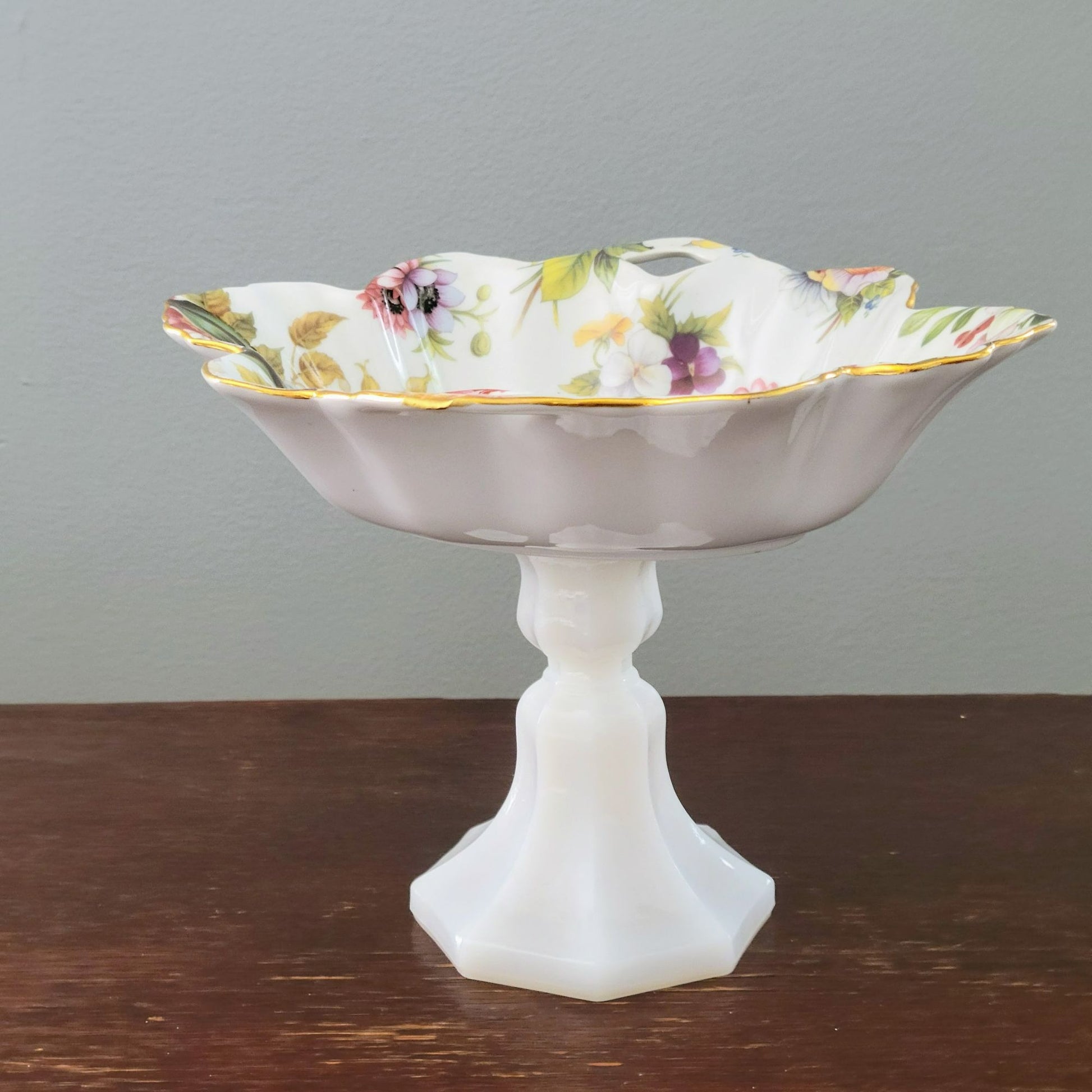 Pedestal Dish crafted from vintage milk glass vase and handled porcelain floral bowl. Bright colored floral design on inside of bowl with gold trim accent.