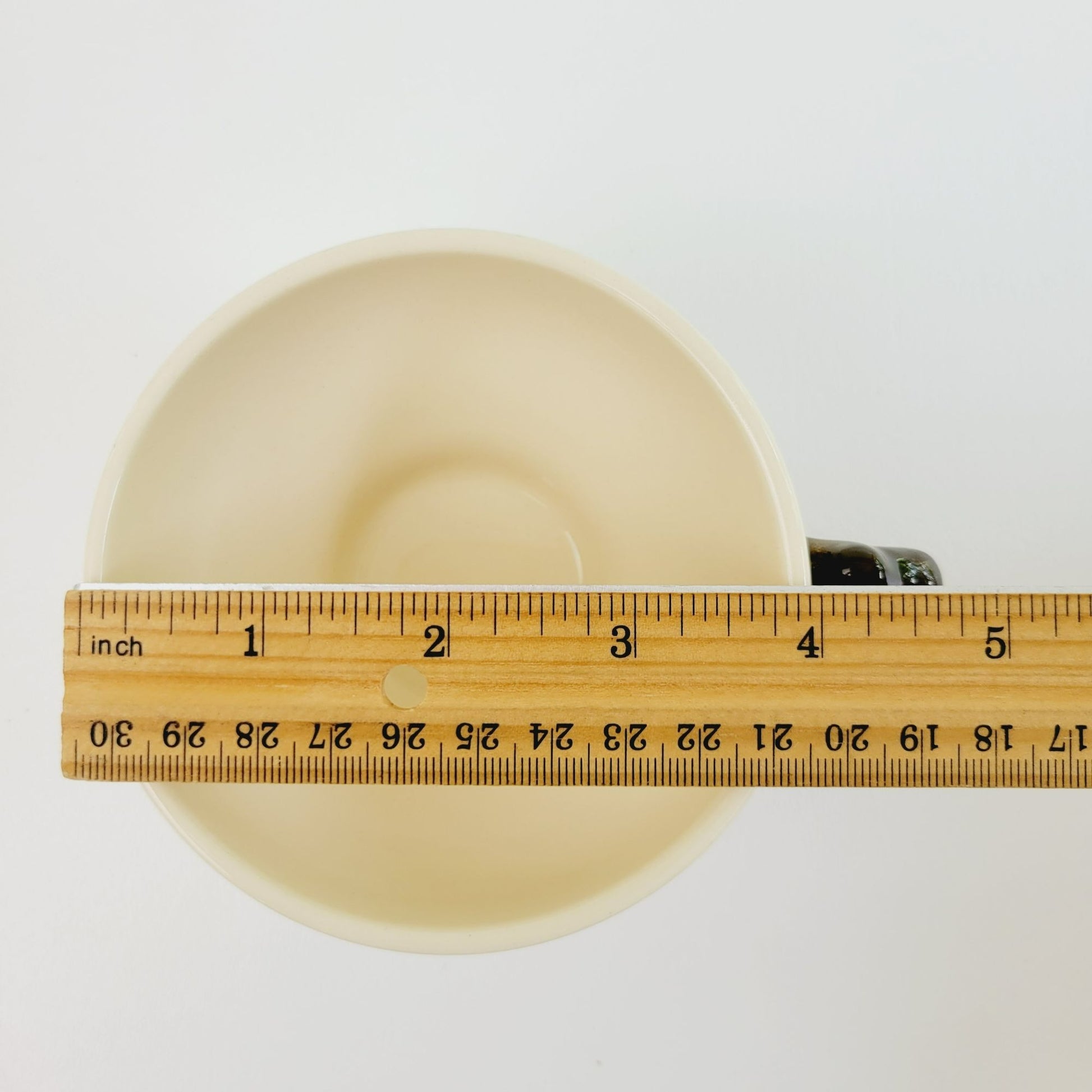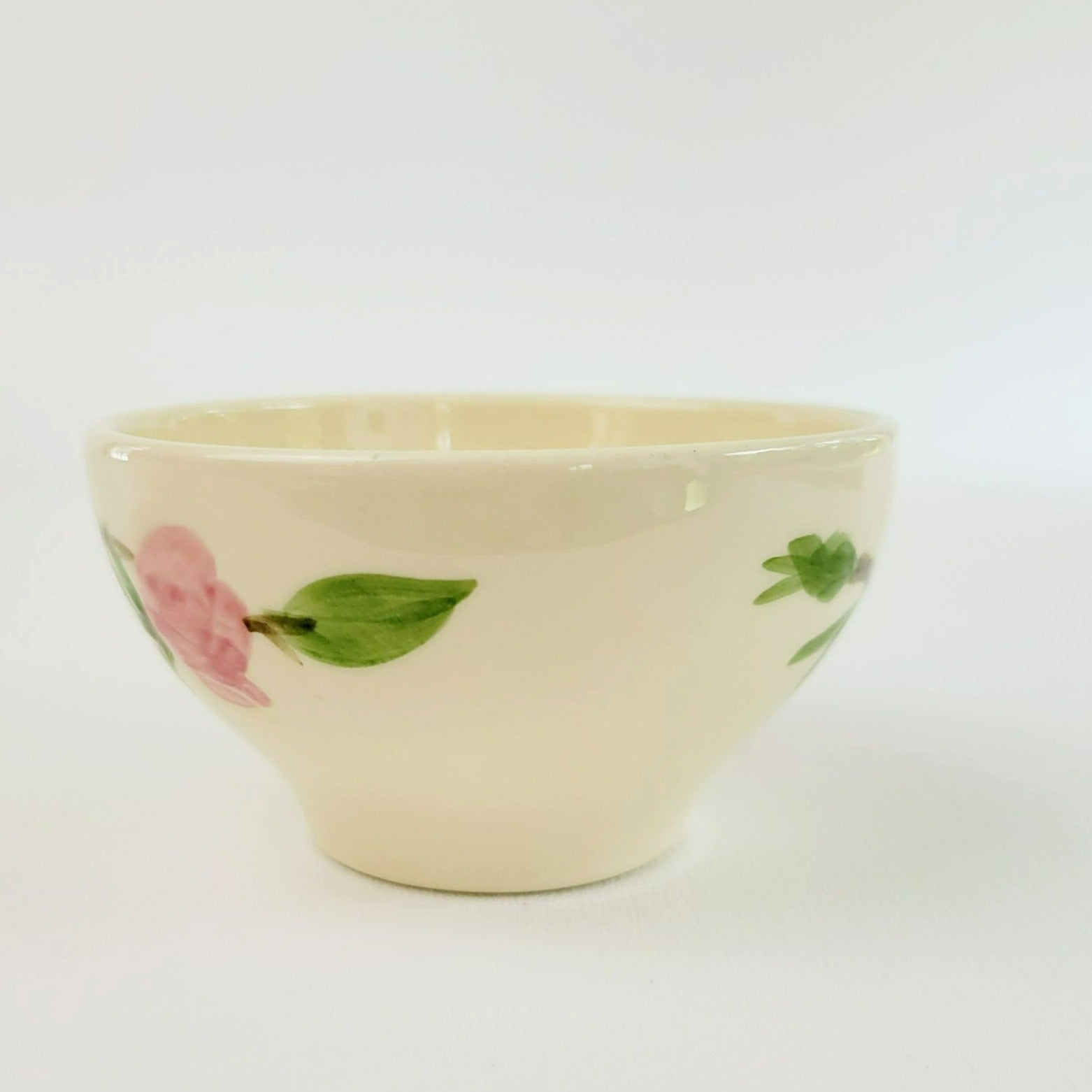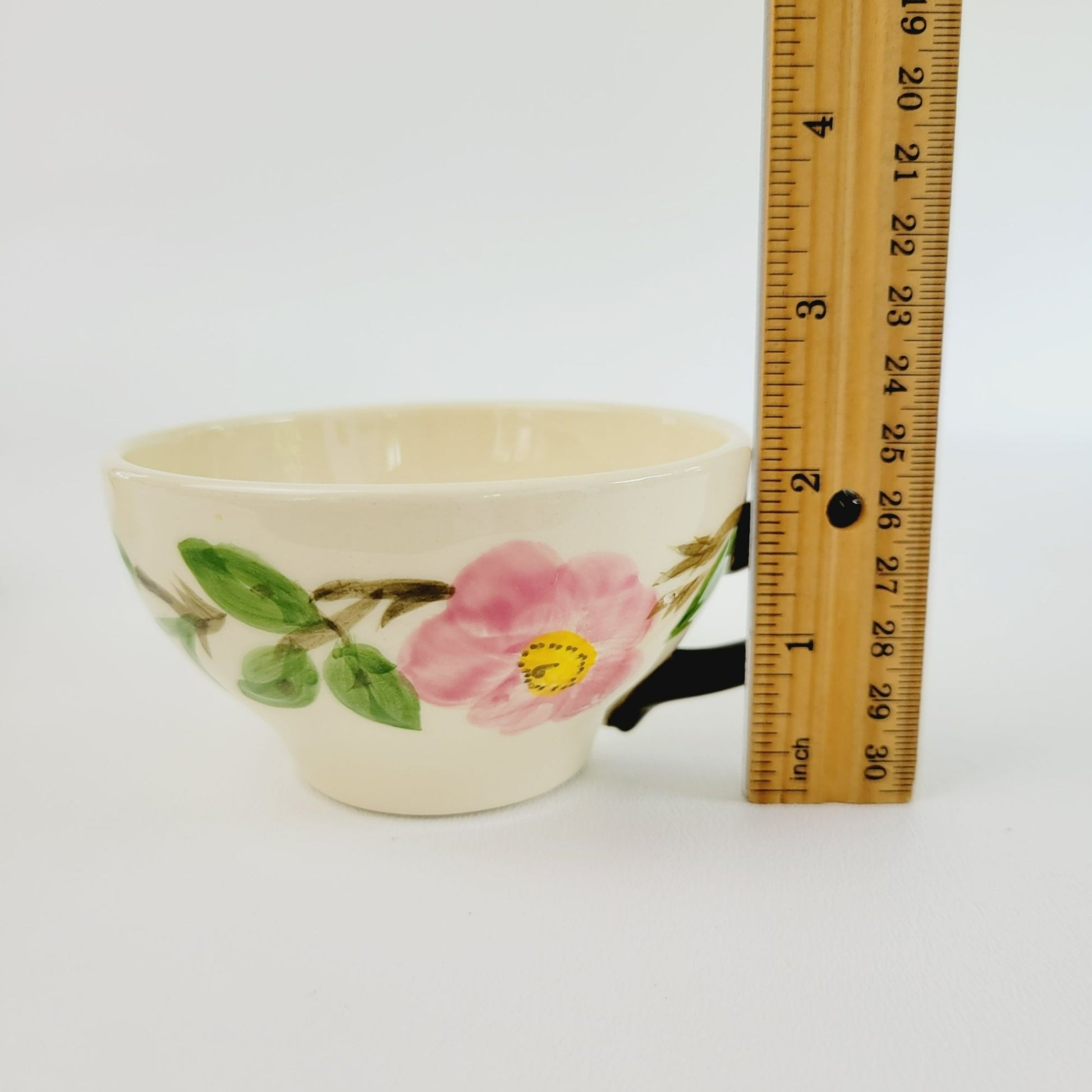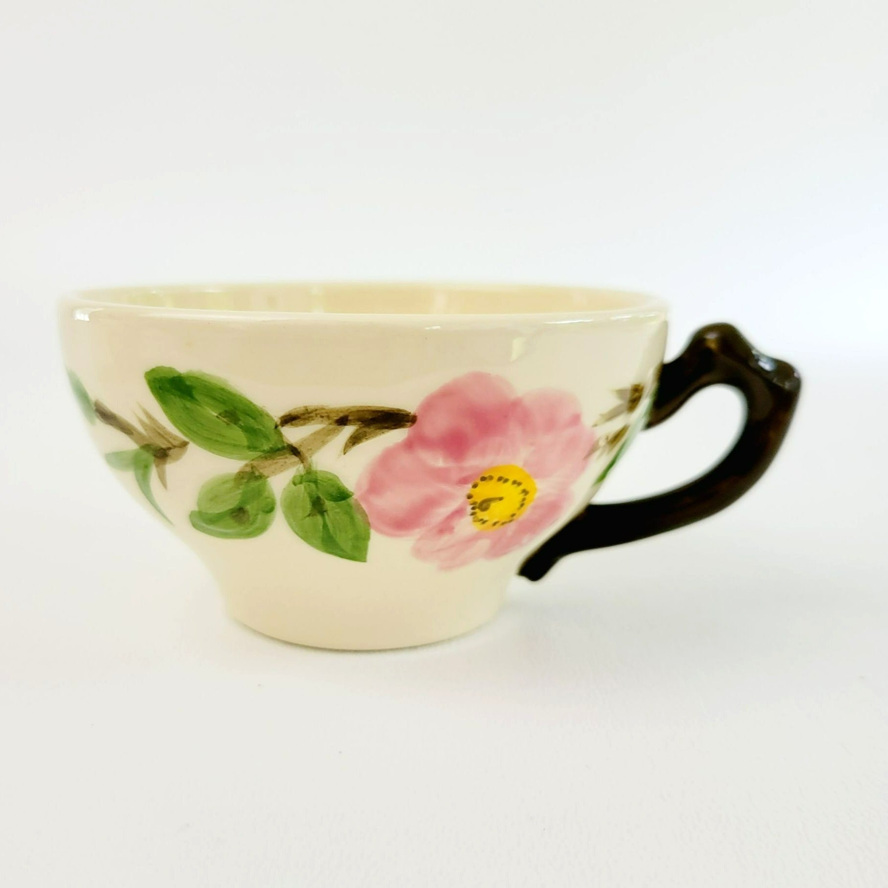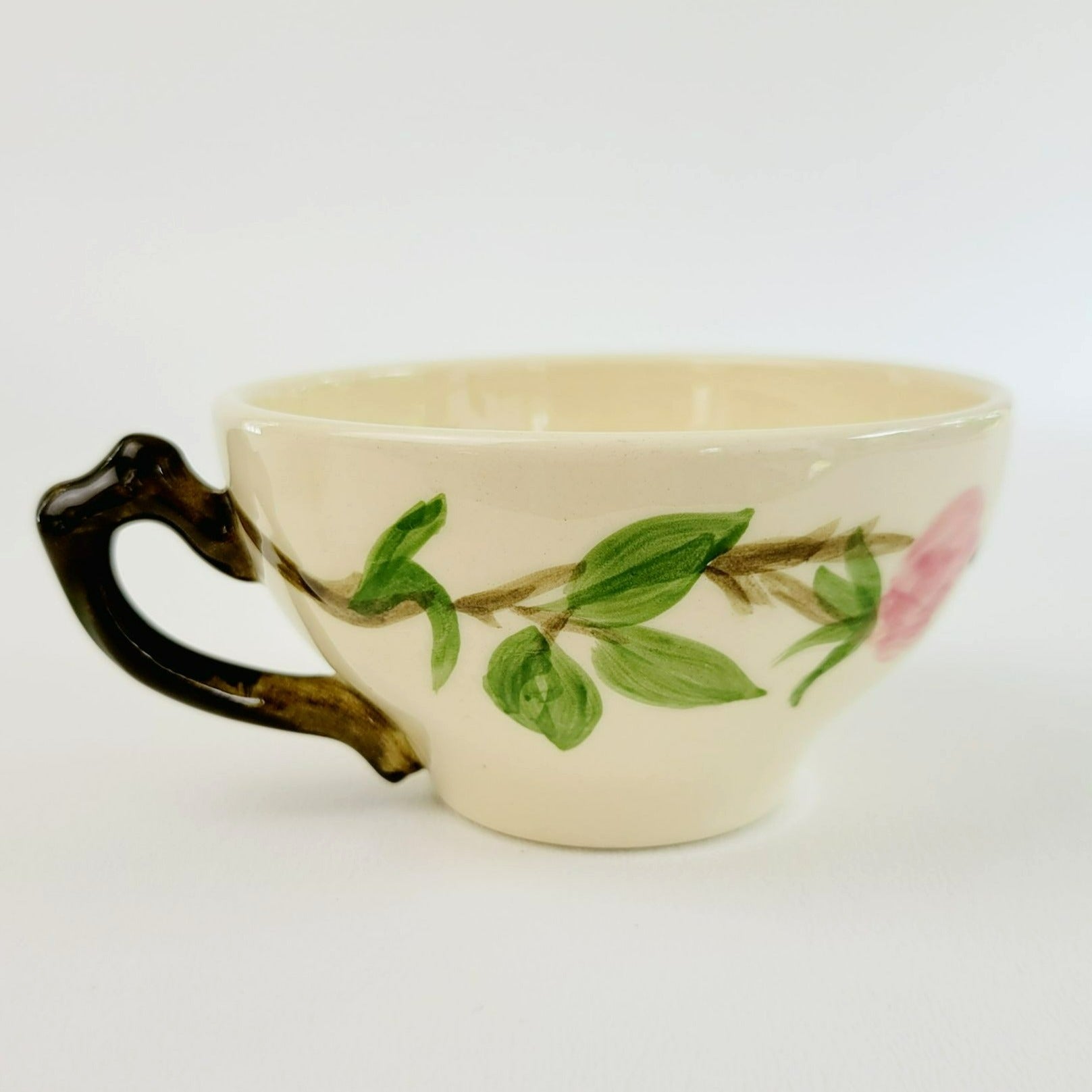 Desert Rose Cups by Franciscan with USA Back Stamp. Piece has a cream colored base and is embossed with pink flowers and green leaves.