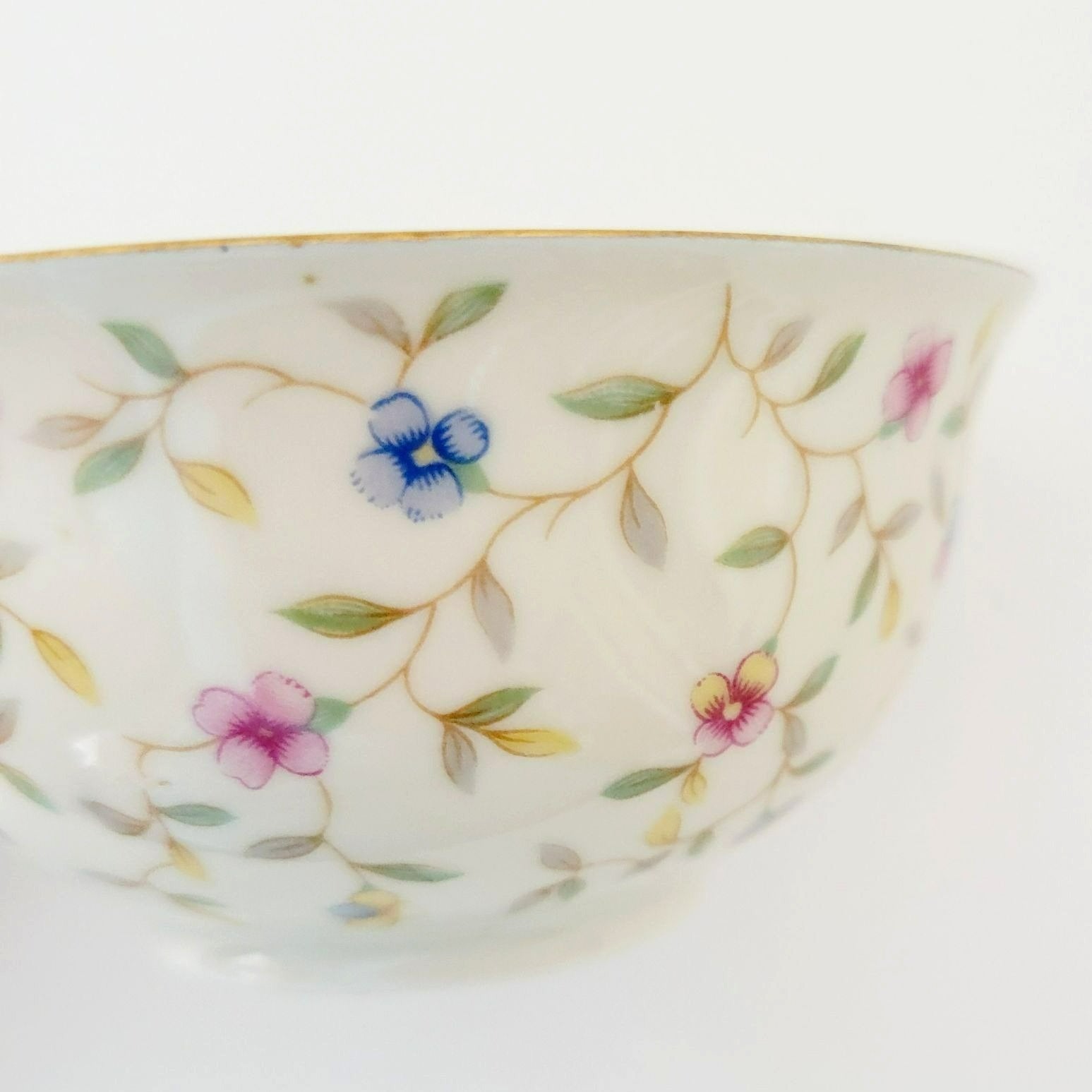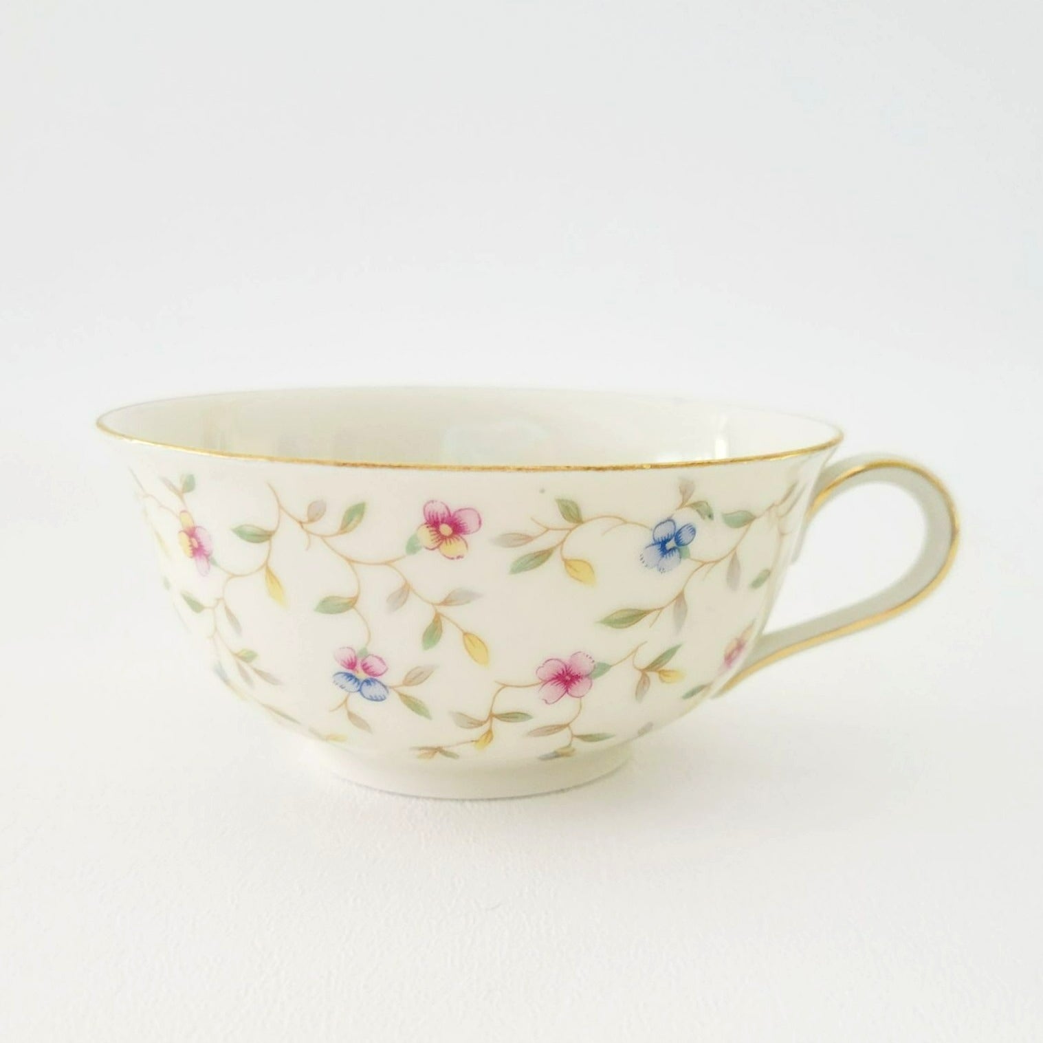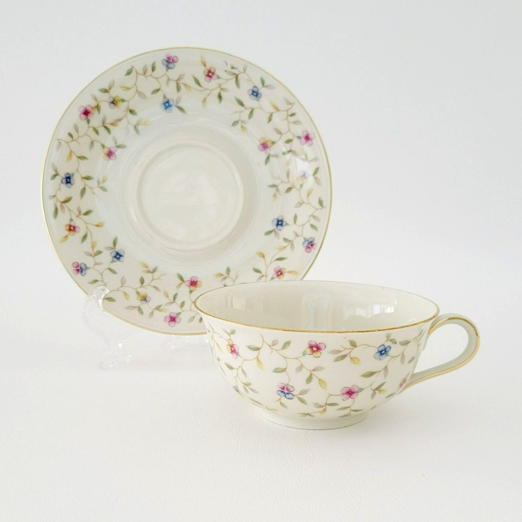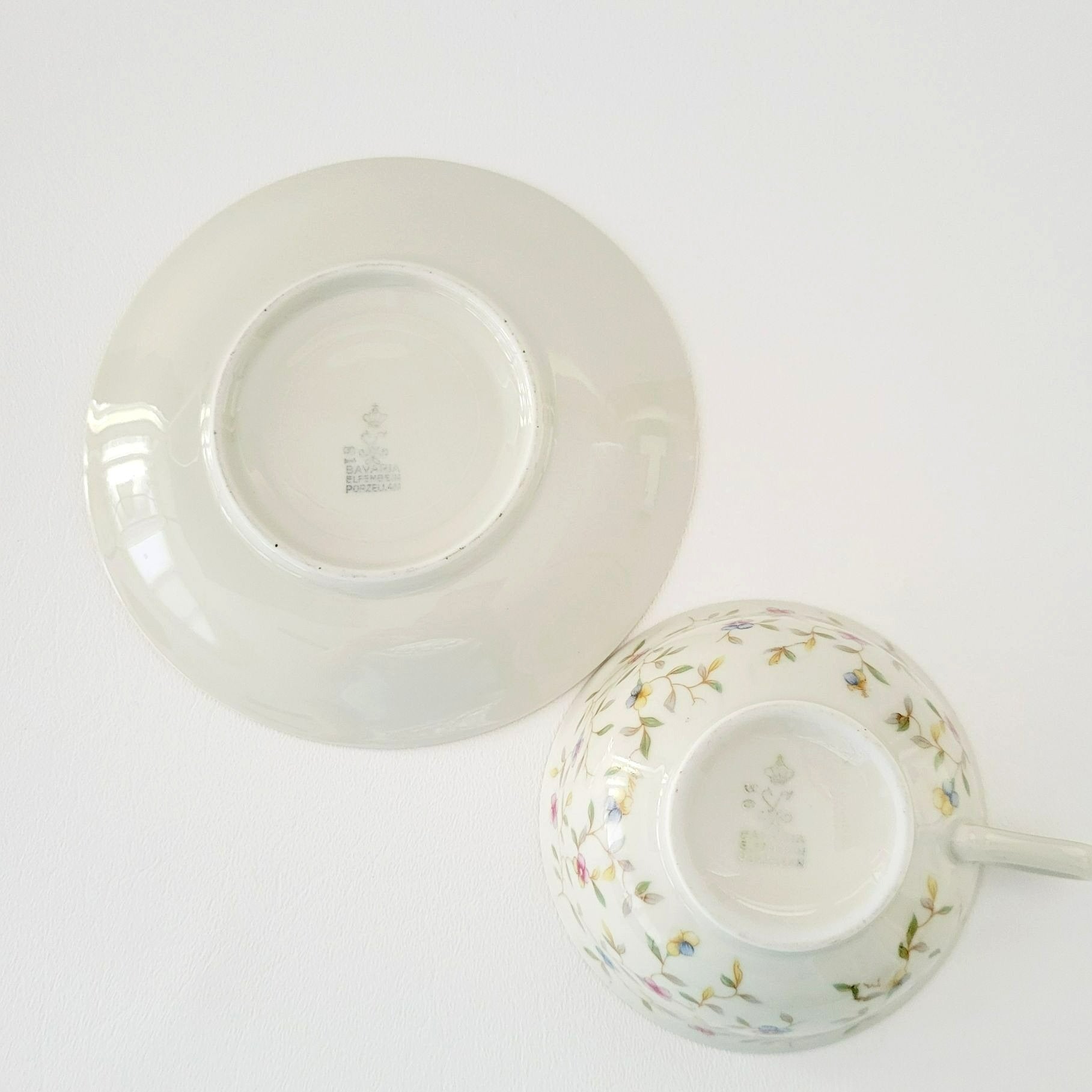 German Chintz Floral Teacup & Saucer, Cream with Pink & Blue Floral Design, Bavaria Elfenbein