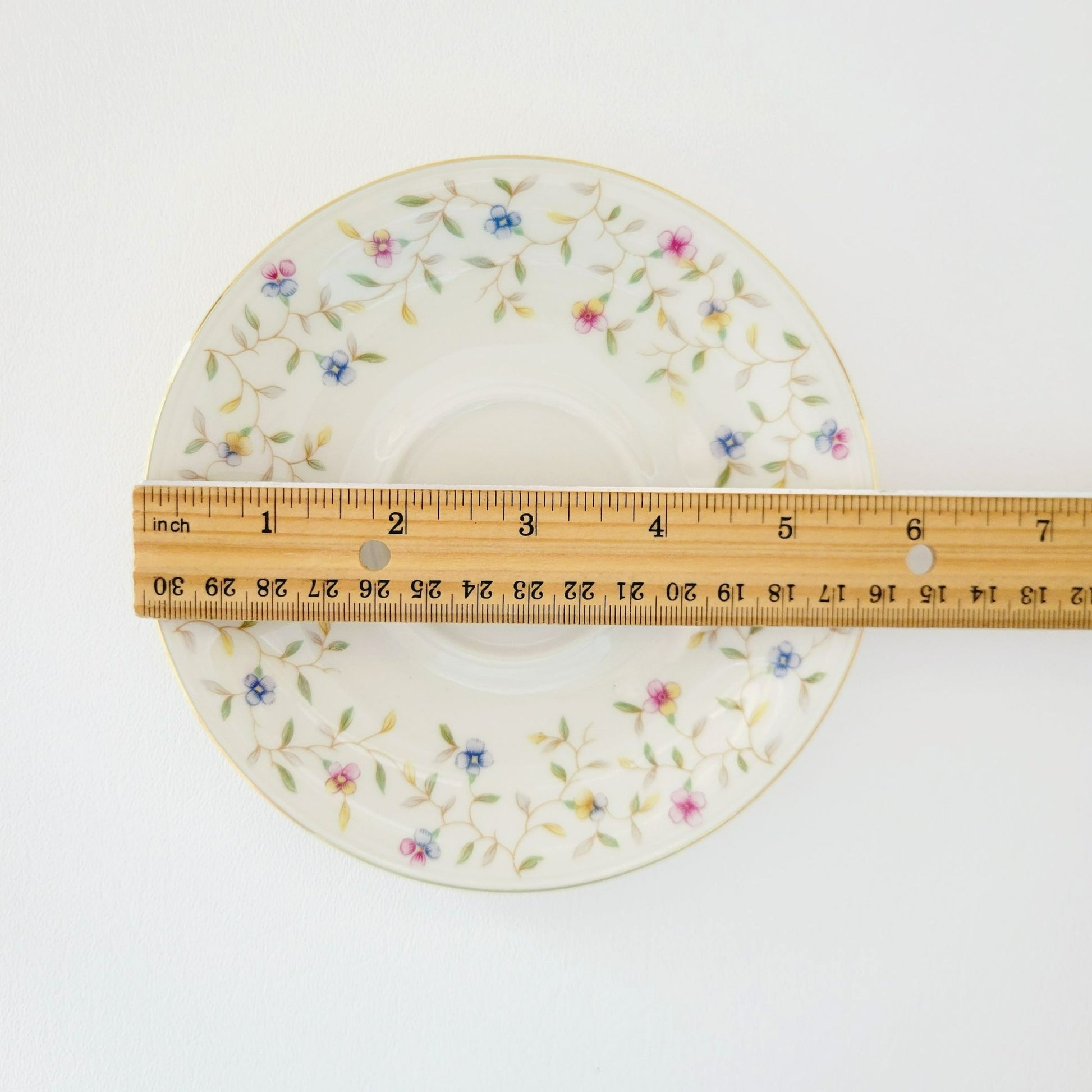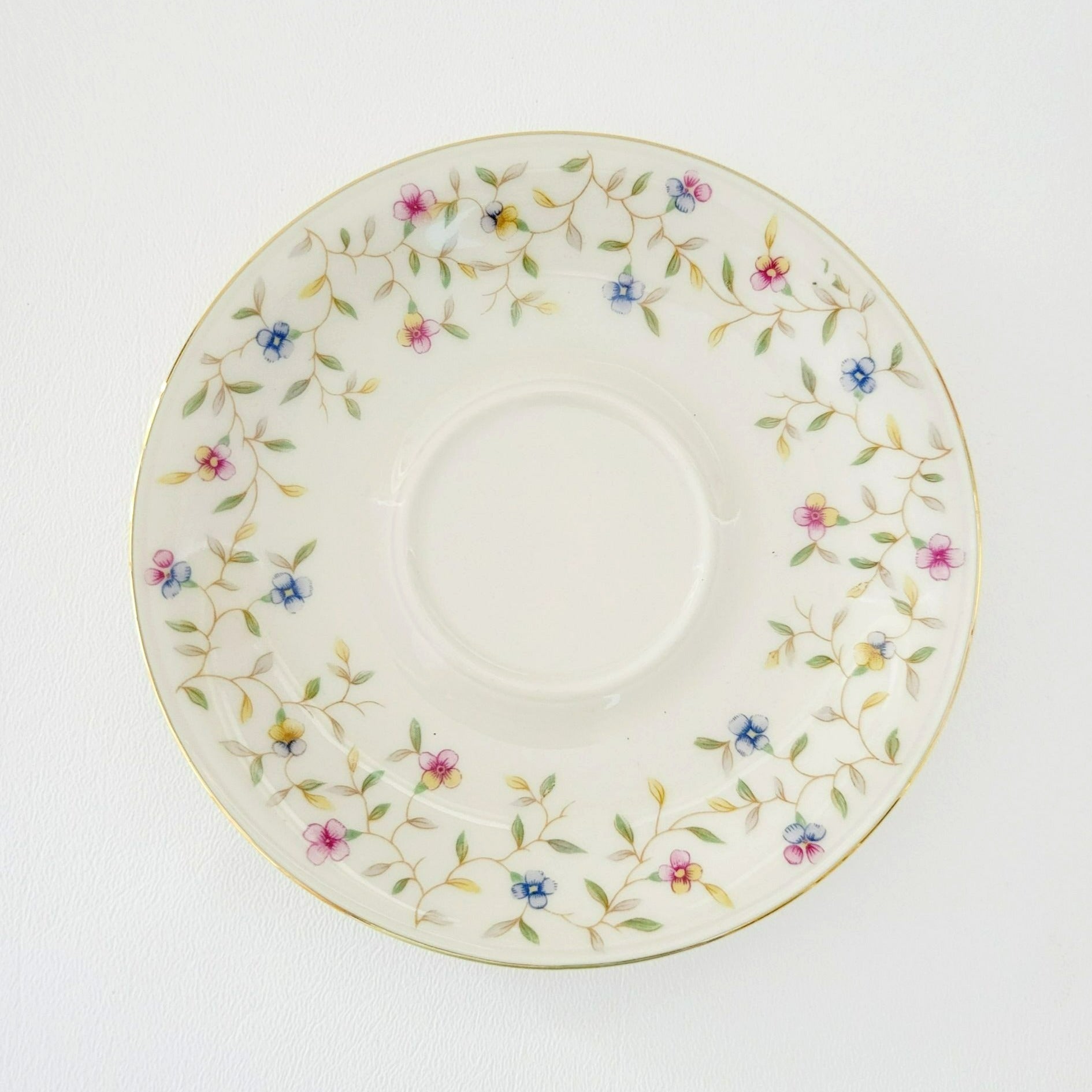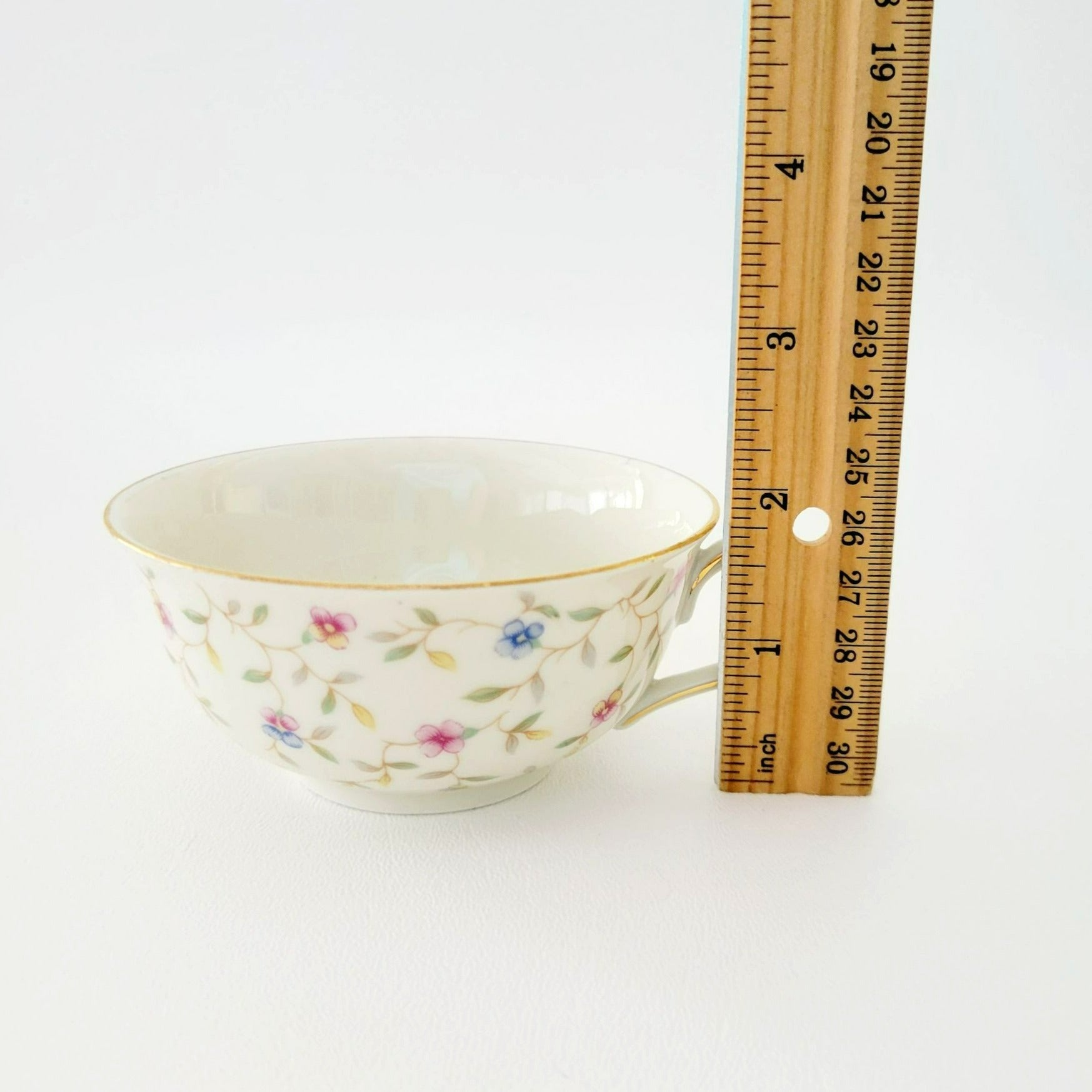 This Elfenbein Vintage Bavaria teacup and saucer set features a dainty chintz floral pattern in pink and blue hues, accentuated by a delicate gold trim. Made from fine German porcelain, it holds 6 fl. oz. of your favorite brew.